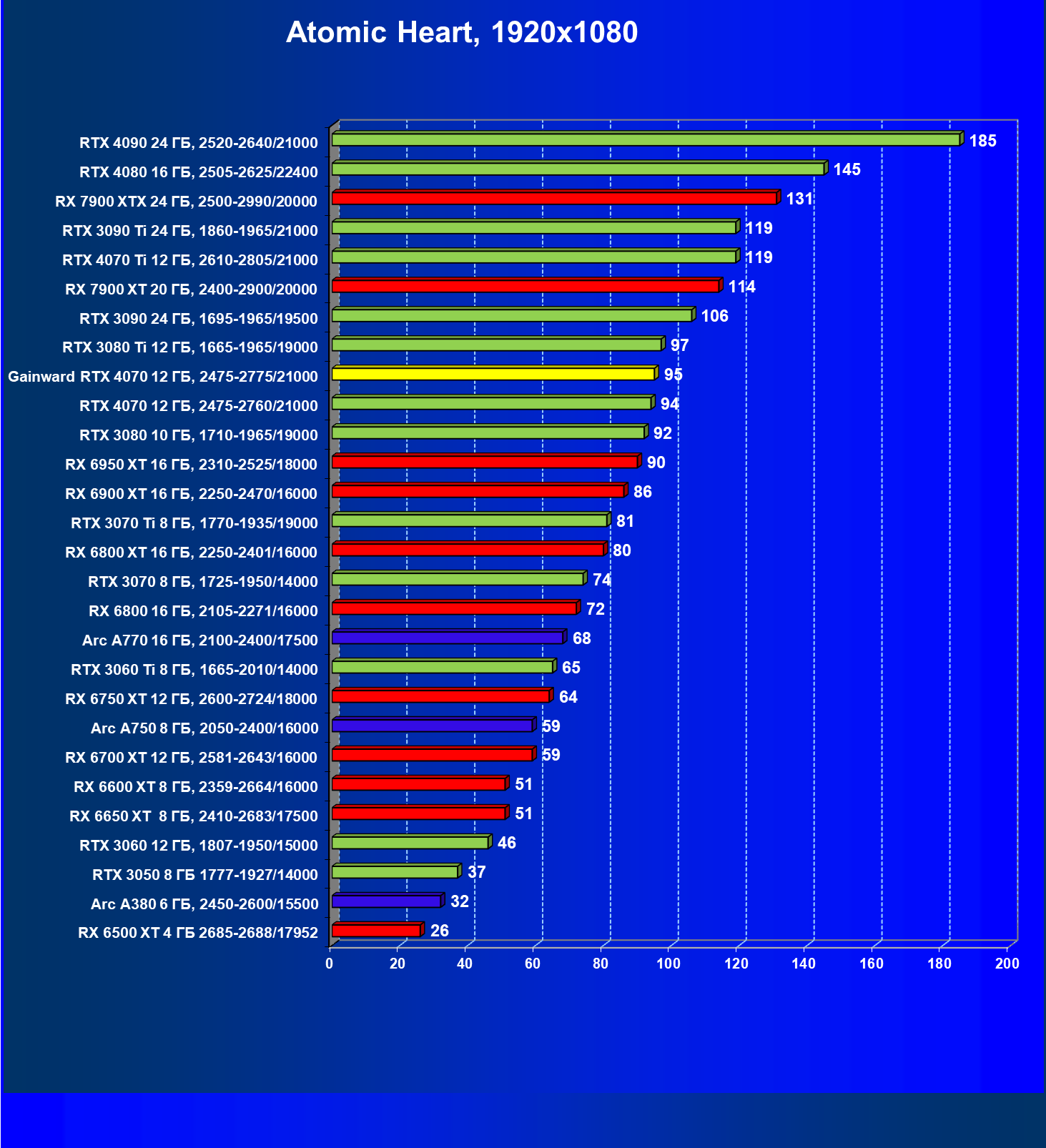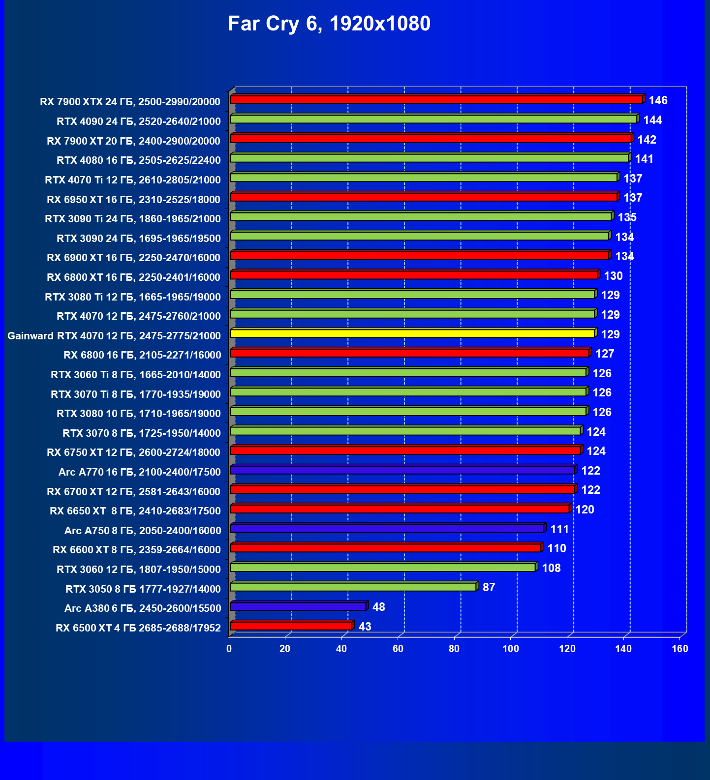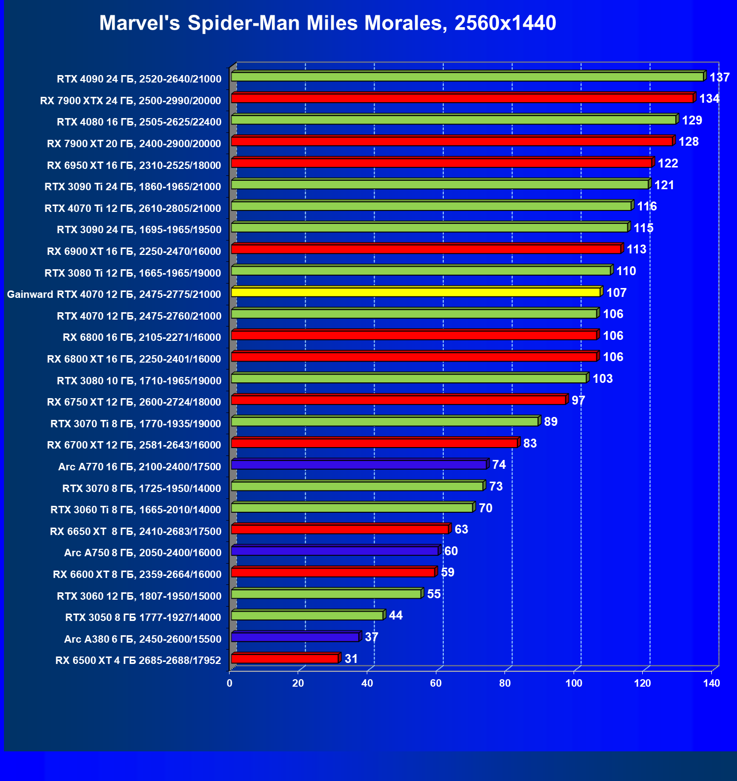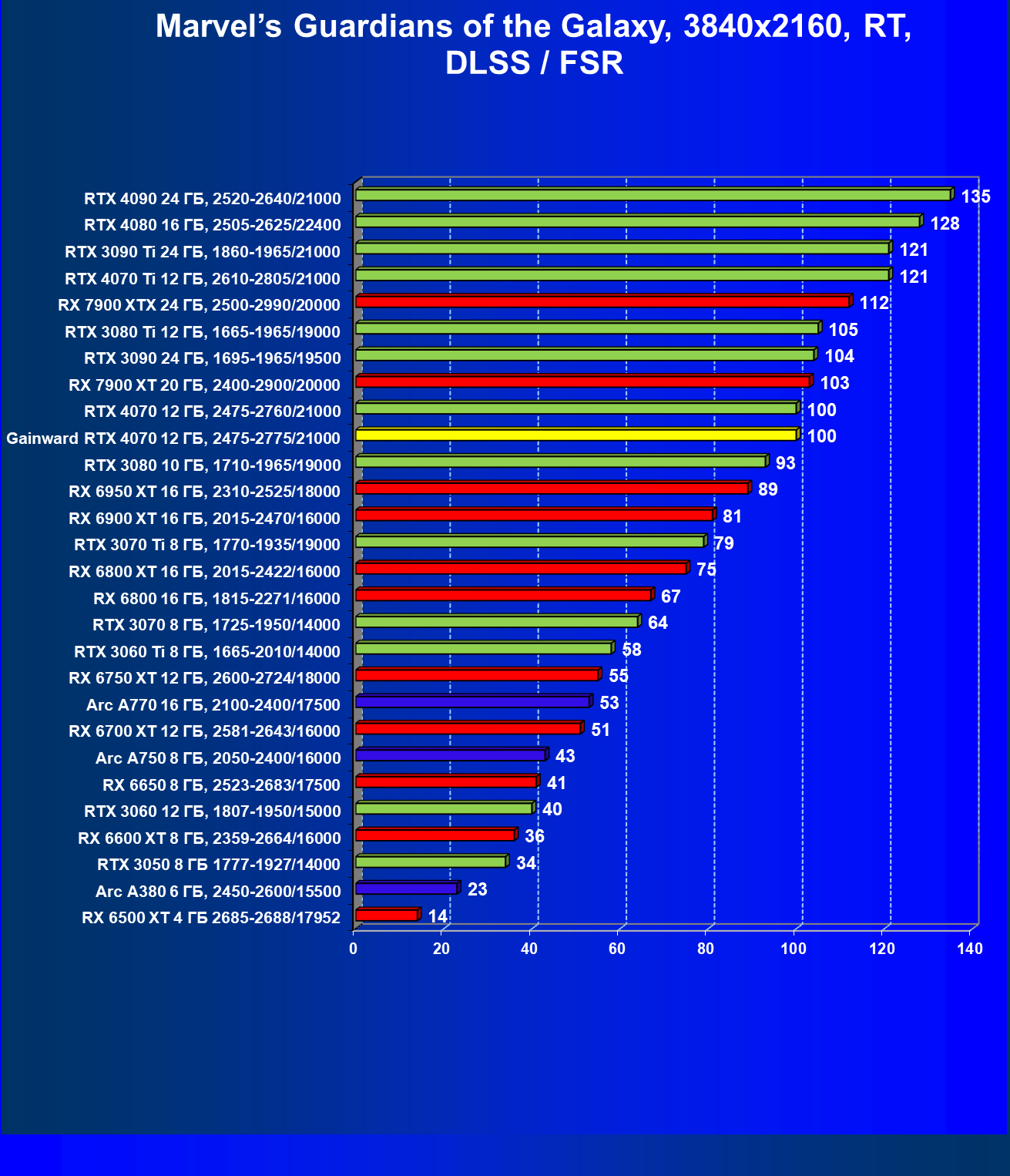 | 21 | RX 7900 XT 20 ГБ, 2400—2900/20000 | 92 | 792 | 86 000 |