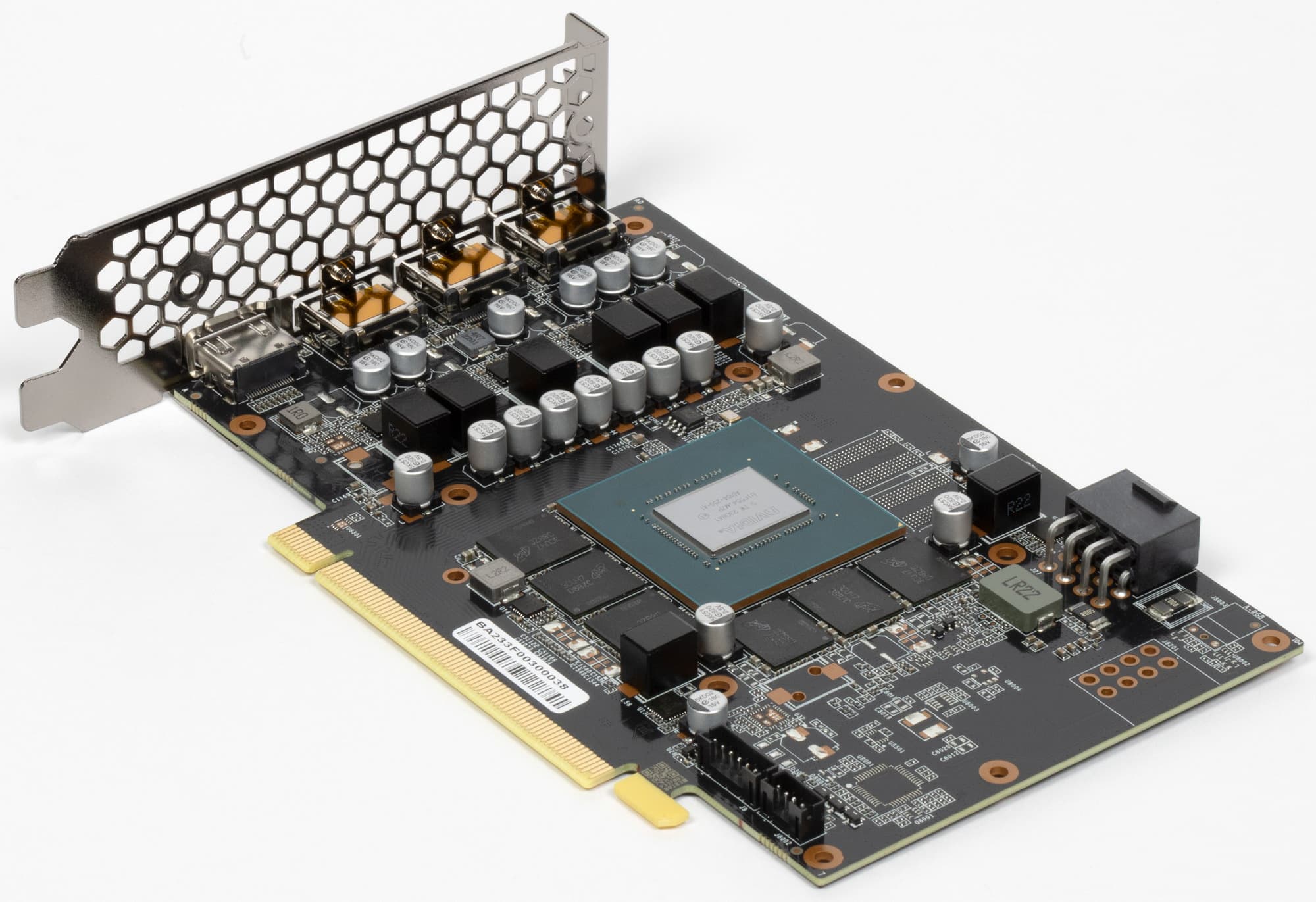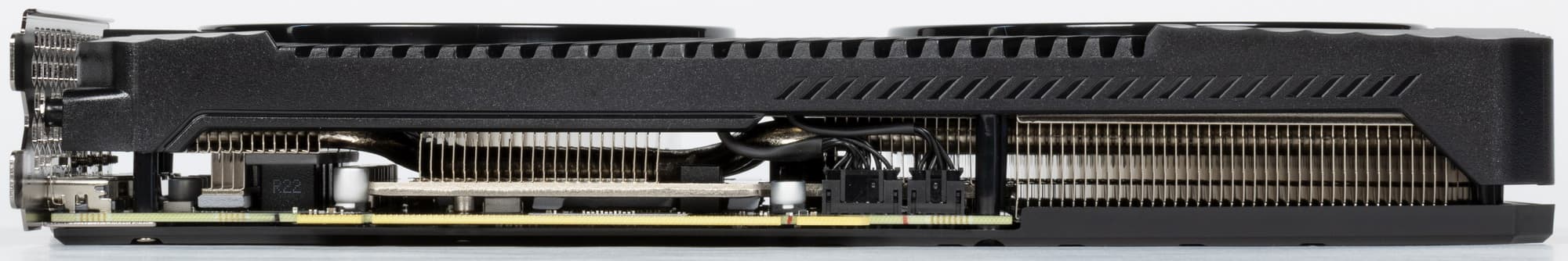 Сбоку справа на карте мы видим посадочные места, предназначенные для подключения мощных внешних вентиляторов в системах, использующих профессиональные версии подобных видеокарт (для игровых и профессиональных видеокарт используются одни и те же GPU, разница может быть лишь в объеме памяти, конфигурации рабочих блоков и, конечно же, в программном обеспечении).
