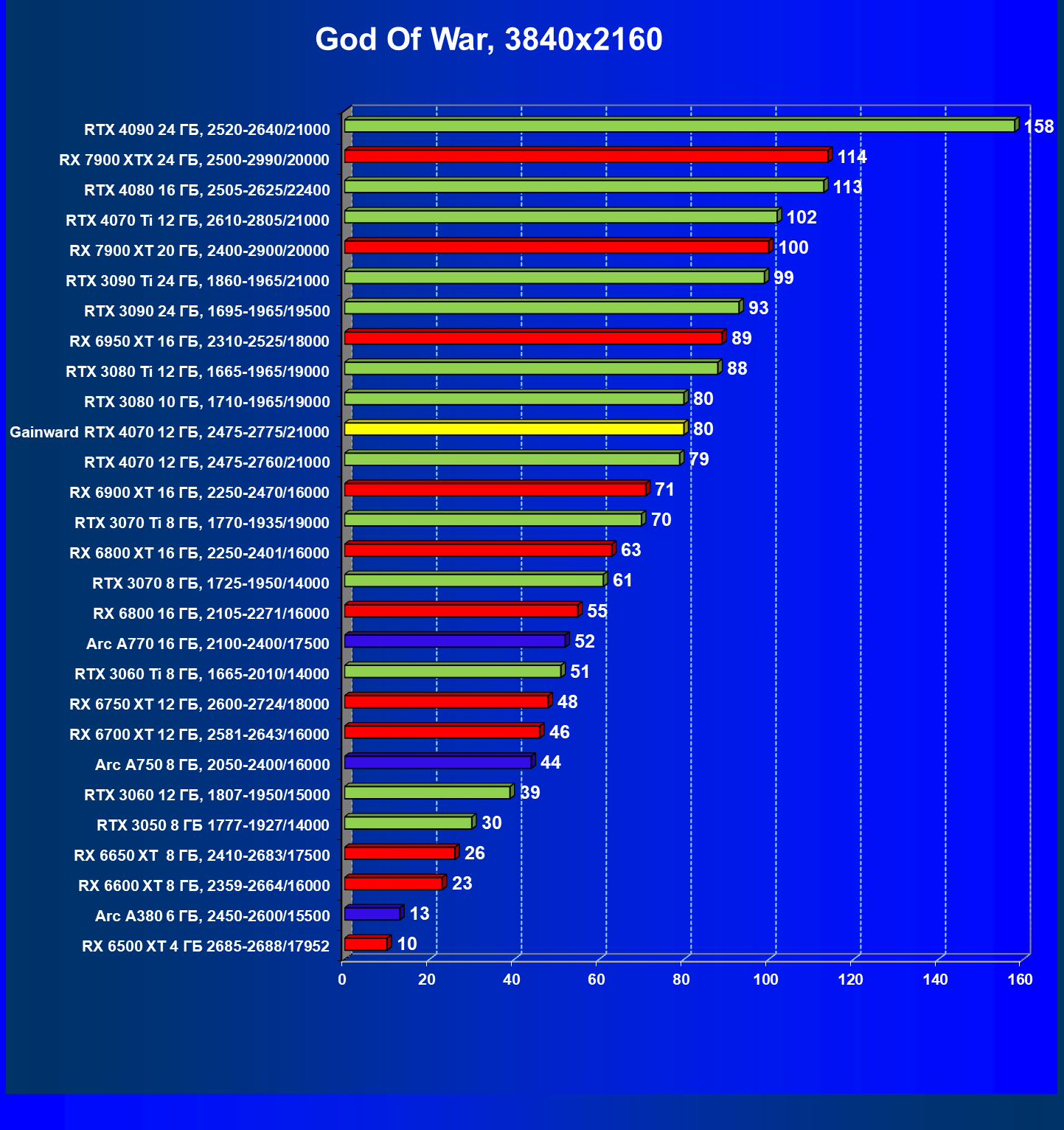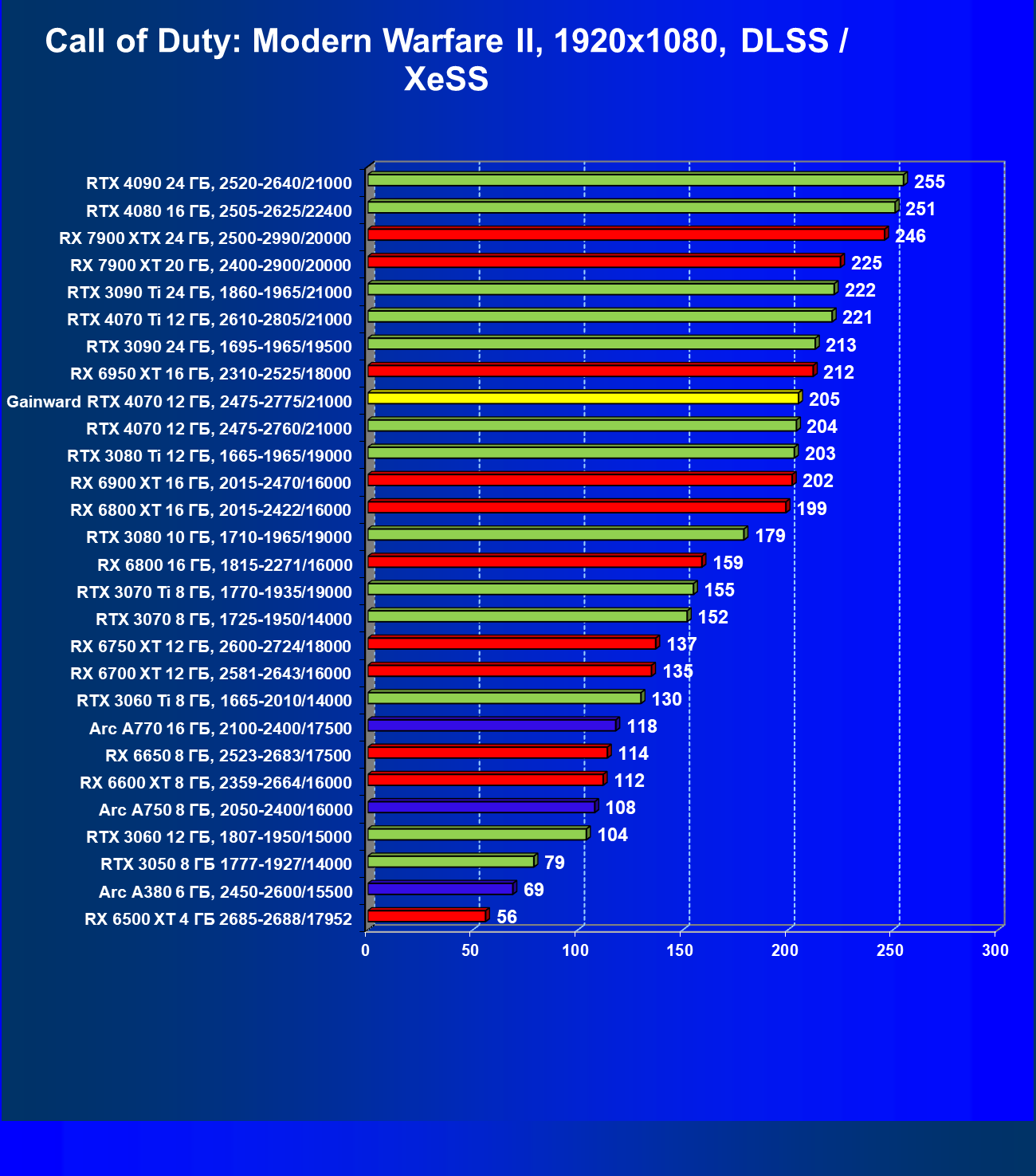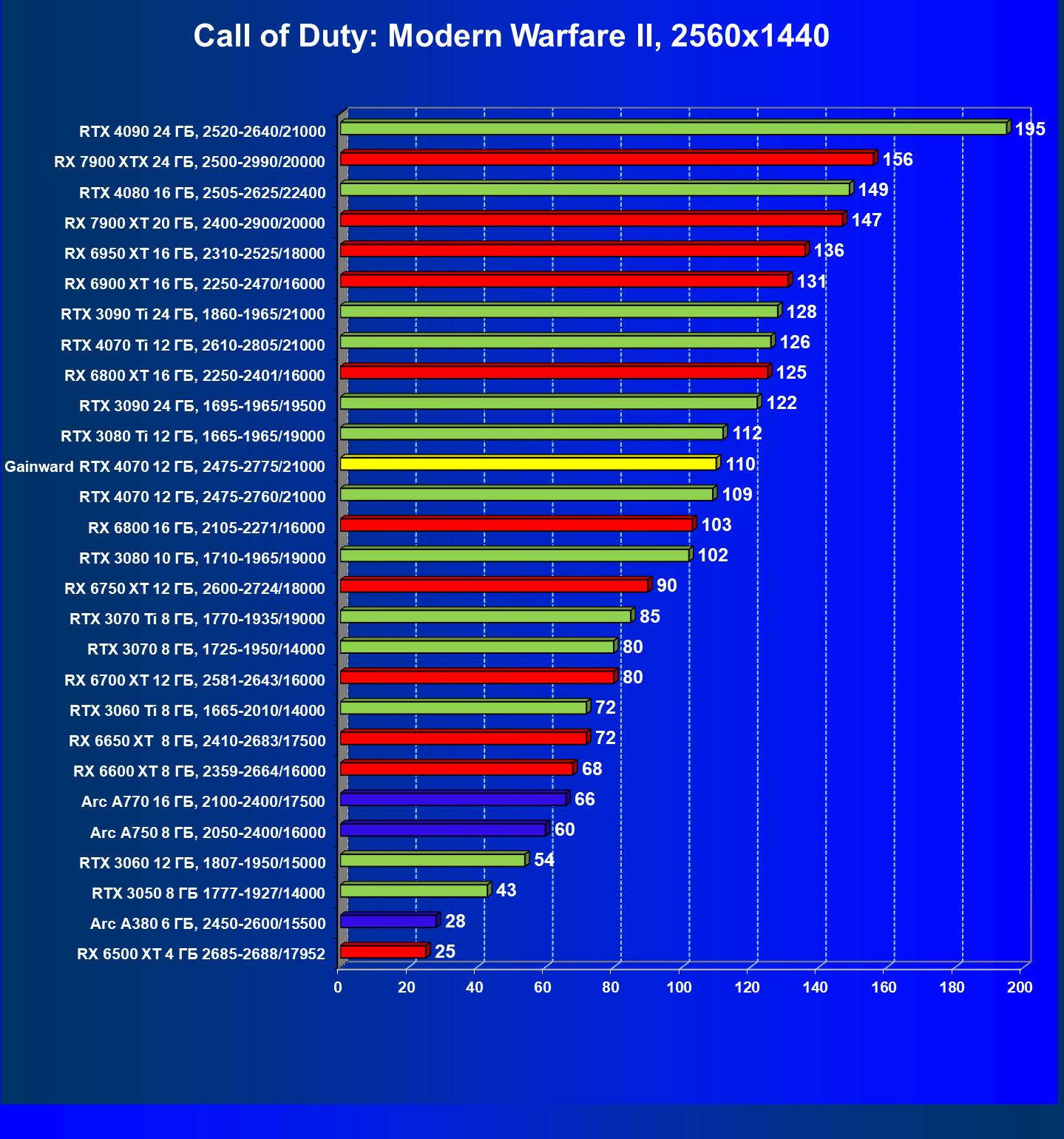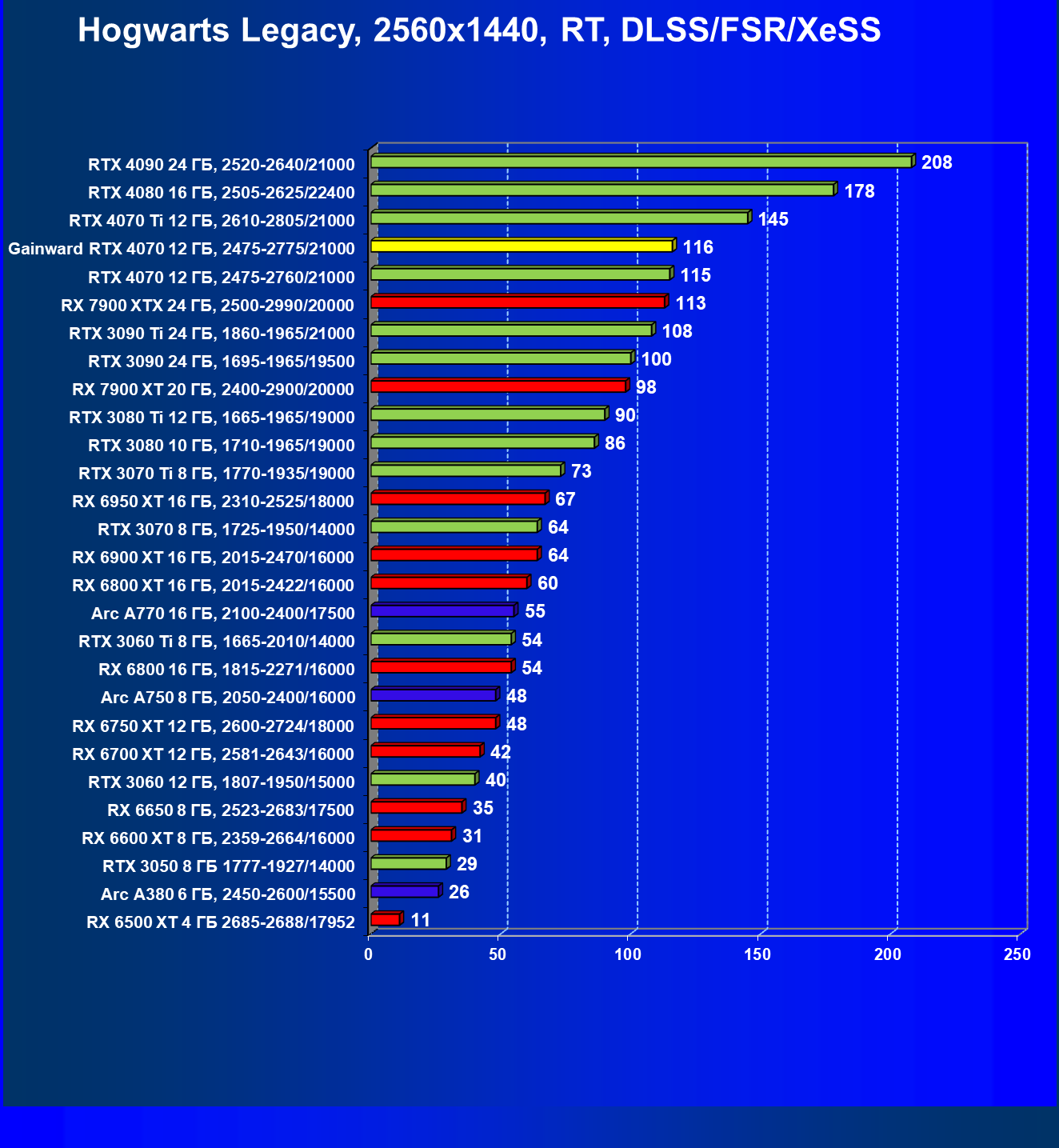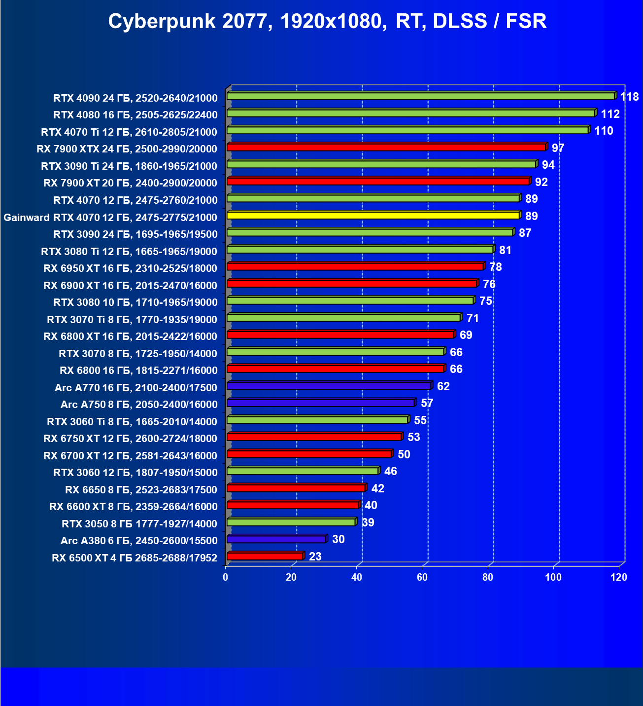 | 09 | Gainward RTX 4070 Ghost 12 ГБ, 2475—2775/21000 | 116 | 737 | 63 500 |