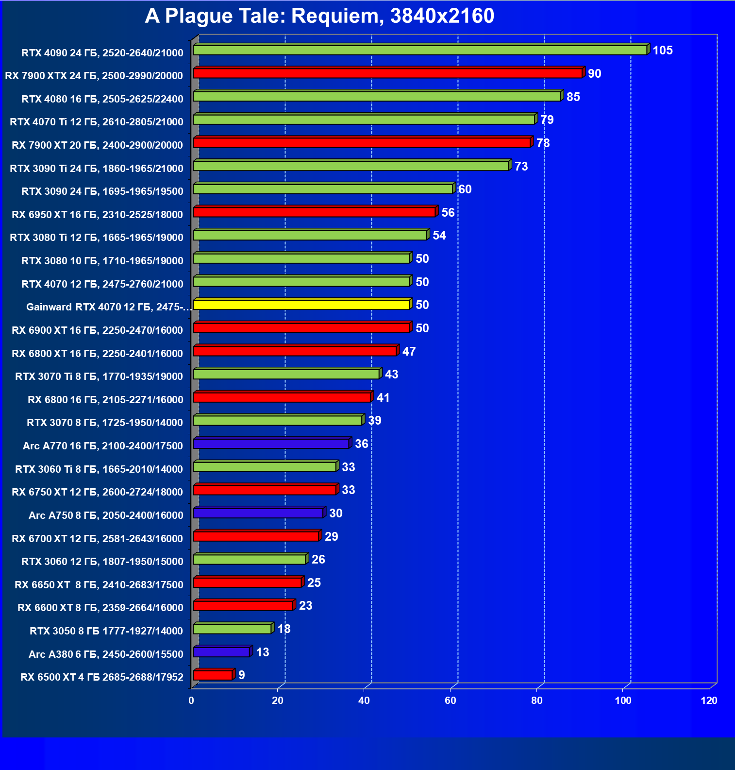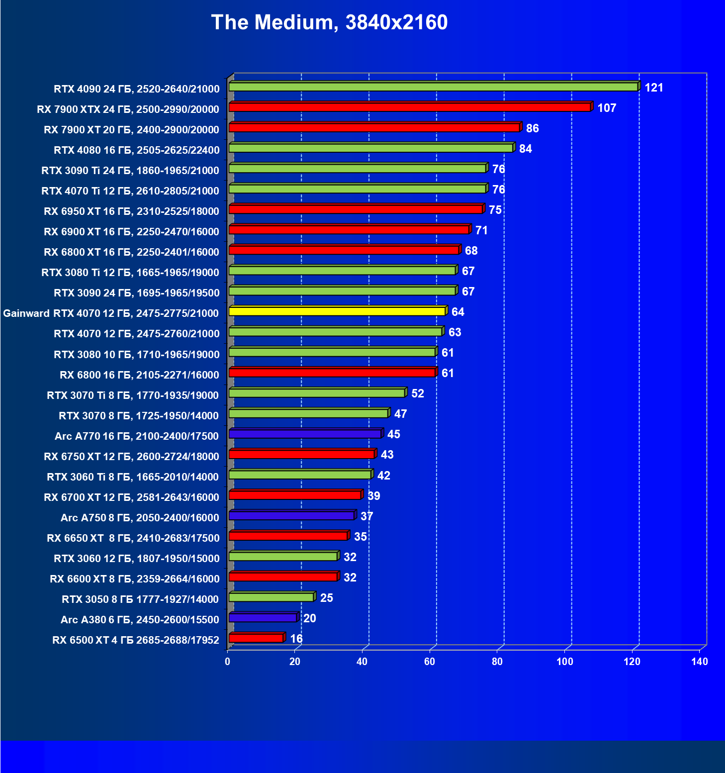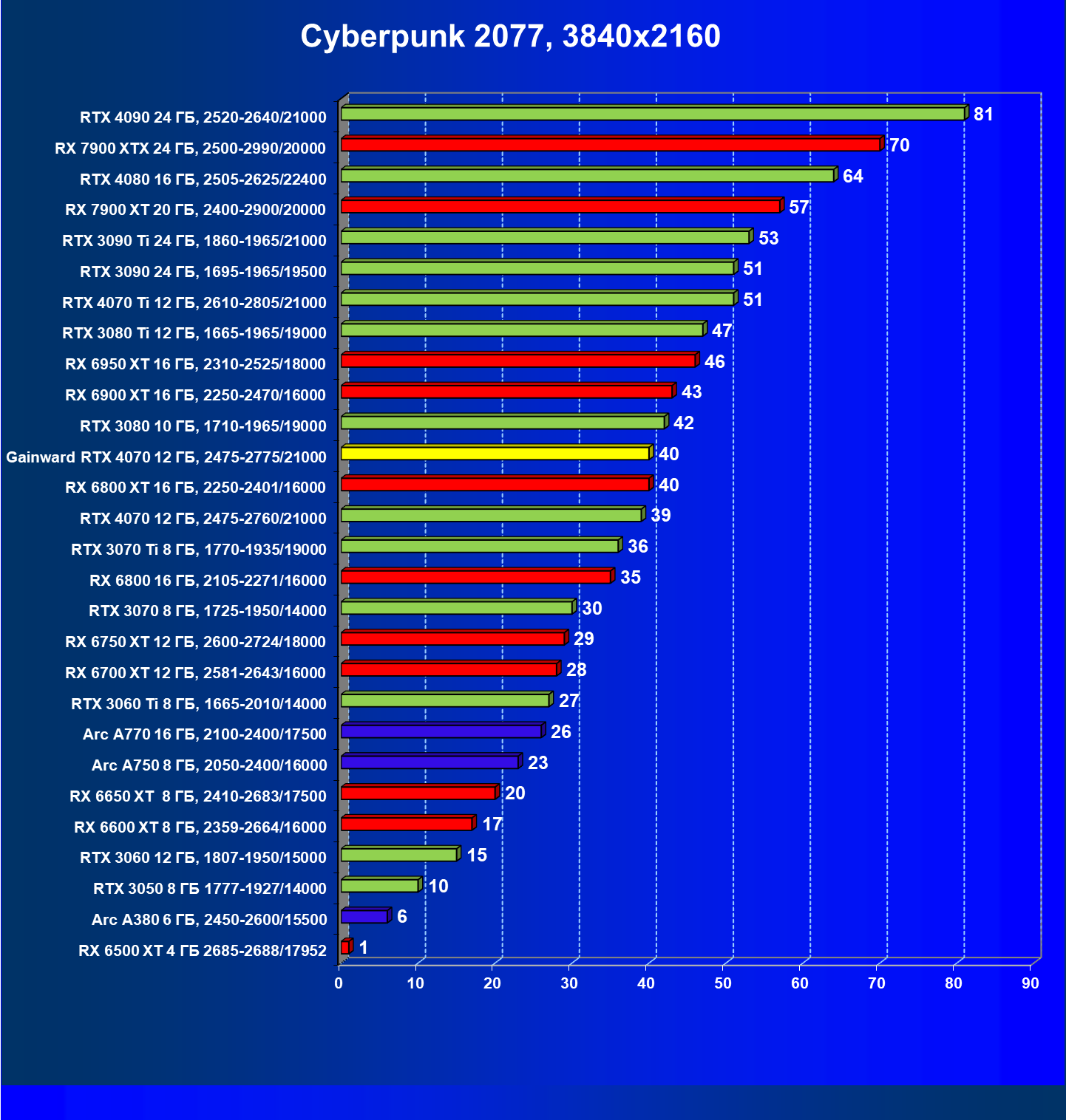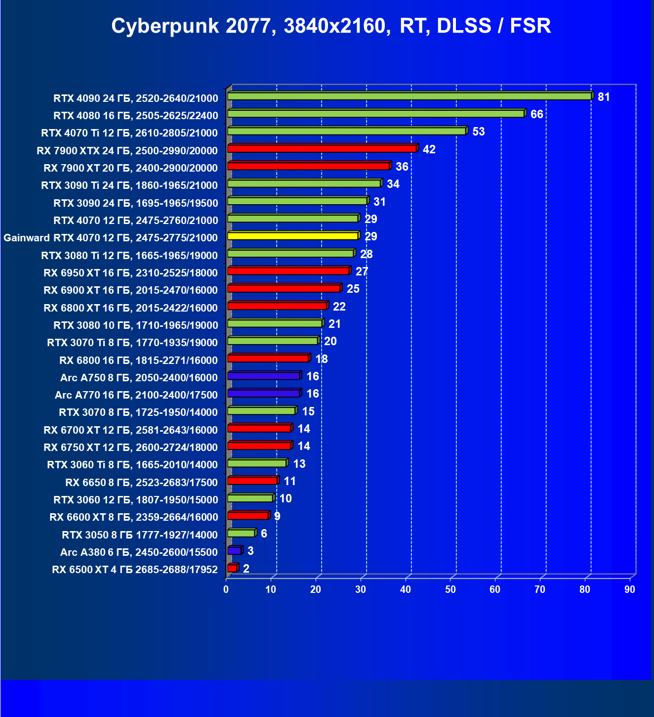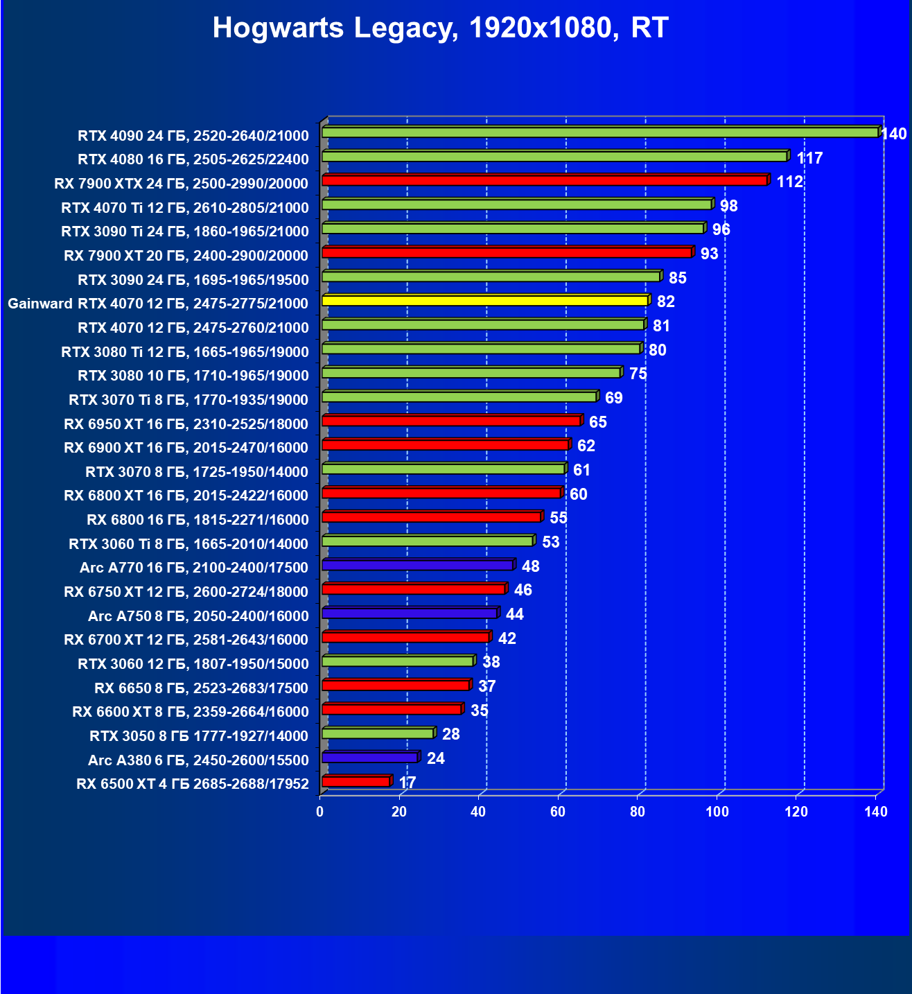 | 17 | Gainward RTX 4070 Ghost 12 ГБ, 2475—2775/21000 | 72 | 457 | 63 500 |
