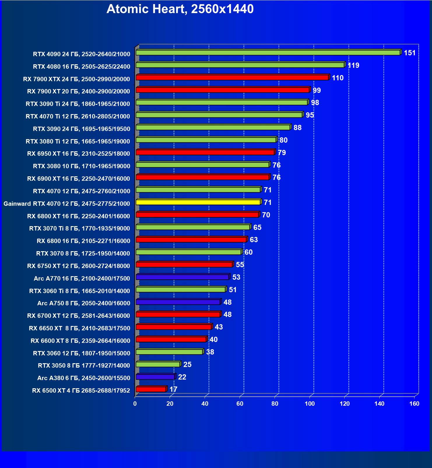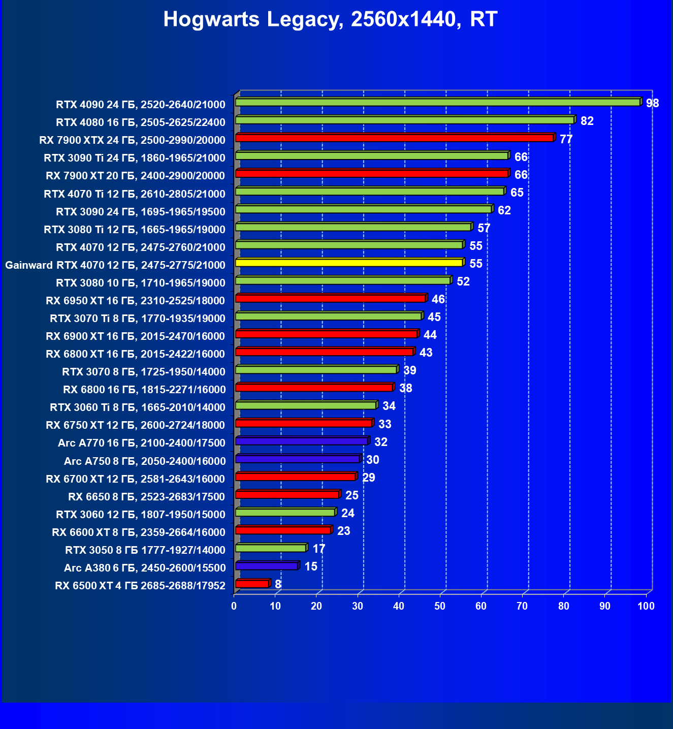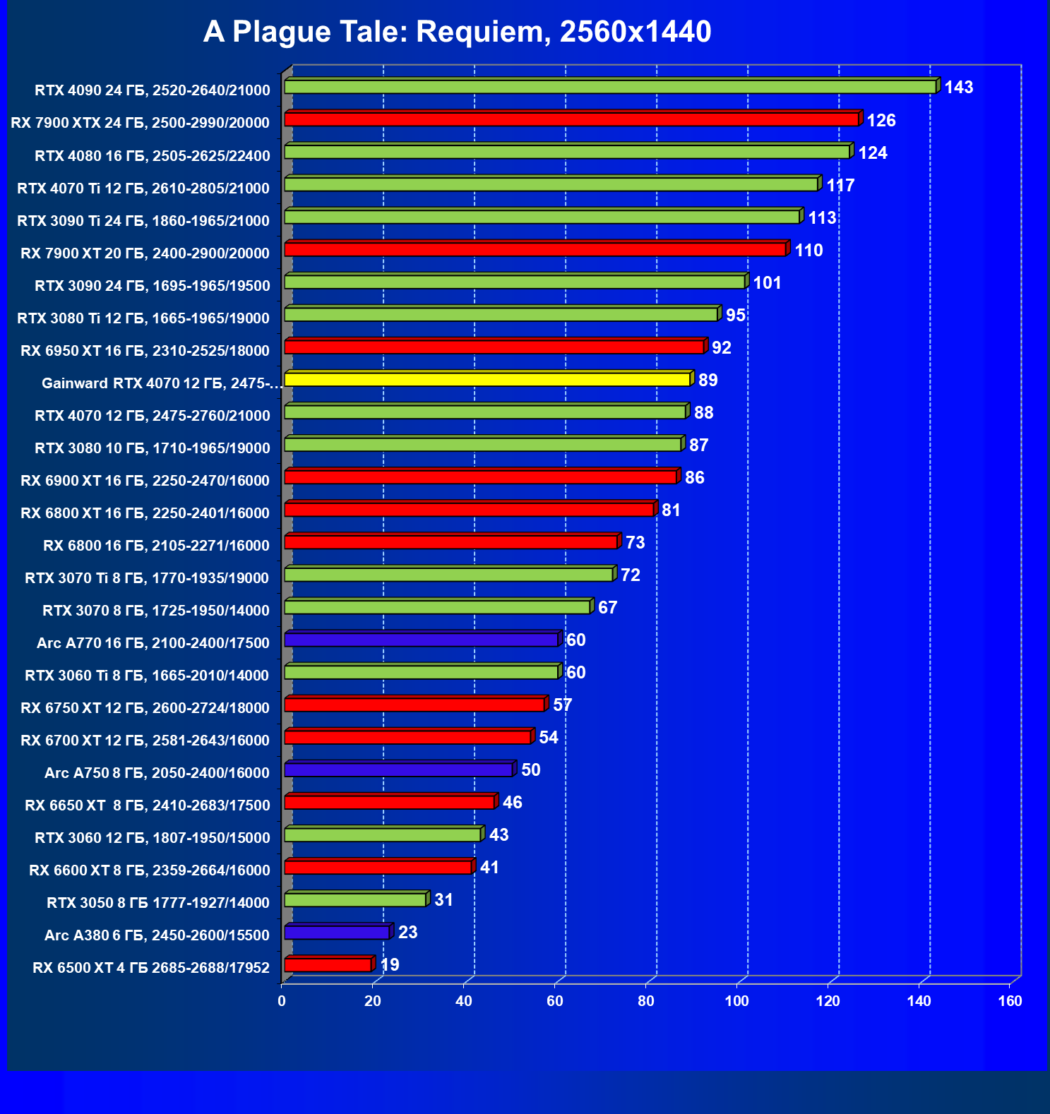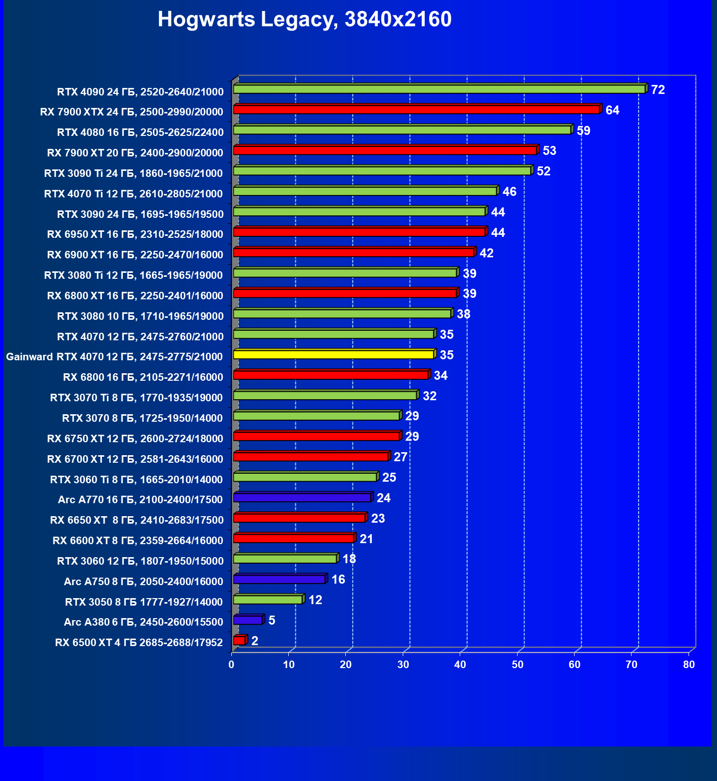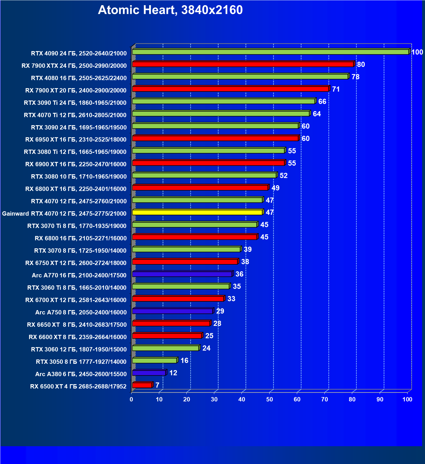 | 17 | Gainward RTX 4070 Ghost 12 ГБ, 2475—2775/21000 | 72 | 457 | 63 500 |