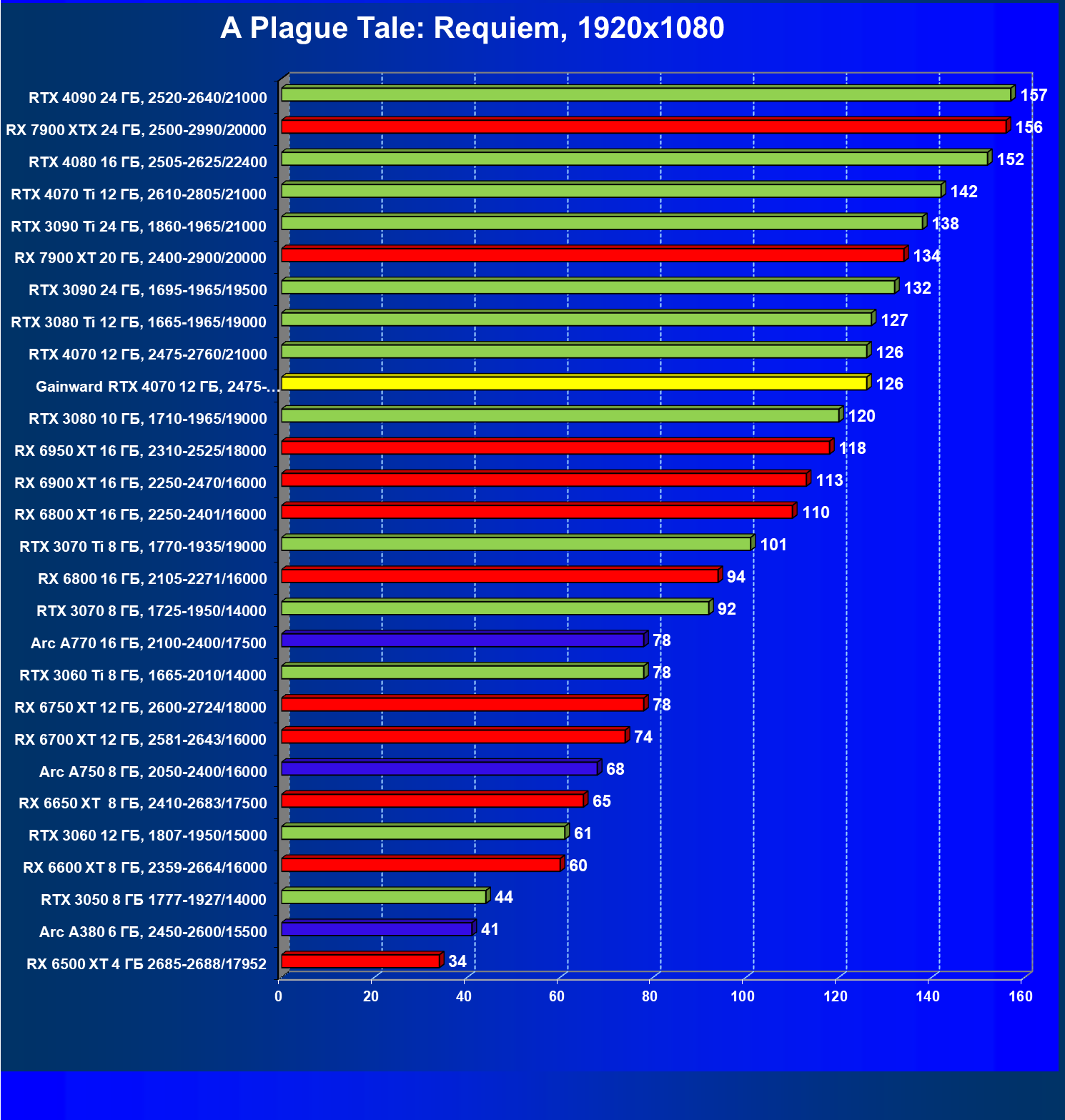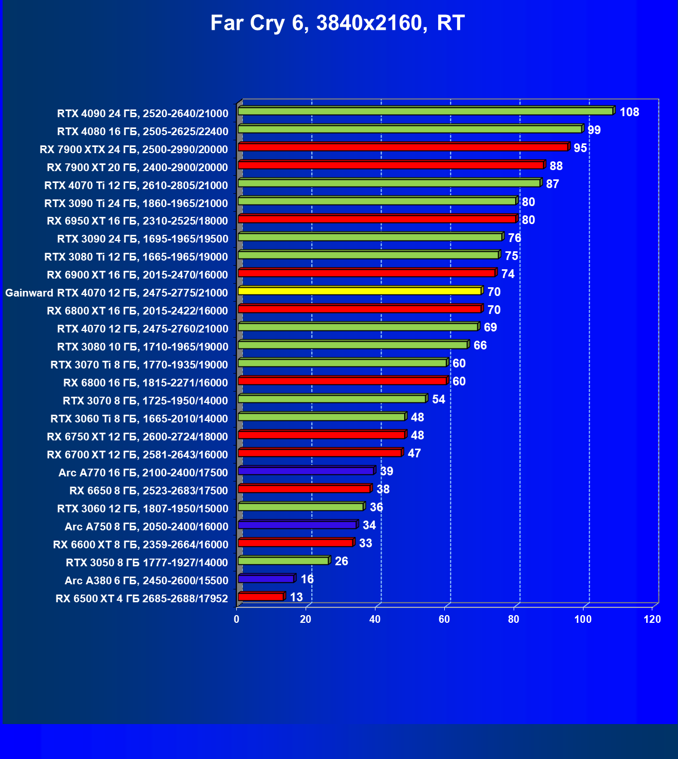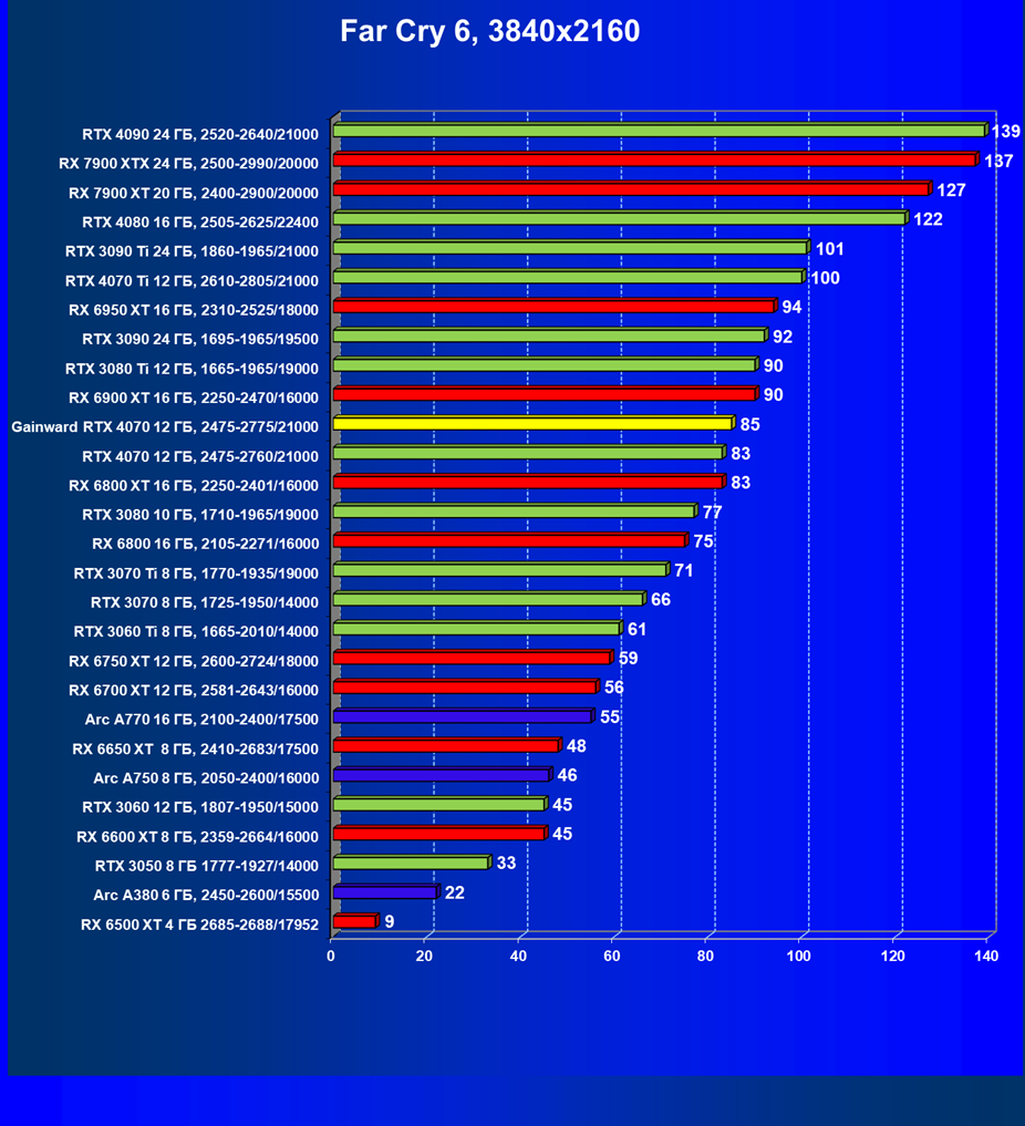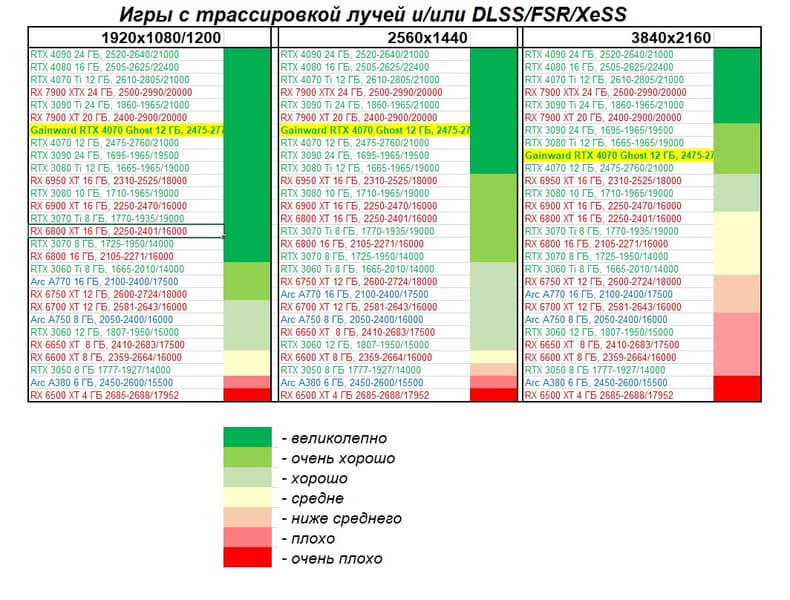Прекрасно видно, что в целом в классических играх GeForce RTX 4070 идет наравне с GeForce RTX 3080 (10 ГБ) и даже чуть быстрее, а производительность карты Gainward фактически равна референсным значениям GeForce RTX 4070. Также очевидно, что Radeon RX 6800 XT по производительности и цене находится рядом с нами обозреваемой, а вот чуть более дорогой конкурент Radeon RX 6900 XT демонстрирует в играх без трассировки лучей бо́льшую производительность.