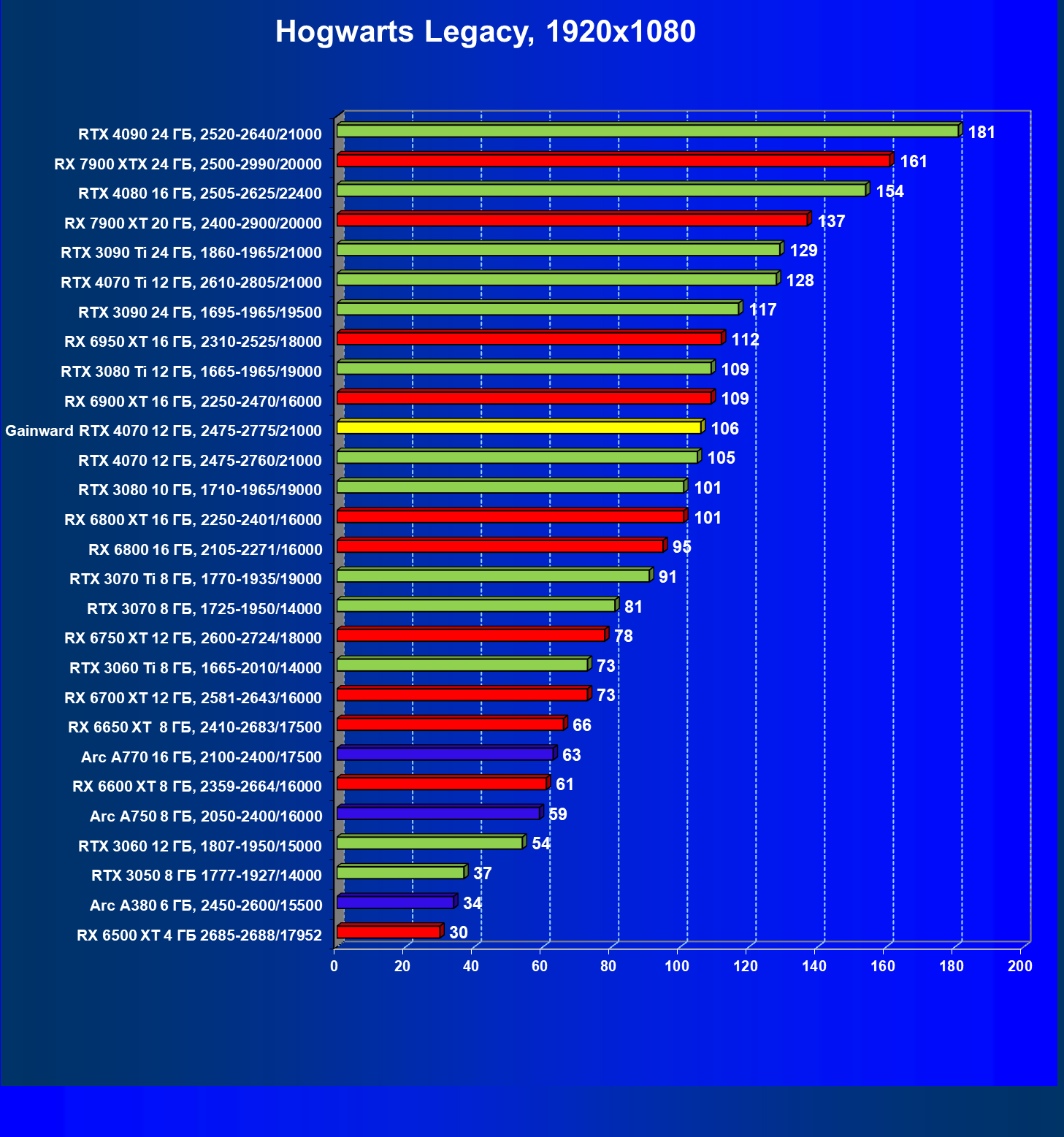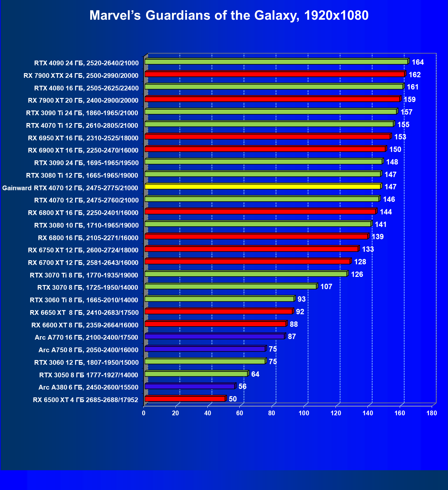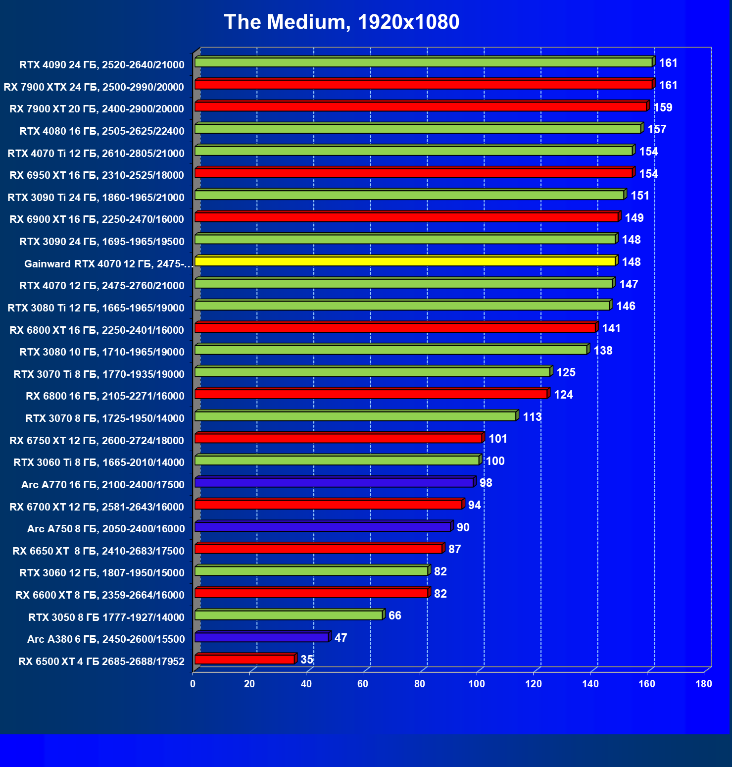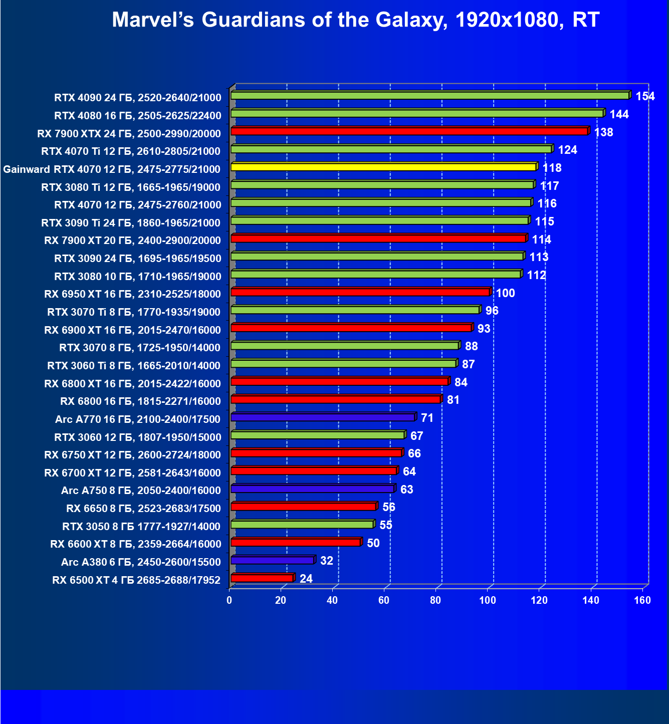 Прекрасно видно, что в целом в классических играх GeForce RTX 4070 идет наравне с GeForce RTX 3080 (10 ГБ) и даже чуть быстрее, а производительность карты Gainward фактически равна референсным значениям GeForce RTX 4070. Также очевидно, что Radeon RX 6800 XT по производительности и цене находится рядом с нами обозреваемой, а вот чуть более дорогой конкурент Radeon RX 6900 XT демонстрирует в играх без трассировки лучей бо́льшую производительность.