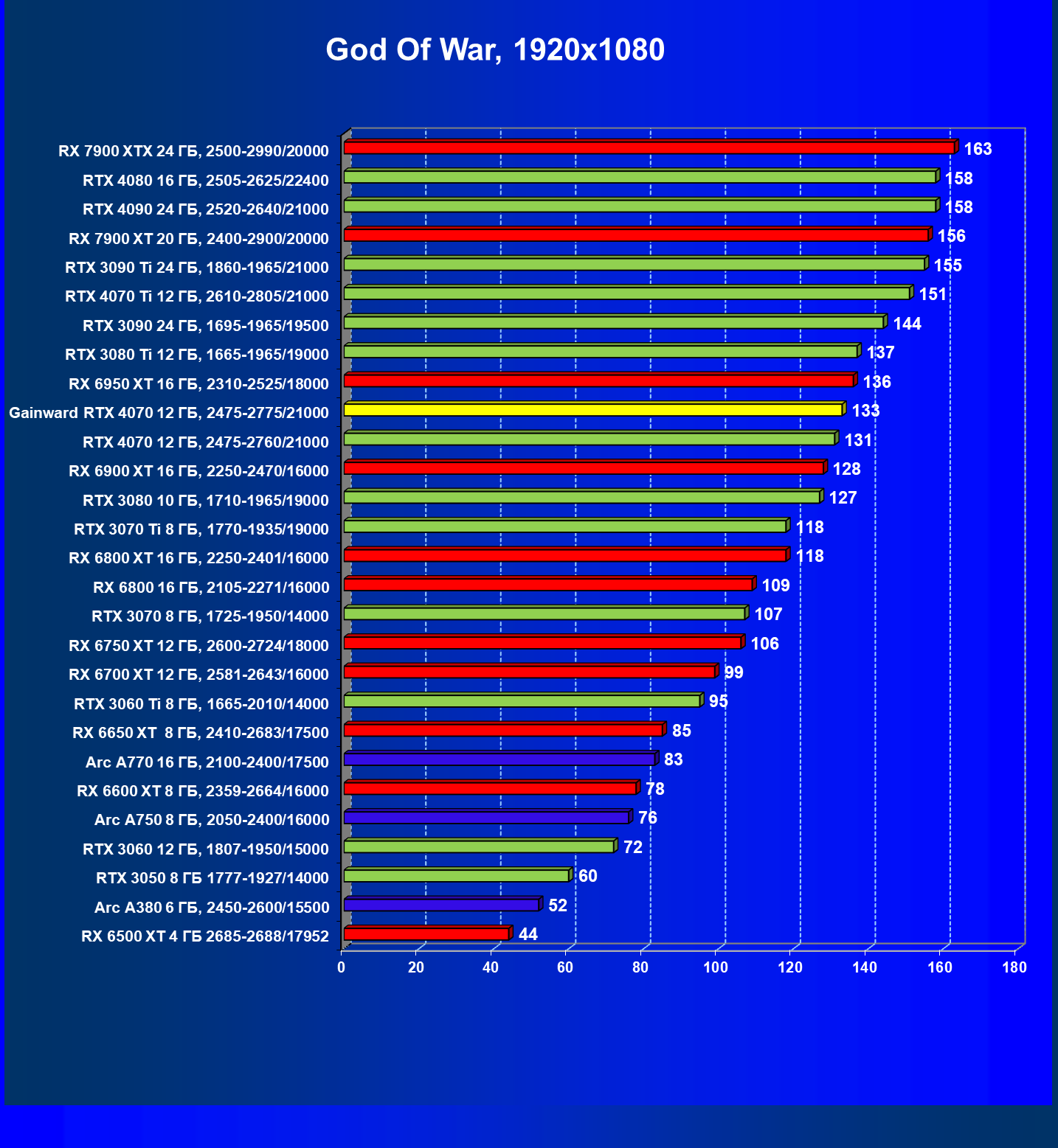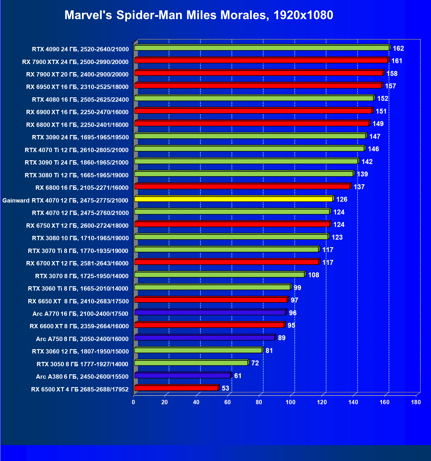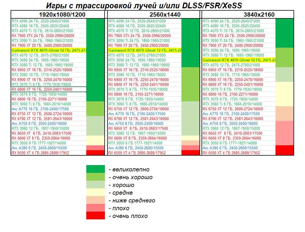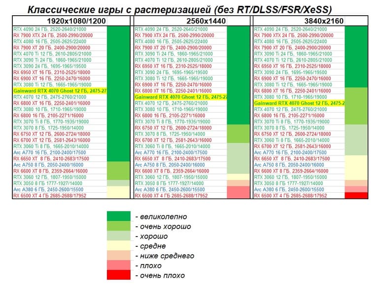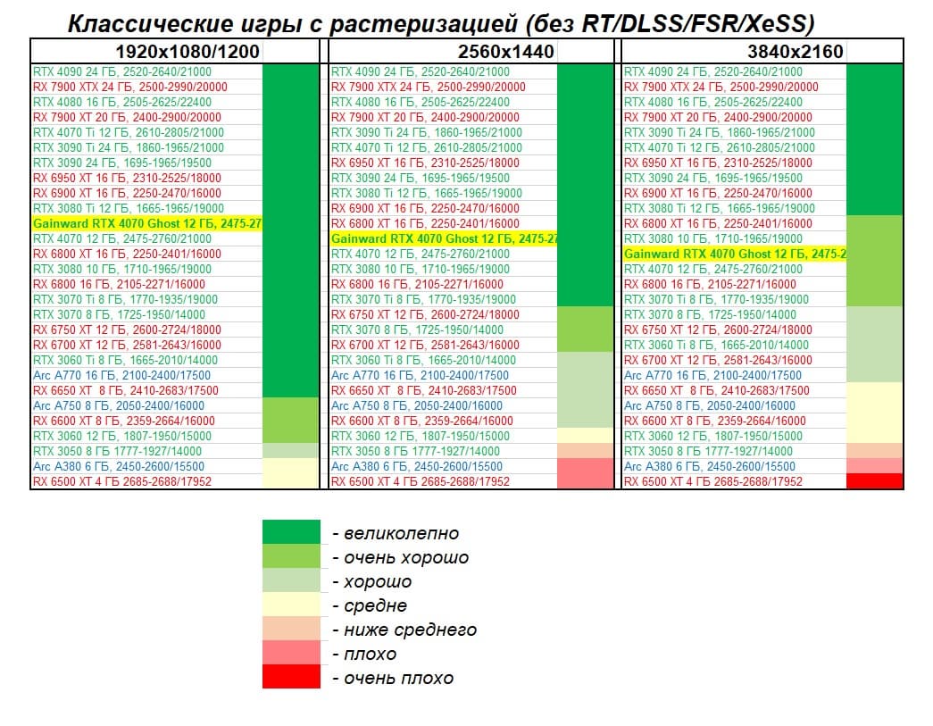 | 08 | Gainward RTX 4070 Ghost 12 ГБ, 2475—2775/21000 | 737 | 116 | 63 500 |
