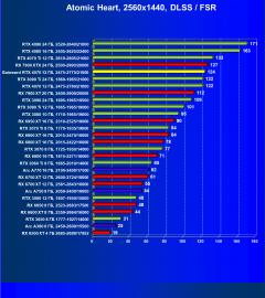 Мы видим, что в своей группе обозреваемая карта в играх с включением RT и DLSS благодаря новой архитектуре поддерживающая версию DLSS 3.0 демонстрирует нам безусловное лидерство и свое превосходство по отношению к более дорогим картам конкурентам из серии AMD.