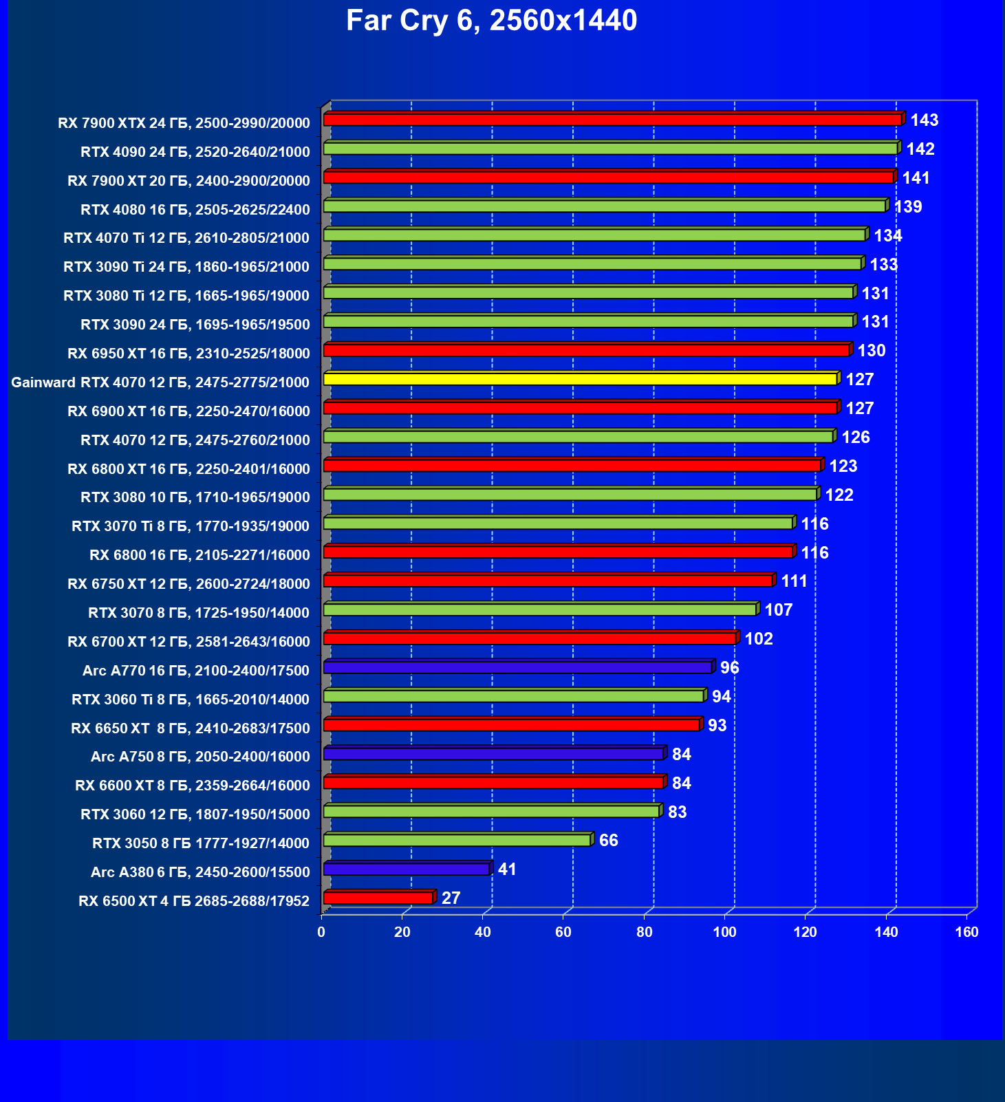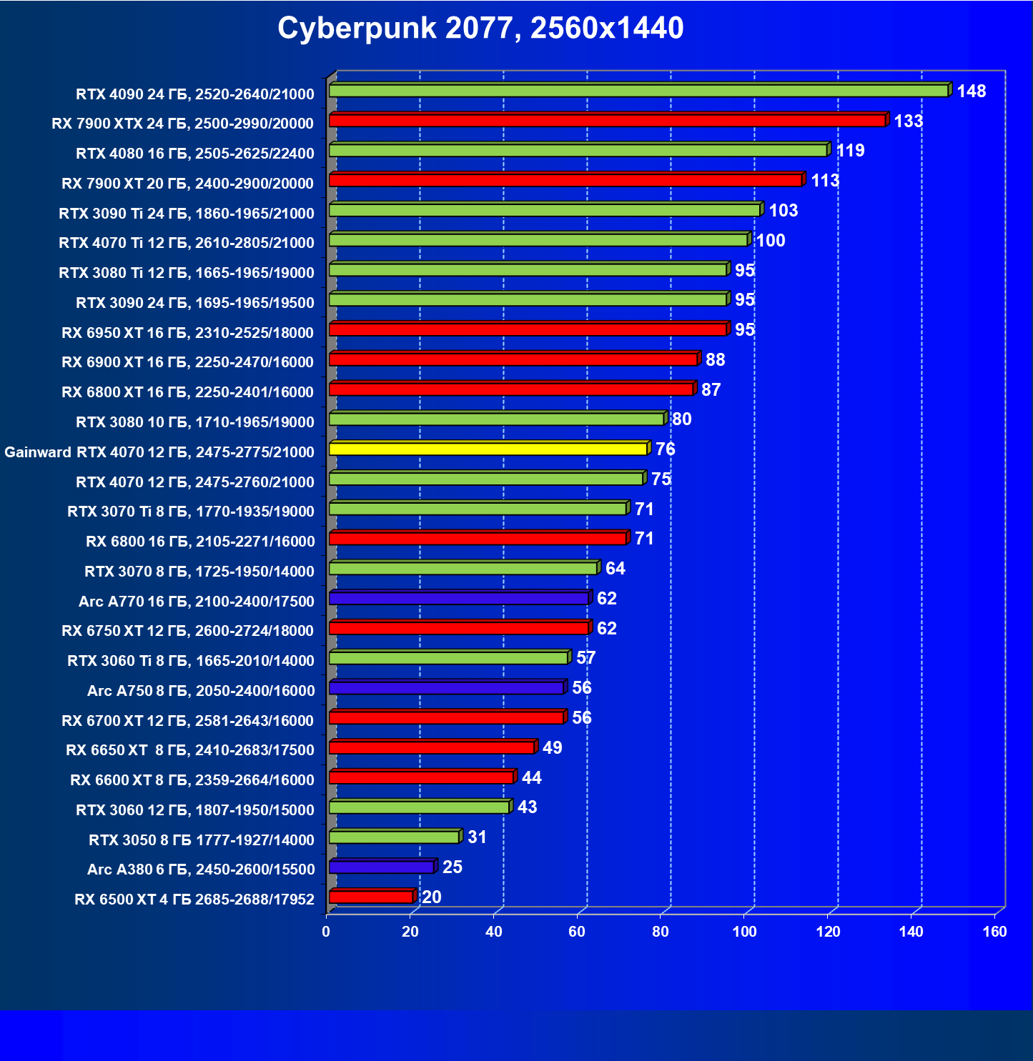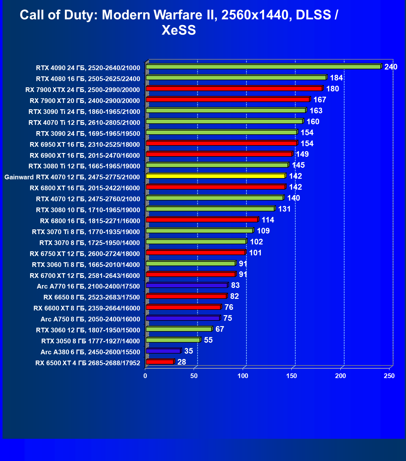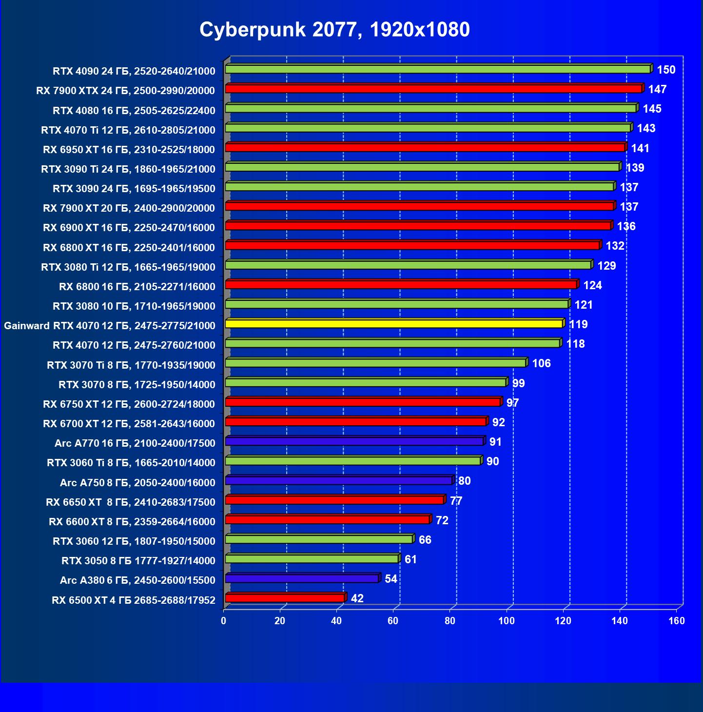 | 12 | Gainward RTX 4070 Ghost 12 ГБ, 2475—2775/21000 | 457 | 72 | 63 500 |