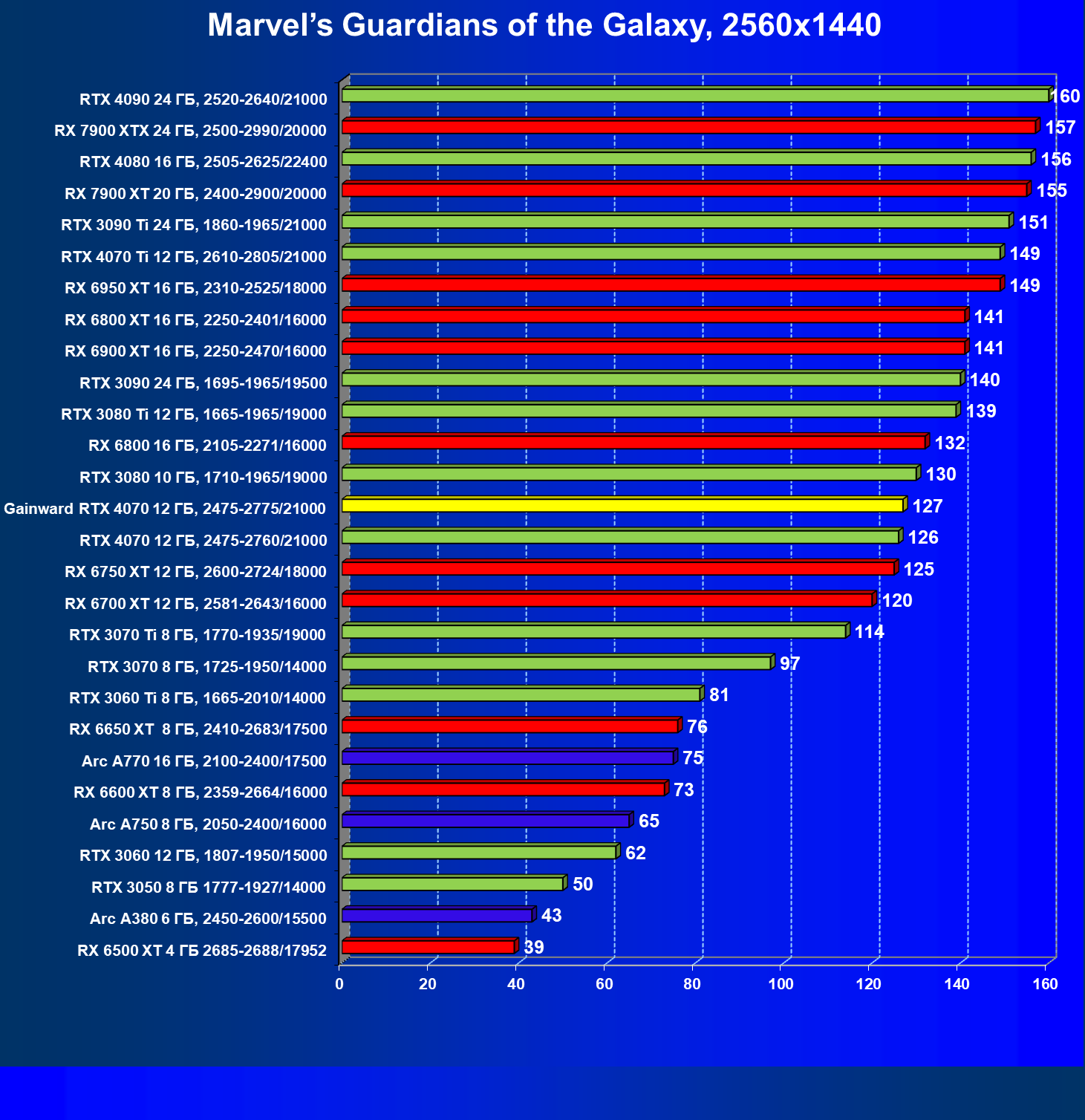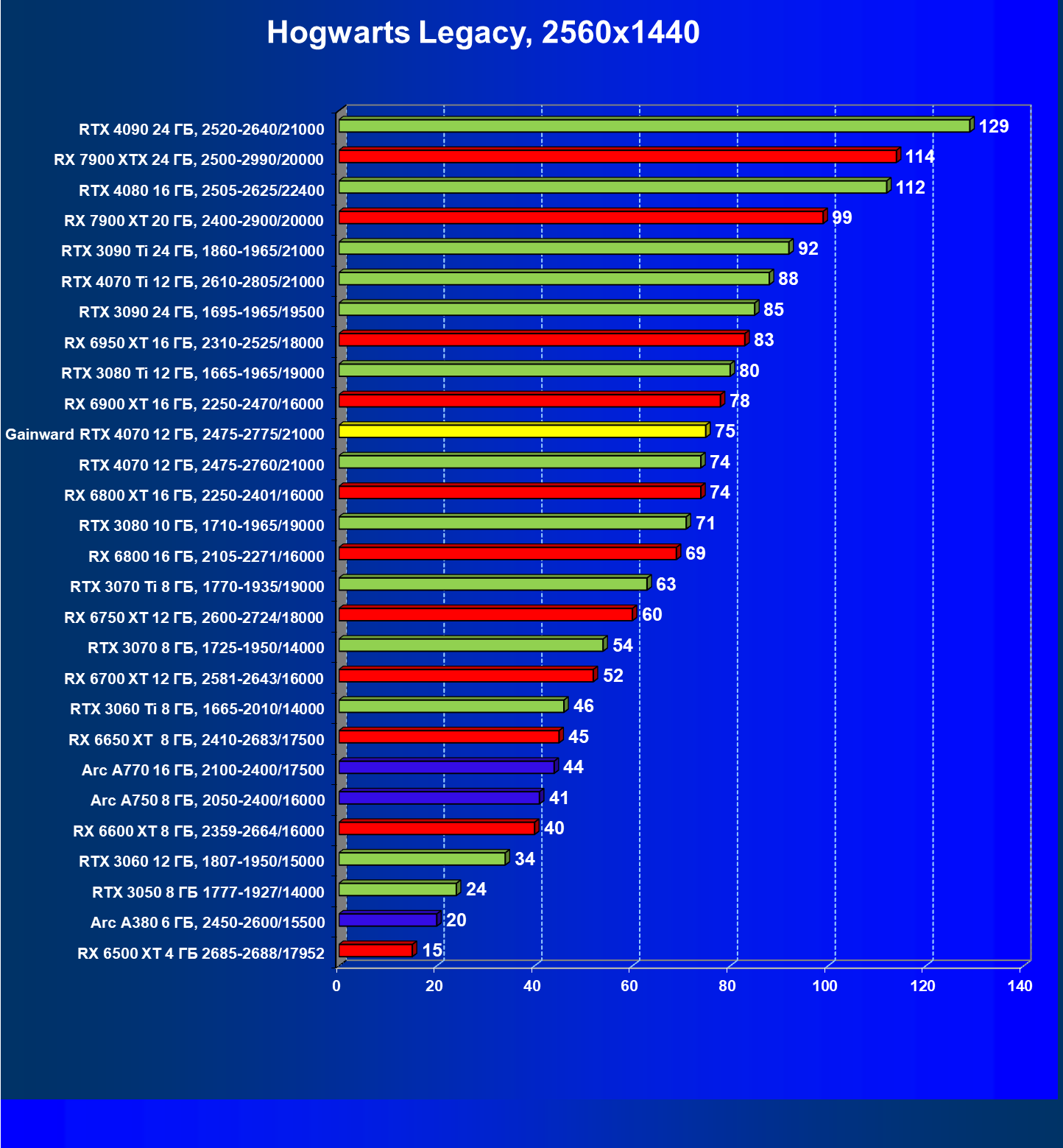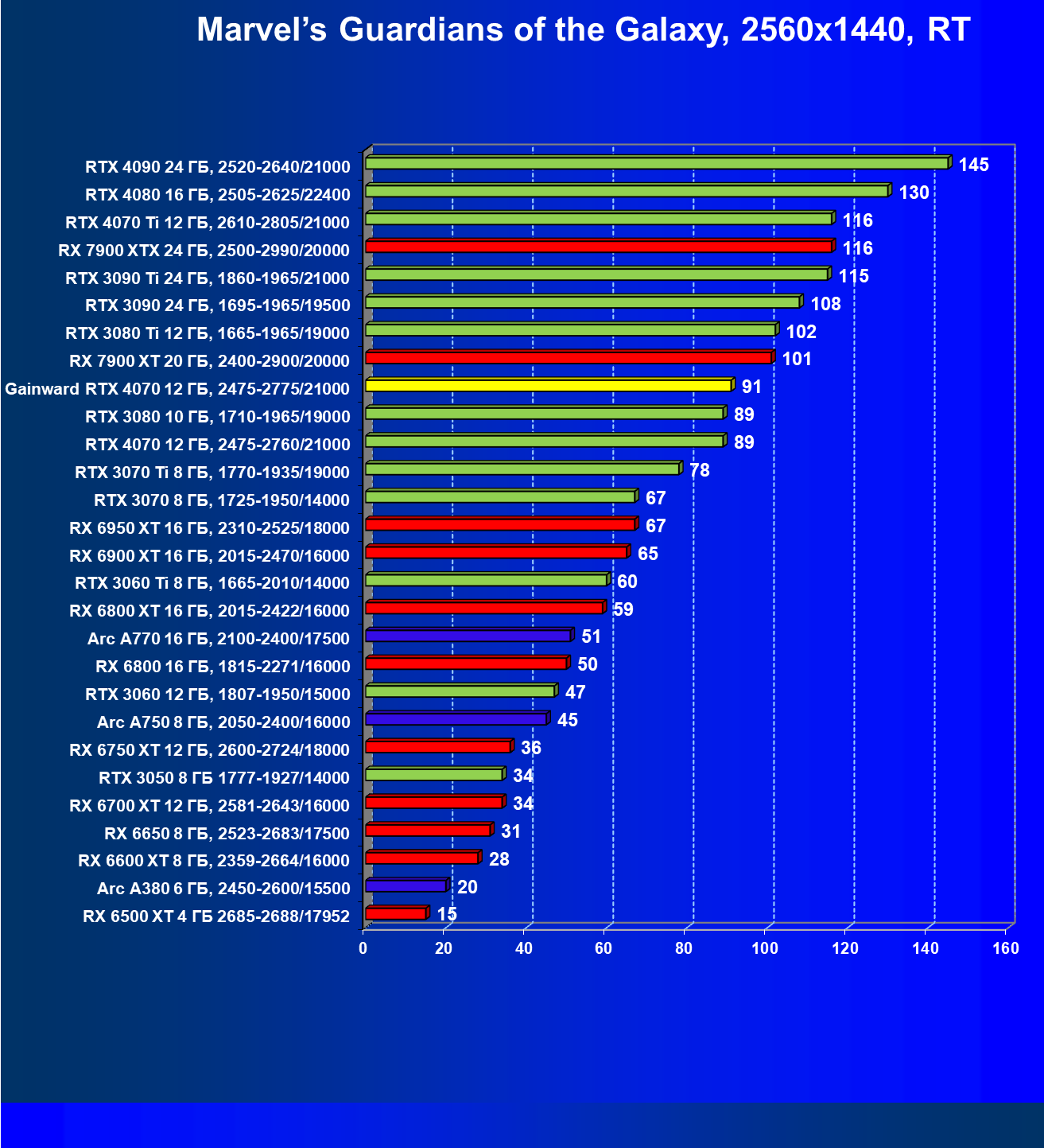 | 12 | Gainward RTX 4070 Ghost 12 ГБ, 2475—2775/21000 | 457 | 72 | 63 500 |