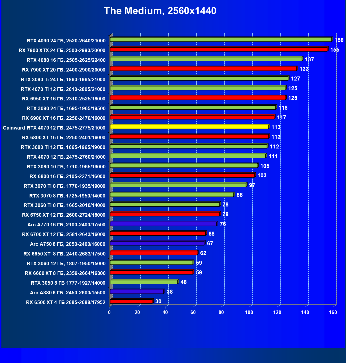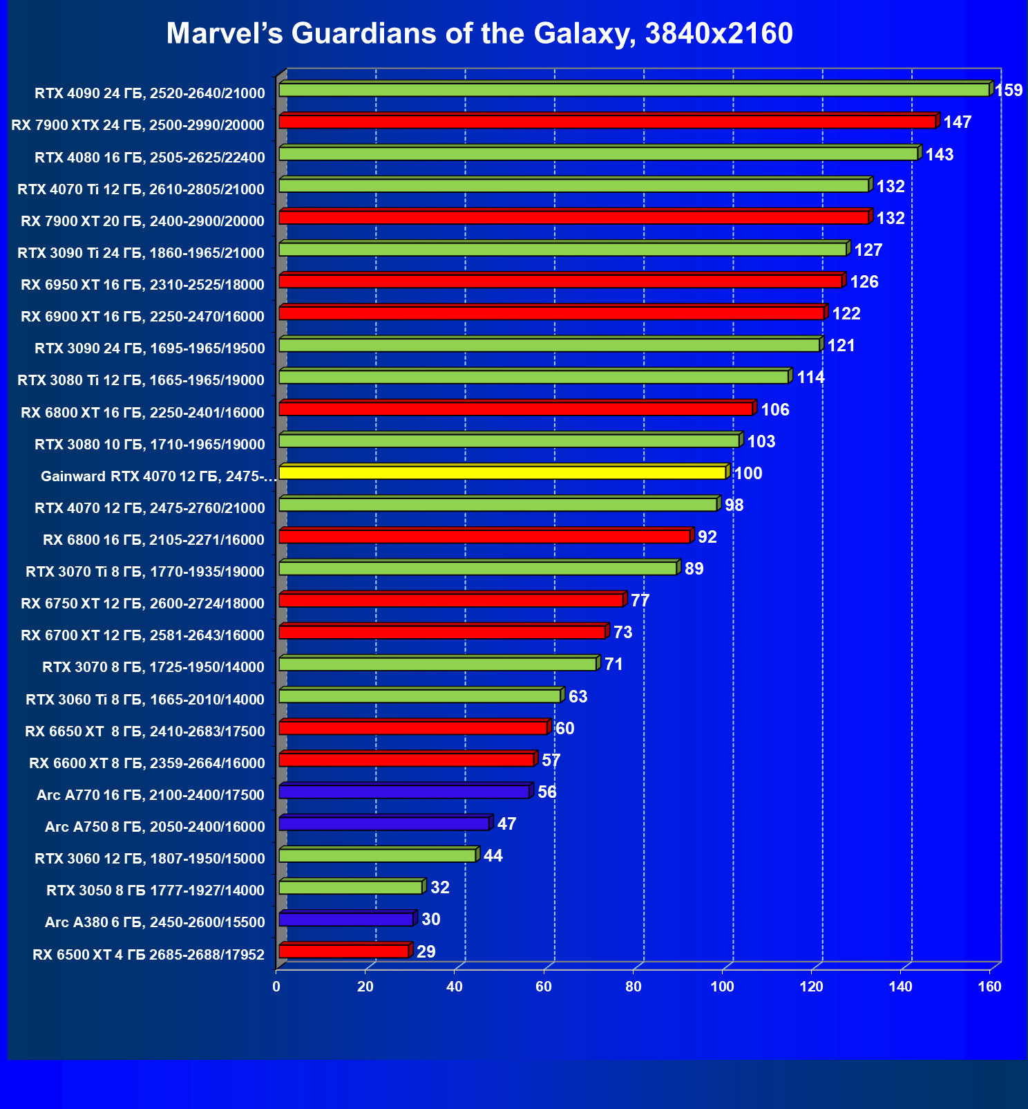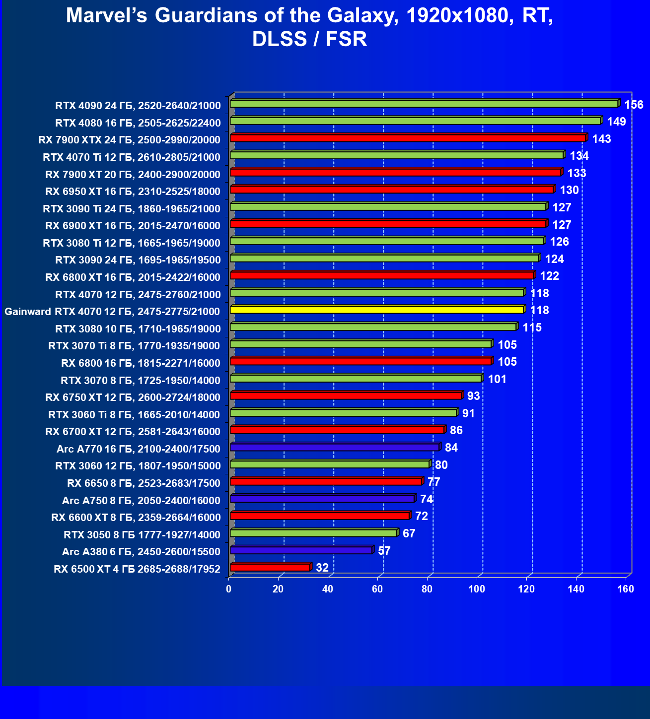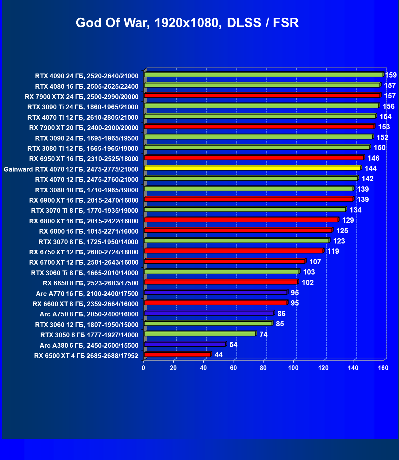 | 12 | Gainward RTX 4070 Ghost 12 ГБ, 2475—2775/21000 | 457 | 72 | 63 500 |