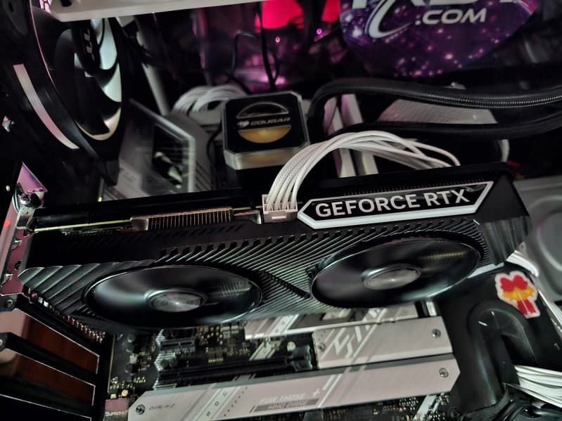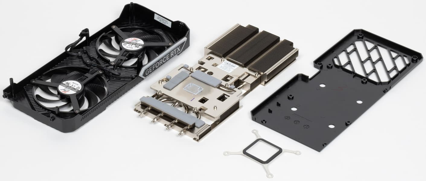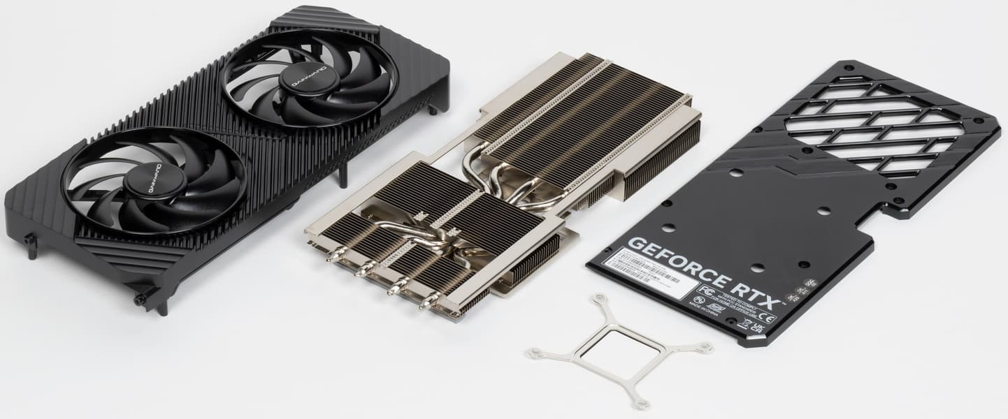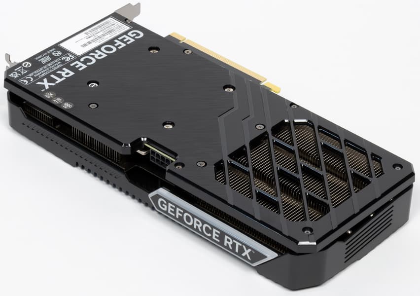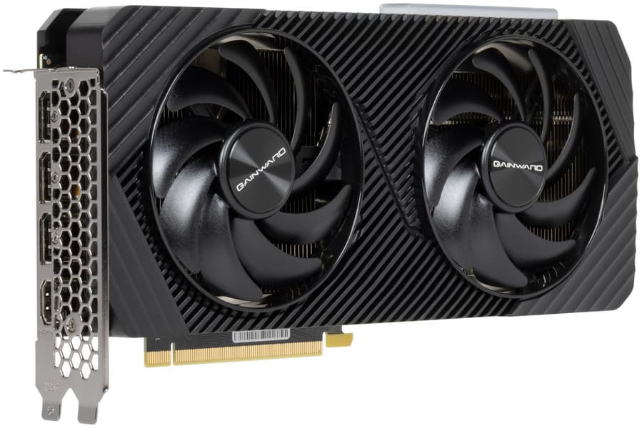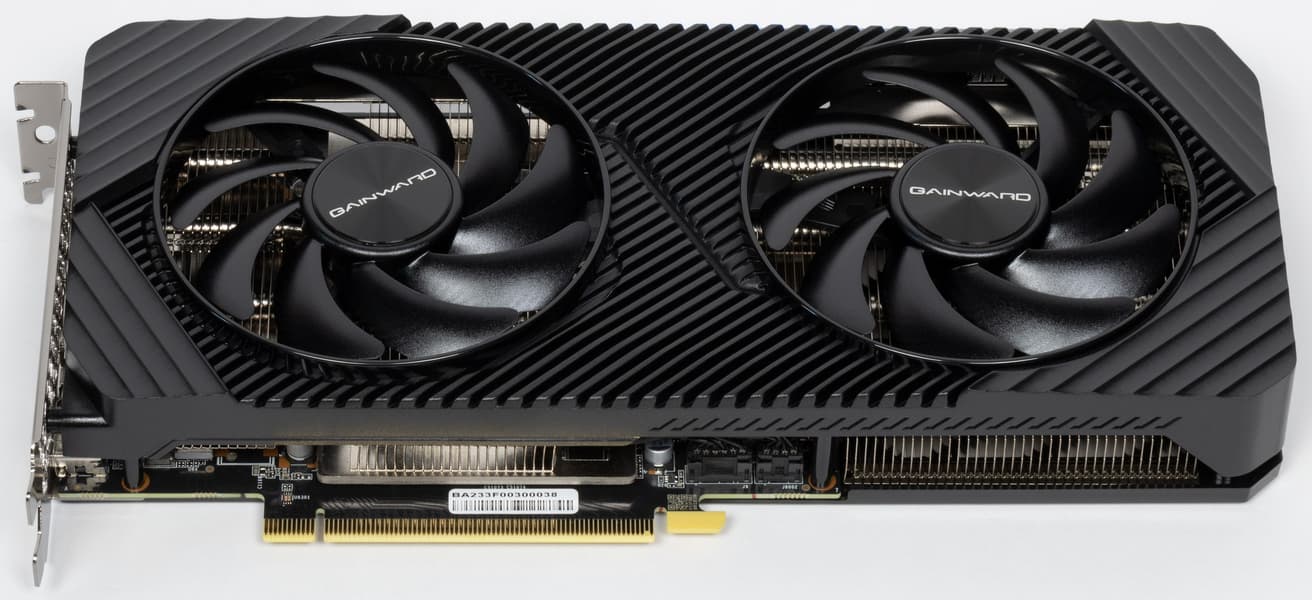 В отличие от новинок более высокого уровня из серии GeForce RTX 40, карта не требует очень мощного блока питания: ее пиковое потребление составляет 200 Вт. Карта Gainward имеет длину 270 мм и занимает 2 слота, использует один 8-контактный разъем питания. Система охлаждения тихая (28,8 дБА), но при этом достаточно эффективная, при максимальной нагрузке нагрев составляет всего 68,6/74 °C (графический процессор/память). Карта не относится к оверклокерским, поэтому возможности повысить лимит потребления для эффективного ручного разгона у нее нет.