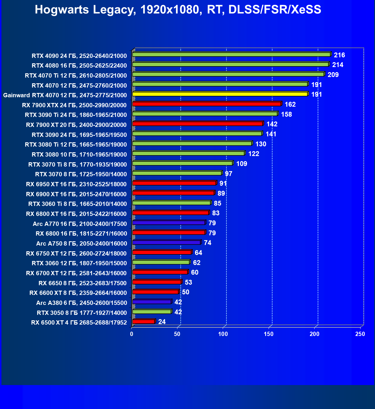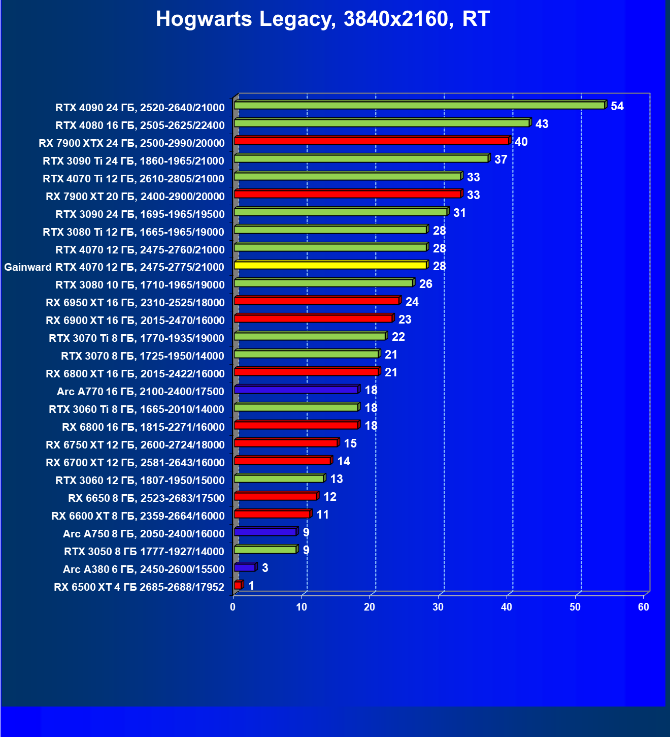 | 09 | RTX 4070 12 ГБ, 2475—2760/21000 | 732 | 122 | 60 000 |