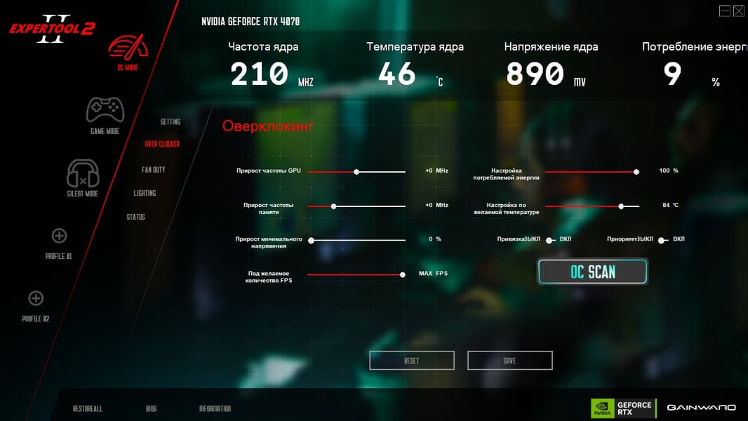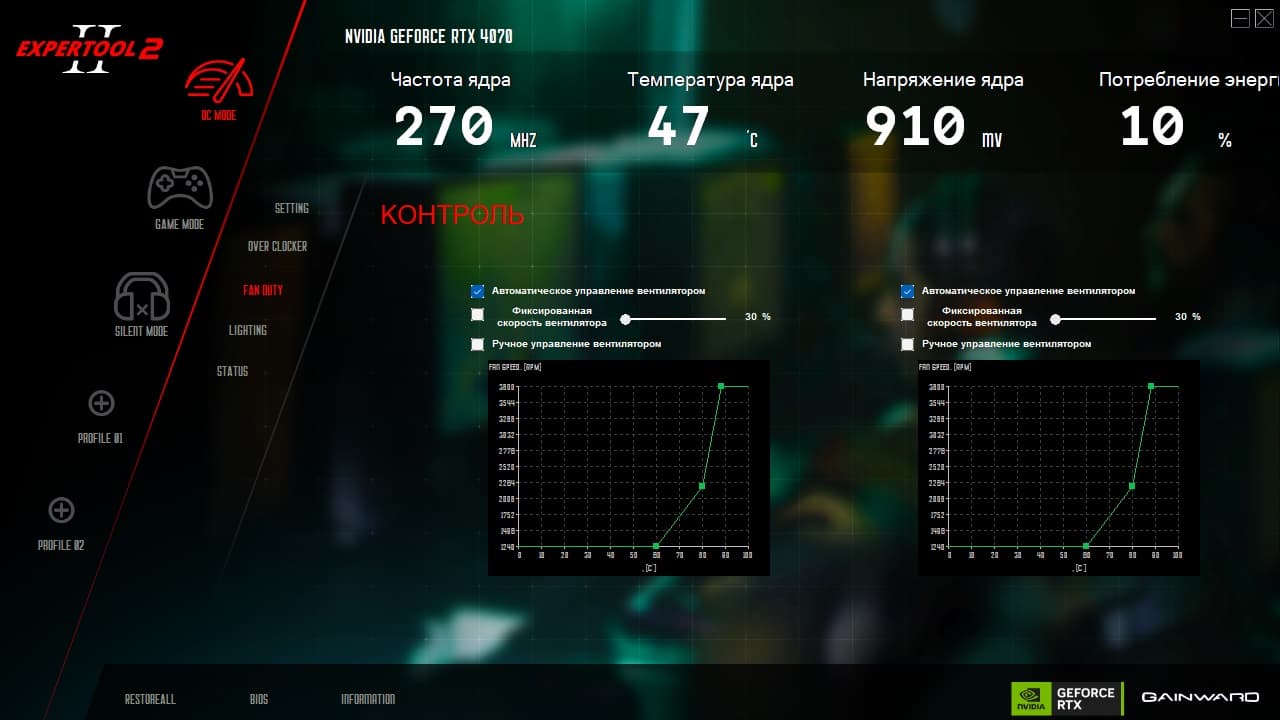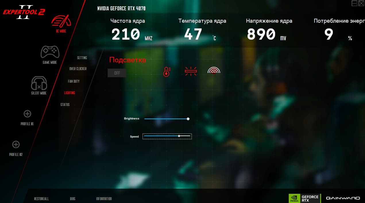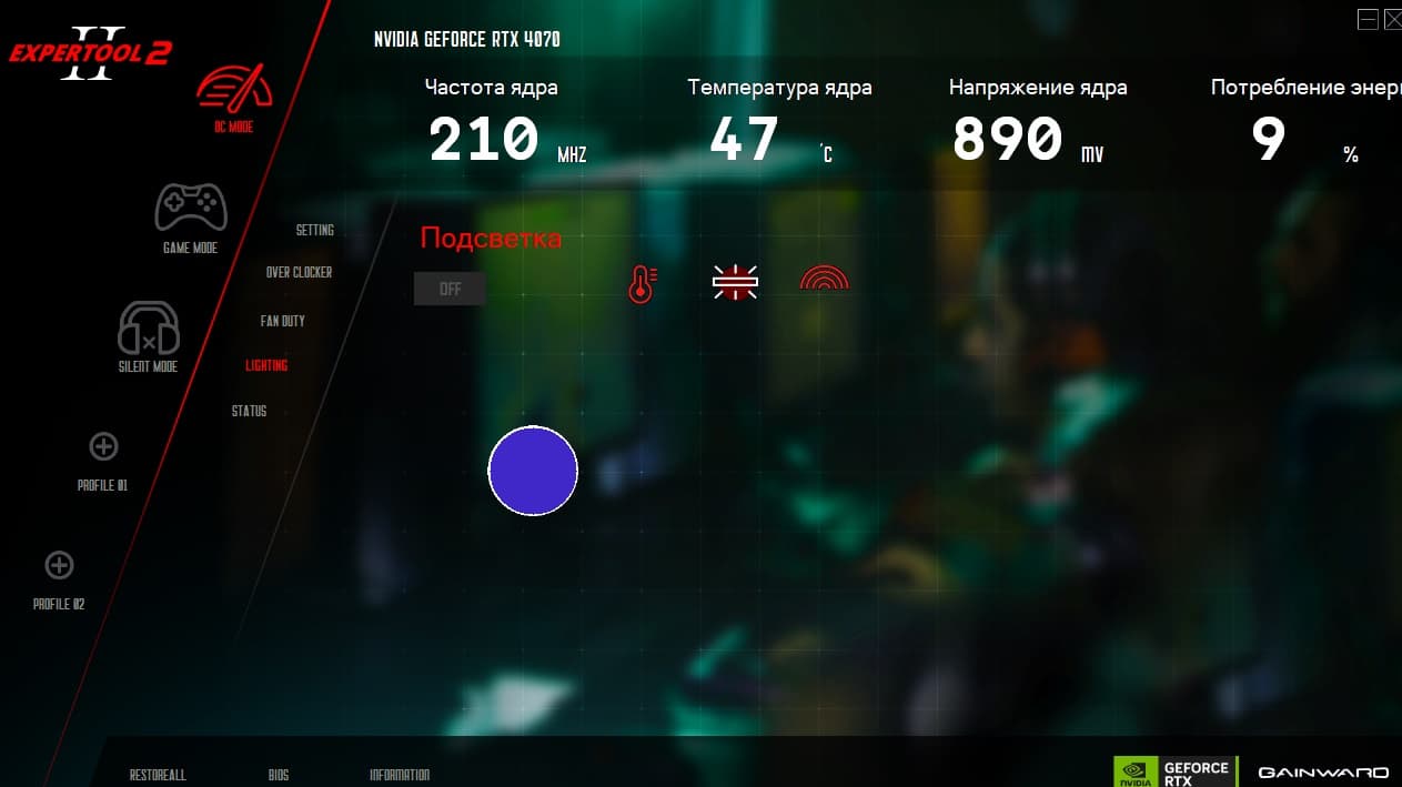 Эта программа предоставляет управление вентиляторами, частотами работы карты, напряжением ядра, слежение за состоянием карты (мониторинг) и настройку подсветки.