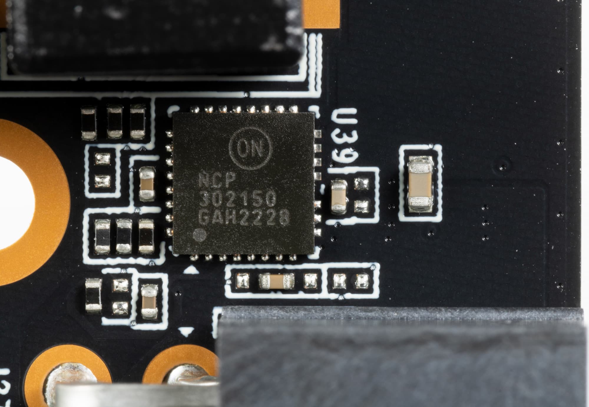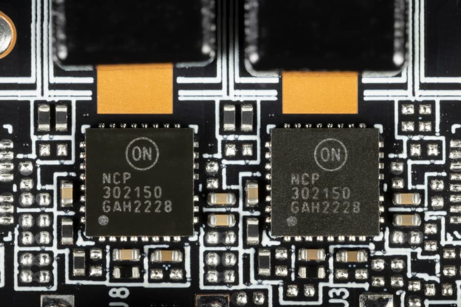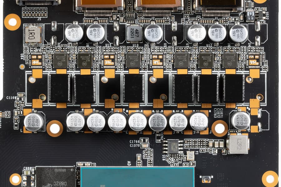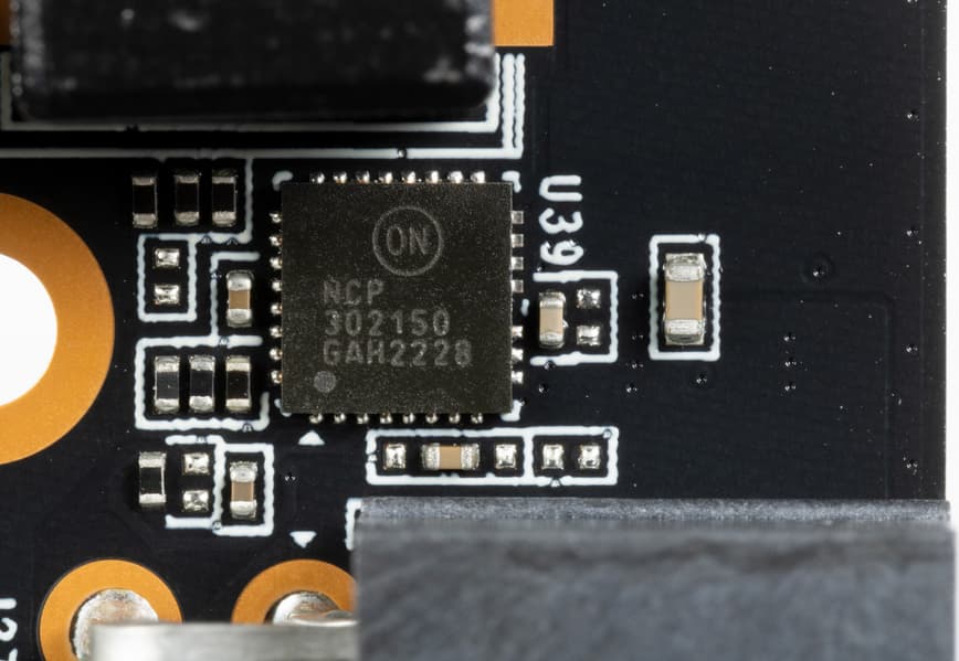 В преобразователе питания, традиционно для всех видеокарт Nvidia, используются транзисторные сборки DrMOS — в данном случае NCP302150 (On Semiconductor), каждая из которых рассчитана максимум на 50 А.