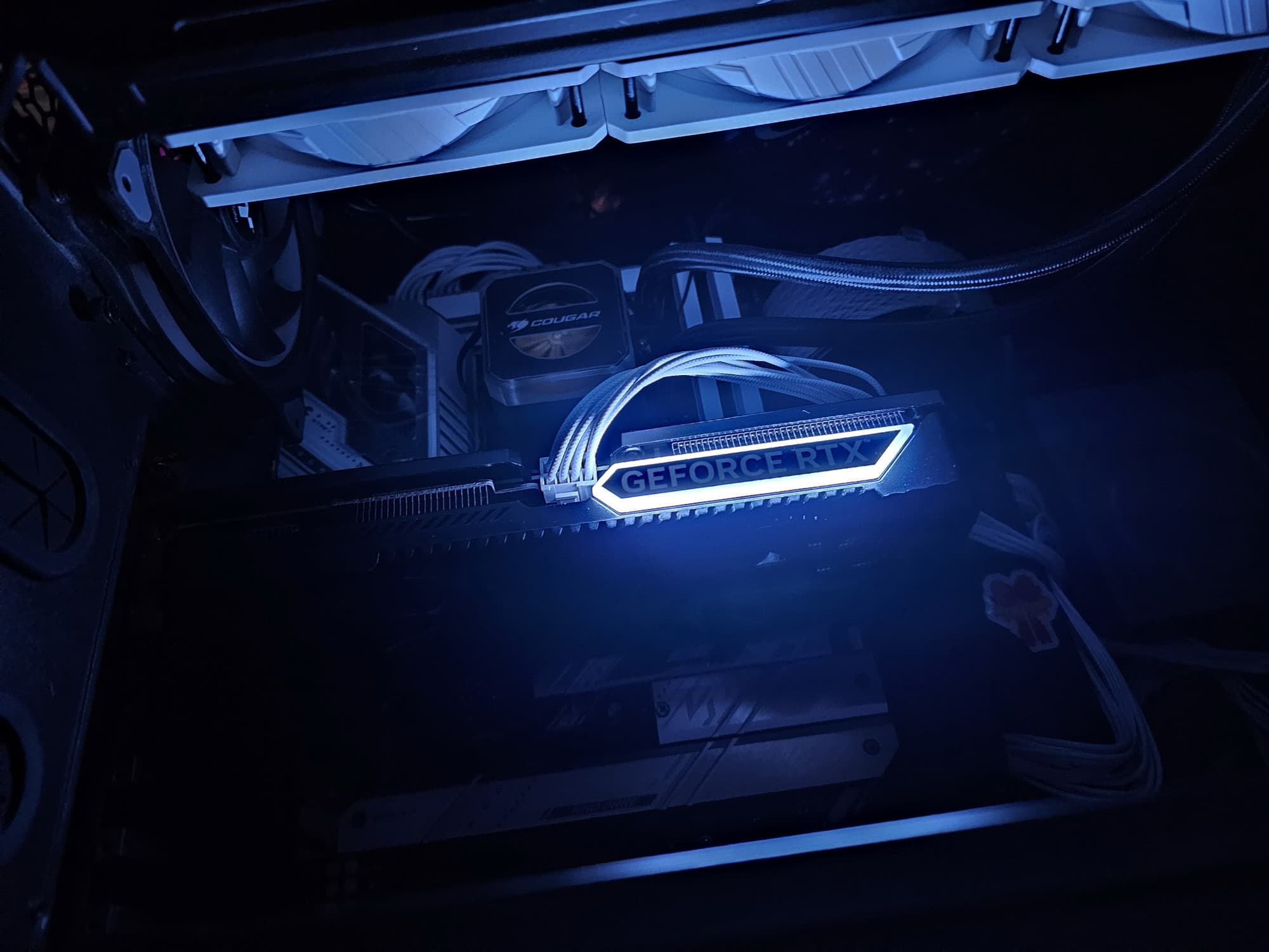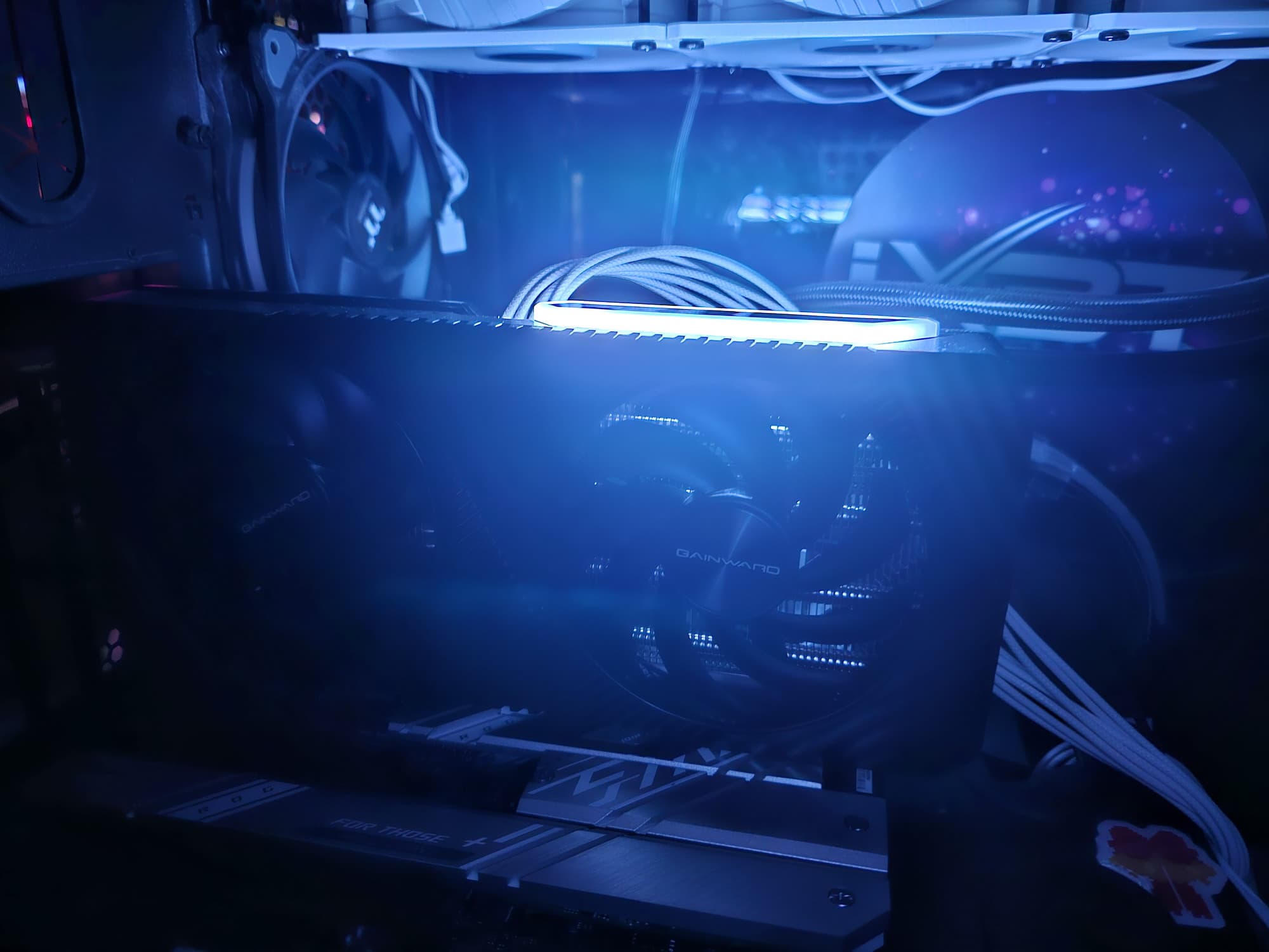 Поверх радиатора установлен кожух с вентиляторами ∅95 мм, которые имеют по 9 лопастей и работают на единой частоте вращения (по умолчанию, но через программу ExperTool можно настроить их работу раздельно). Радиатор продувается насквозь правым вентилятором.