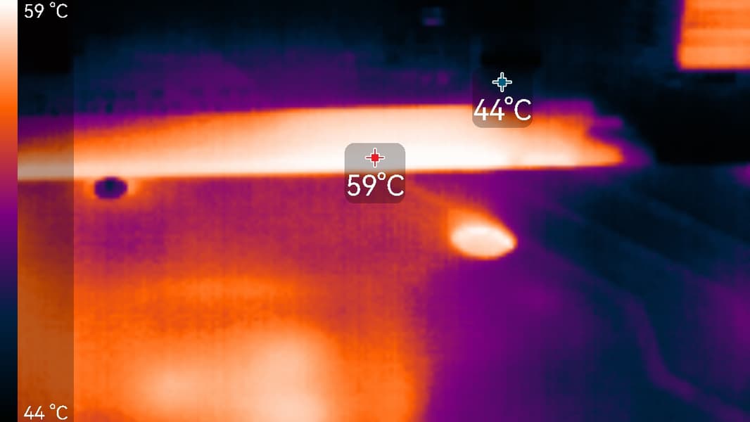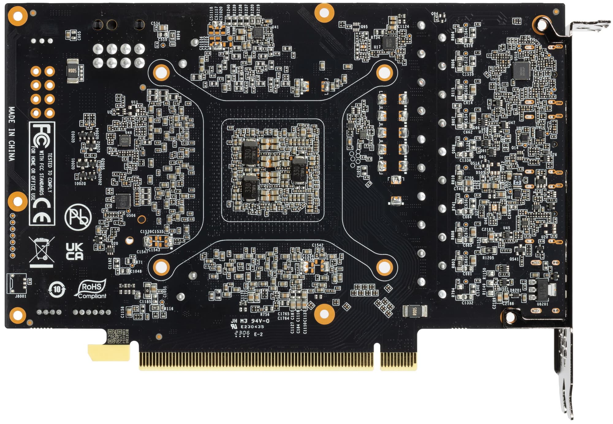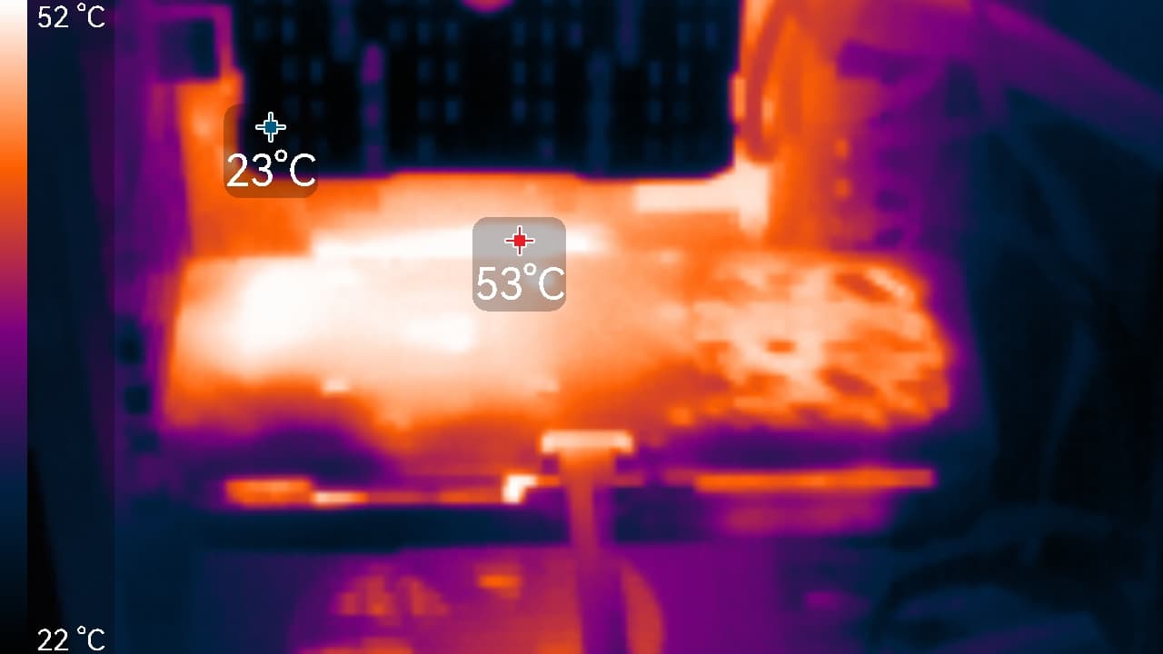 Максимальный нагрев наблюдался с обратной стороны у разъема PCIe, а также в области преобразователей питания VRM.