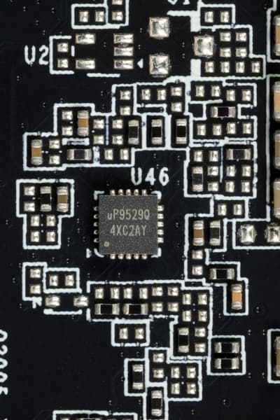 6 фазами питания ядра управляет ШИМ-контроллер uP9512R (uPI Semiconductor), расположенный на оборотной стороне PCB. Он рассчитан максимум на 12 фаз.
