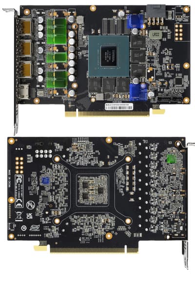 Мы сравниваем карту Gainward с аналогичным продуктом на базе RTX 4070, но под маркой Palit. И как мы видим, печатные платы у этих карт полностью идентичны, что совершенно логично, ибо Gainward — торговая марка, принадлежащая Palit Group.