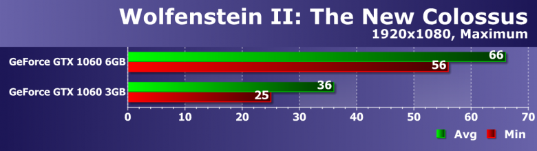 Тем более, что даже при усредненной разнице в 16% по средней частоте кадров для Full HD-разрешения минимальные показатели у трехгигабайтной видеокарты отличались в среднем уже на 60%! Это говорит о том, что на варианте GeForce GTX 1060 3 ГБ гораздо чаще случаются провалы производительности в моменты подгрузки ресурсов, не вошедших в видеопамять. Да и отдельно по играм мы увидели некоторое количество проектов, в которых разница между 3 и 6 ГБ означала неиграбельность в случае использования младшего решения. Особенно сильно нехватка видеопамяти видна в играх на версиях движка id Tech 5 и 6, вроде Doom, Wolfenstein II и Dishonored 2, в которых используются так называемые мегатекстуры, требующие огромных объемов VRAM при самых высоких настройках.