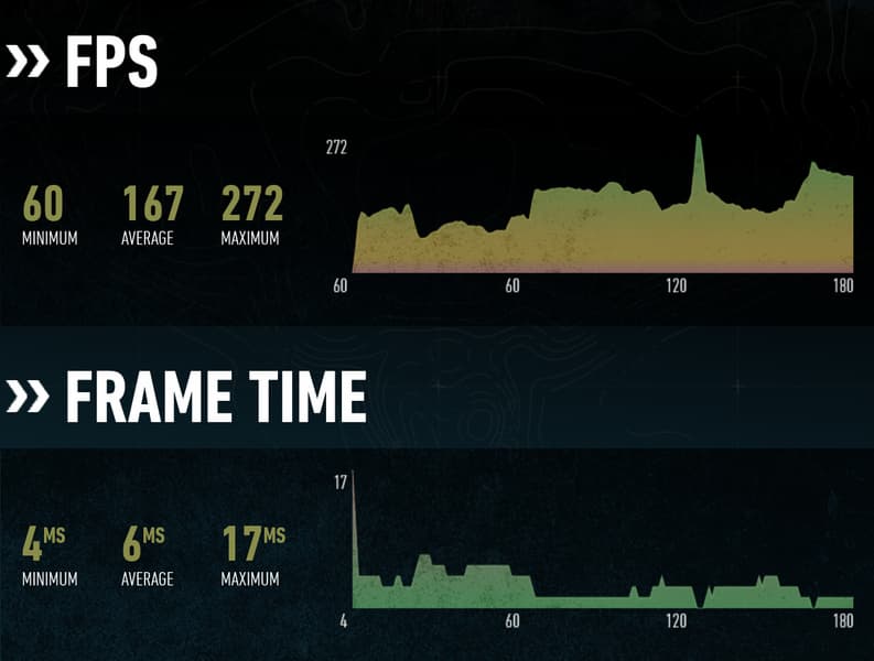 Рассмотрим еще три игры при средних настройках в Full HD-разрешении, и для начала возьмем игру Metro Exodus и нескольких секунд игрового процесса — на основании данных от игры мы строим уже собственные графики, на которых указана мгновенная частота кадров (те же времена рендеринга кадров, по сути).