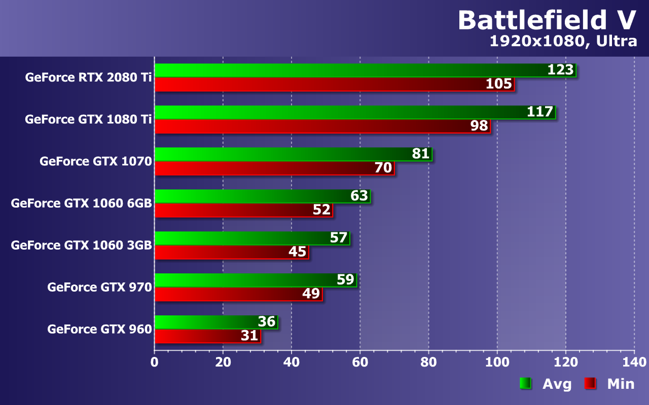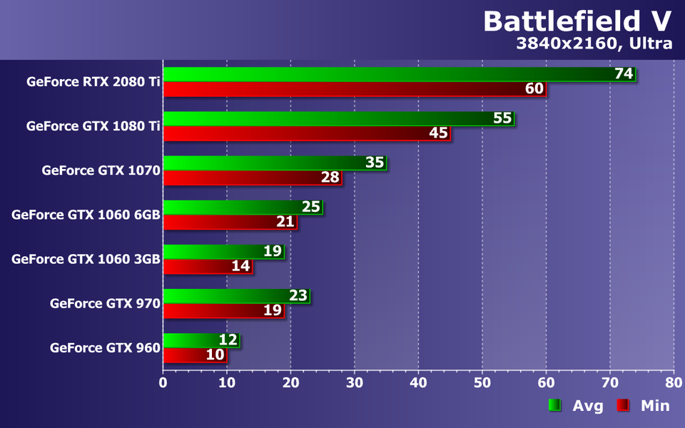 Слабейшая видеокарта в виде GeForce GTX 960 уже без всяких оговорок не справляется с обеспечением даже минимальной играбельности, не дотягивая до 30 FPS даже в среднем. Середнячки же уже не пытаются приблизиться к 60 FPS, но более чем минимально комфортную производительность они обеспечивают. Средней частоты кадров 45—50 FPS при 38—44 FPS как минимум, будет вполне достаточно даже для такой динамичной игры, как Battlefield V.