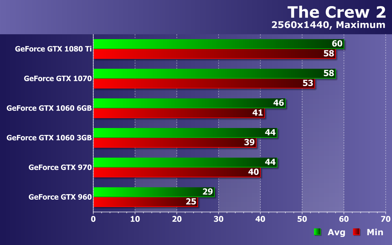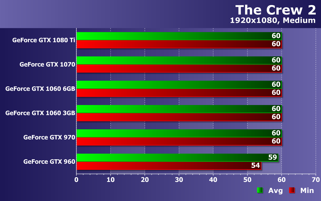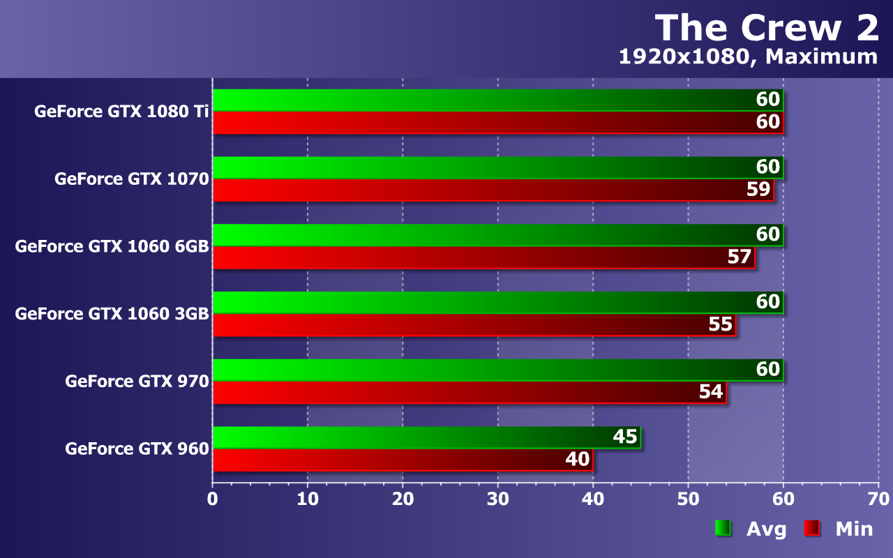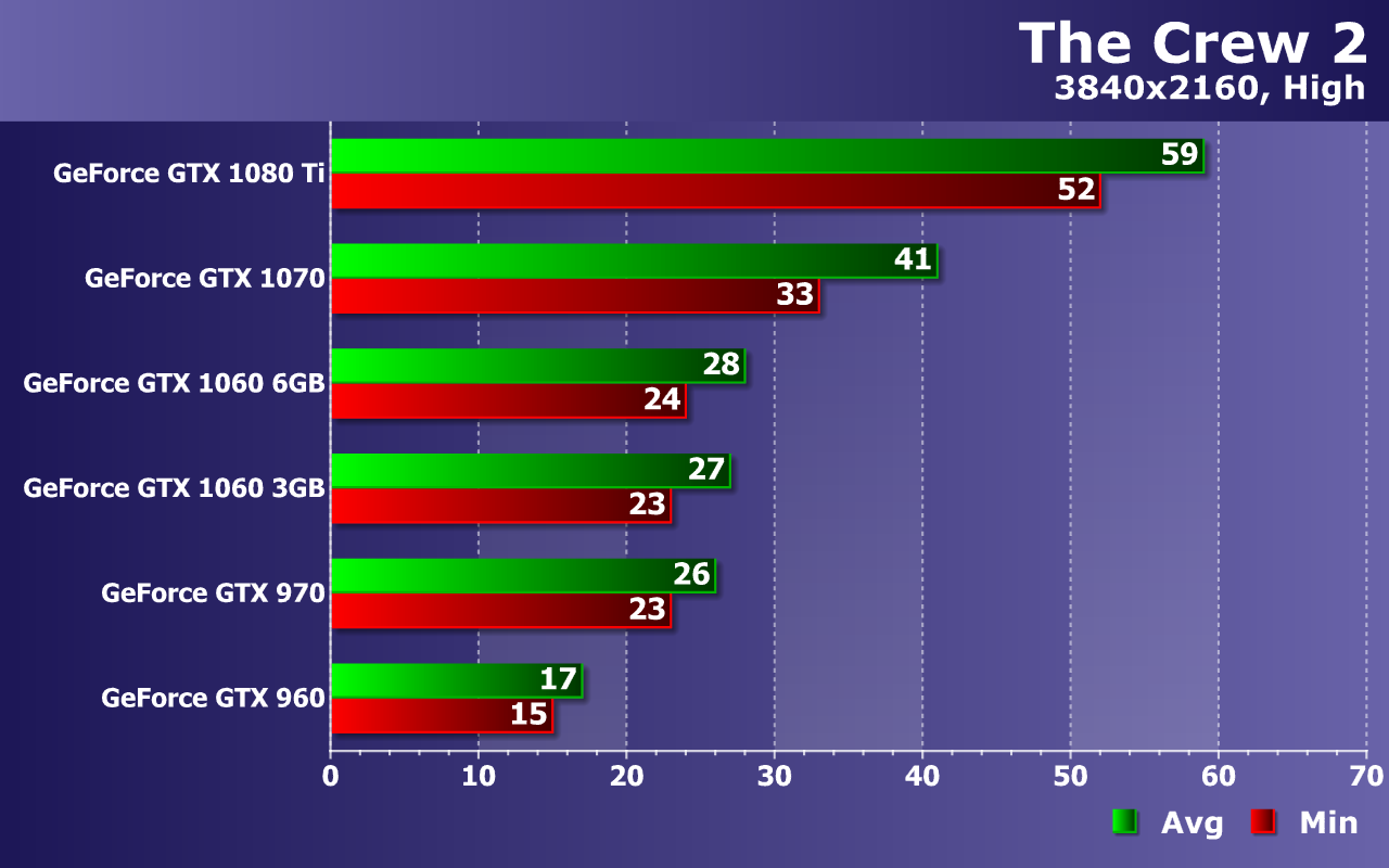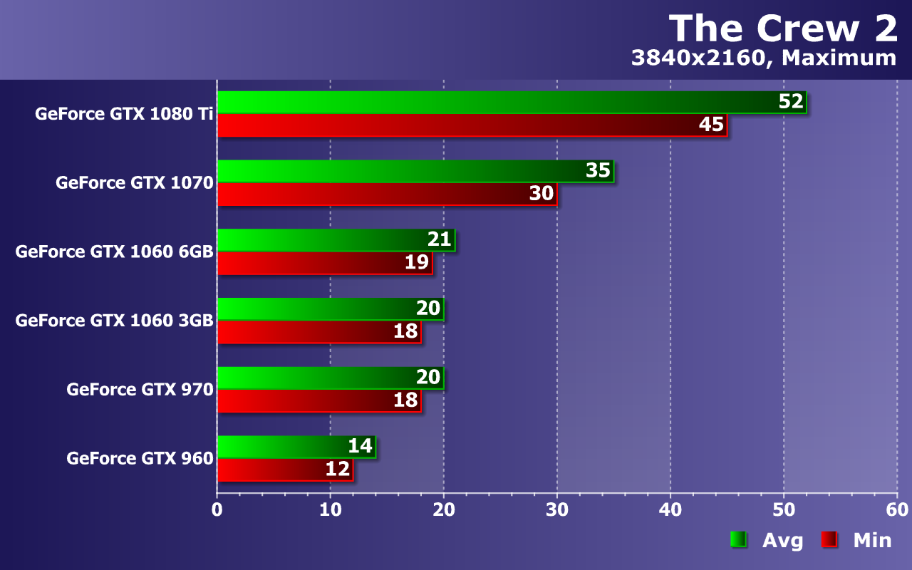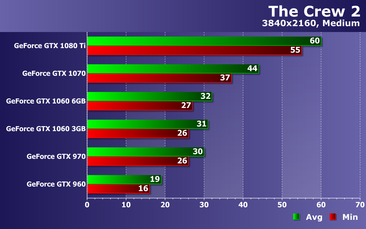Мы измеряем в тестах не только среднюю, но и минимальную частоту кадров, так как от нее зависит стабильность видеоряда и общий комфорт для игрока. По средней и минимальной частоте кадров из теста можно сделать выводы об общей плавности и комфортности. По нашим наблюдениям, игре The Crew 2 очень сильно вредят падения частоты кадров ниже 30 FPS. Так что для хоть какого-то комфорта при игре жизненно необходимо, чтобы частота кадров оставалась в промежутке между 30 и 60 FPS (выше не подняться, а ниже будет некомфортно). А в идеале — постоянные 60 FPS без снижения вообще.