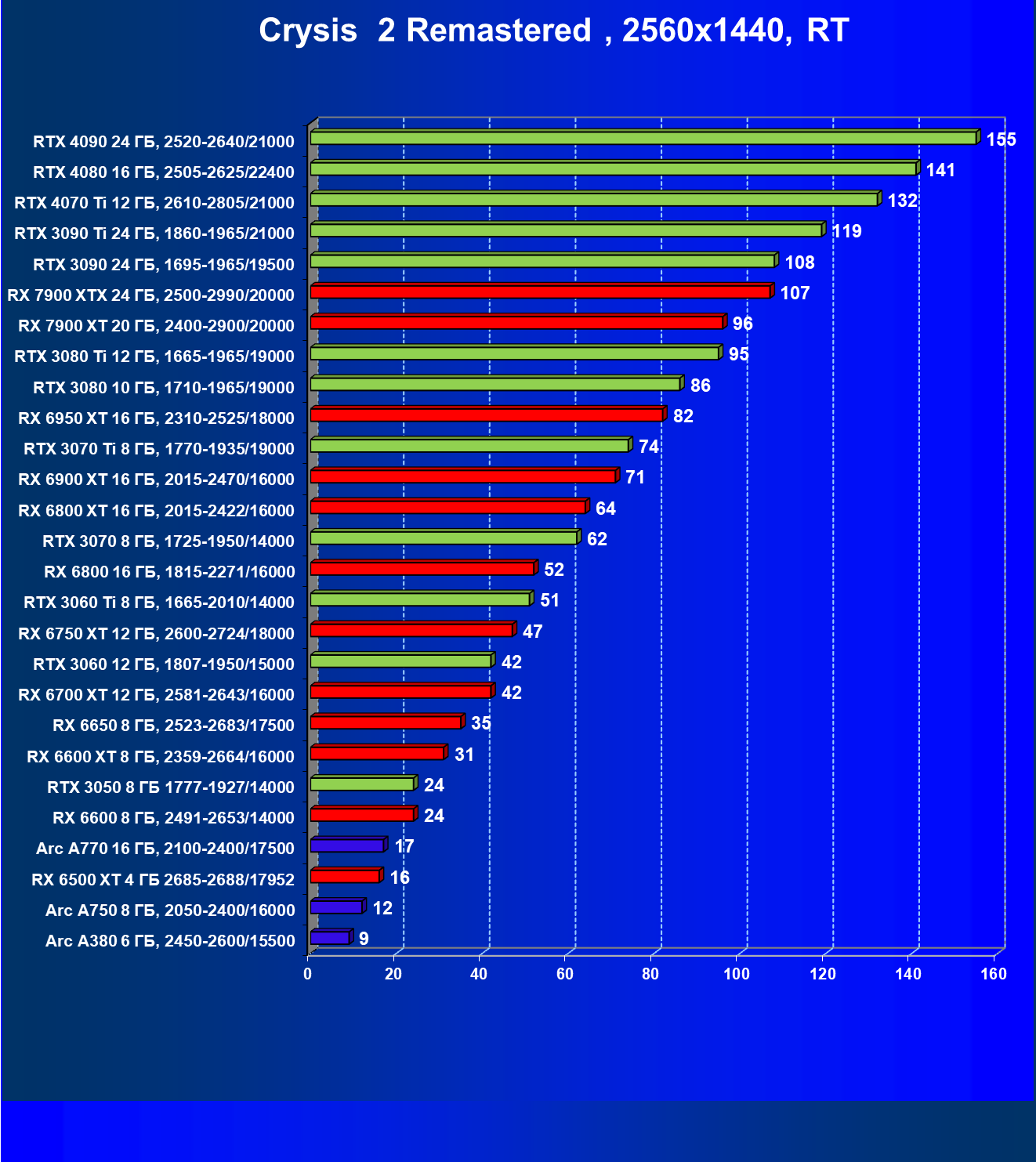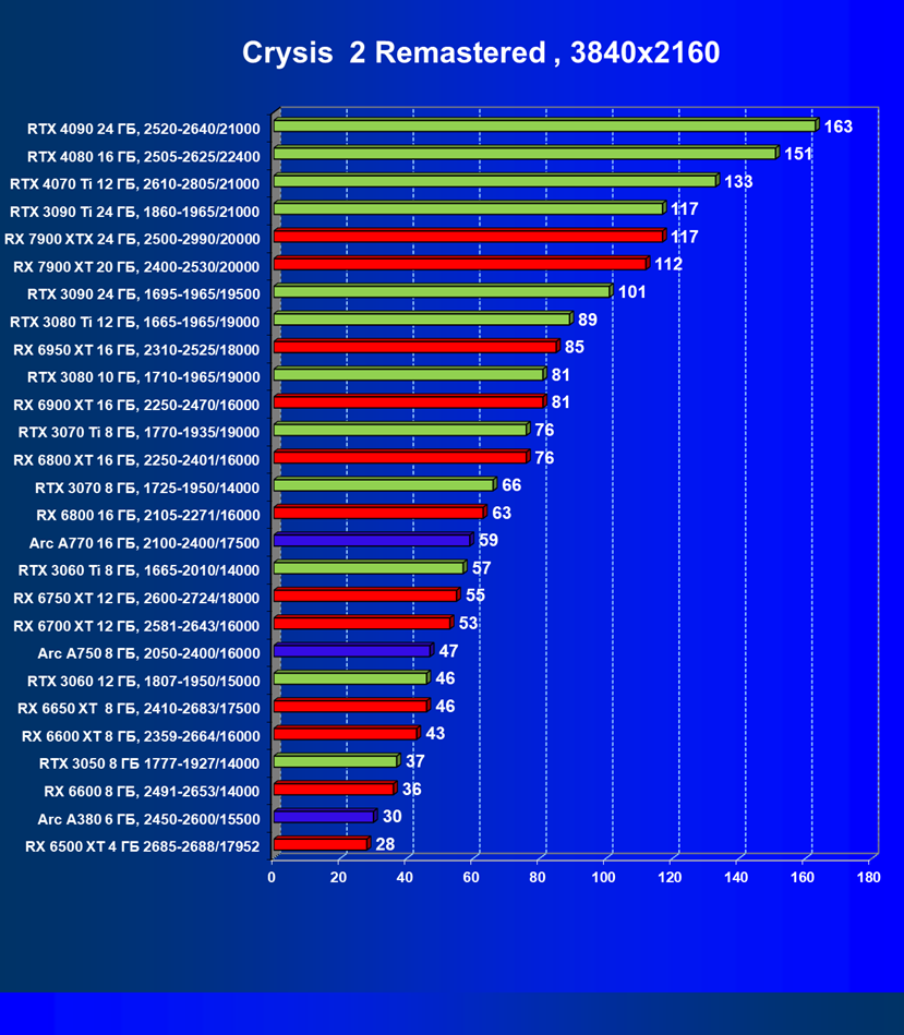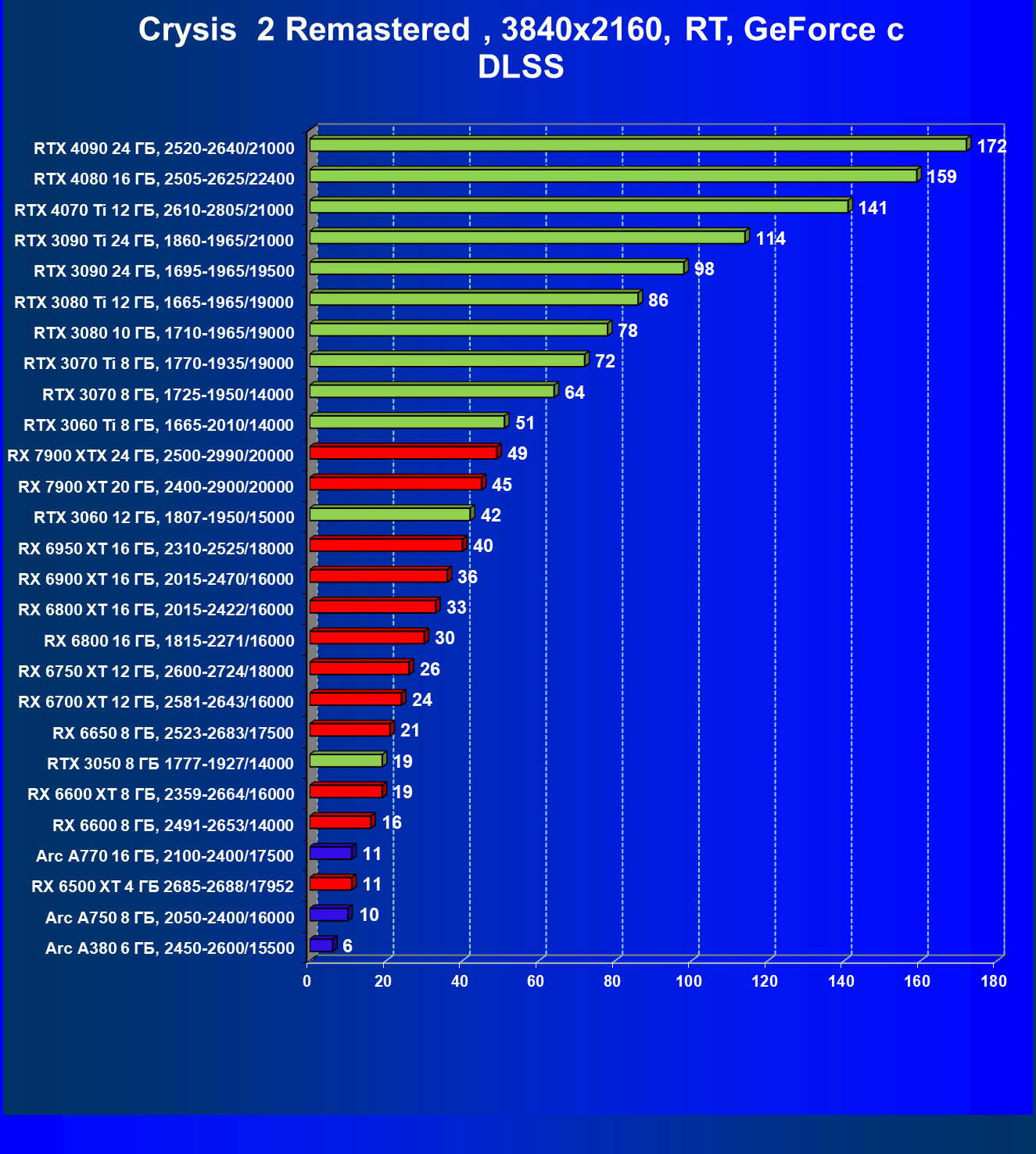 Если рассматривать самое популярное разрешение Full HD, то для того, чтобы играть на максимальных настройках графики без трассировки лучей, нужно вооружиться GeForce RTX 3050, Radeon RX 6600 XT или Intel Arc 750. В разрешении 2.5K достаточную производительность обеспечат GeForce RTX 3060, Radeon RX 6600 XT и Intel Arc 770. В разрешении 4K для комфорта потребуется GeForce RTX 3060 Ti или Radeon RX 6750 XT. Около 50 FPS — вполне приемлемая скорость для этой игры.