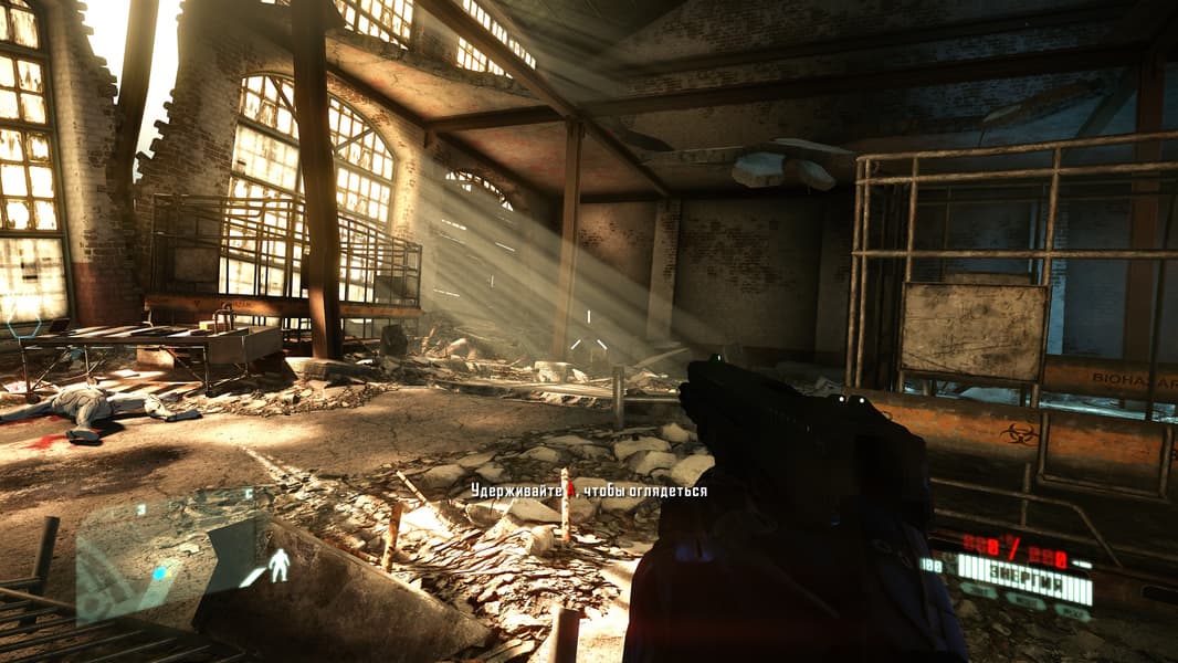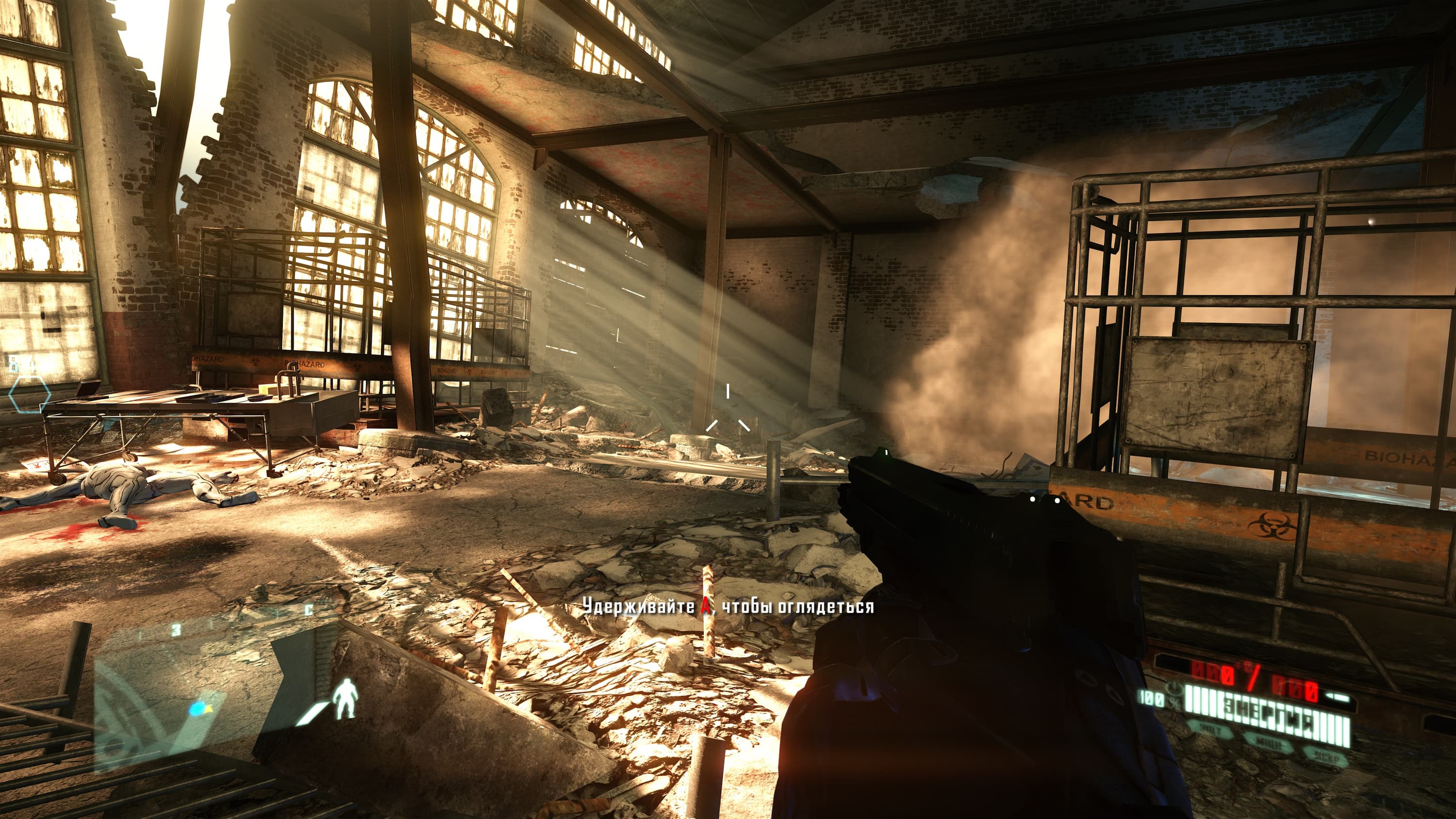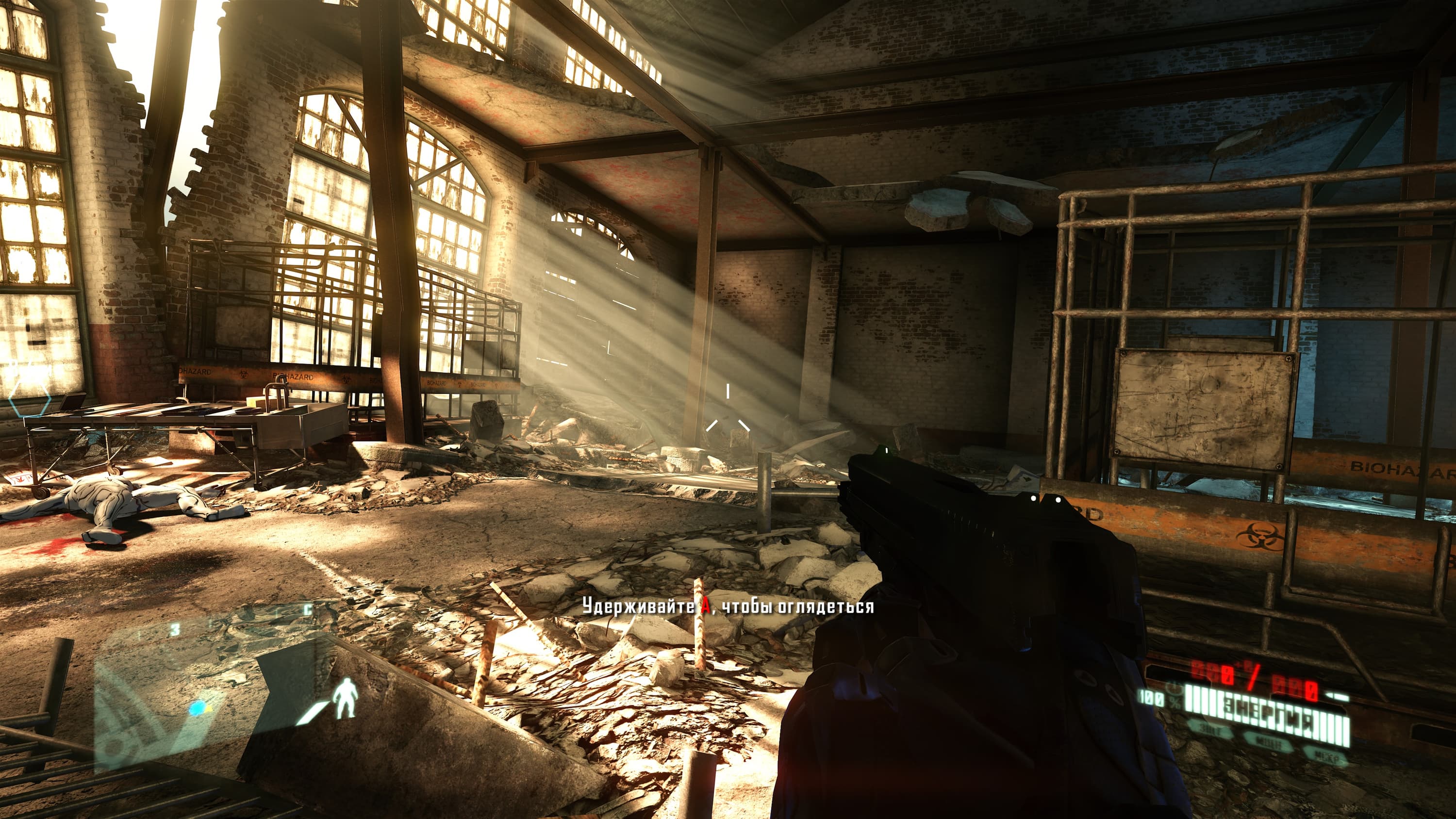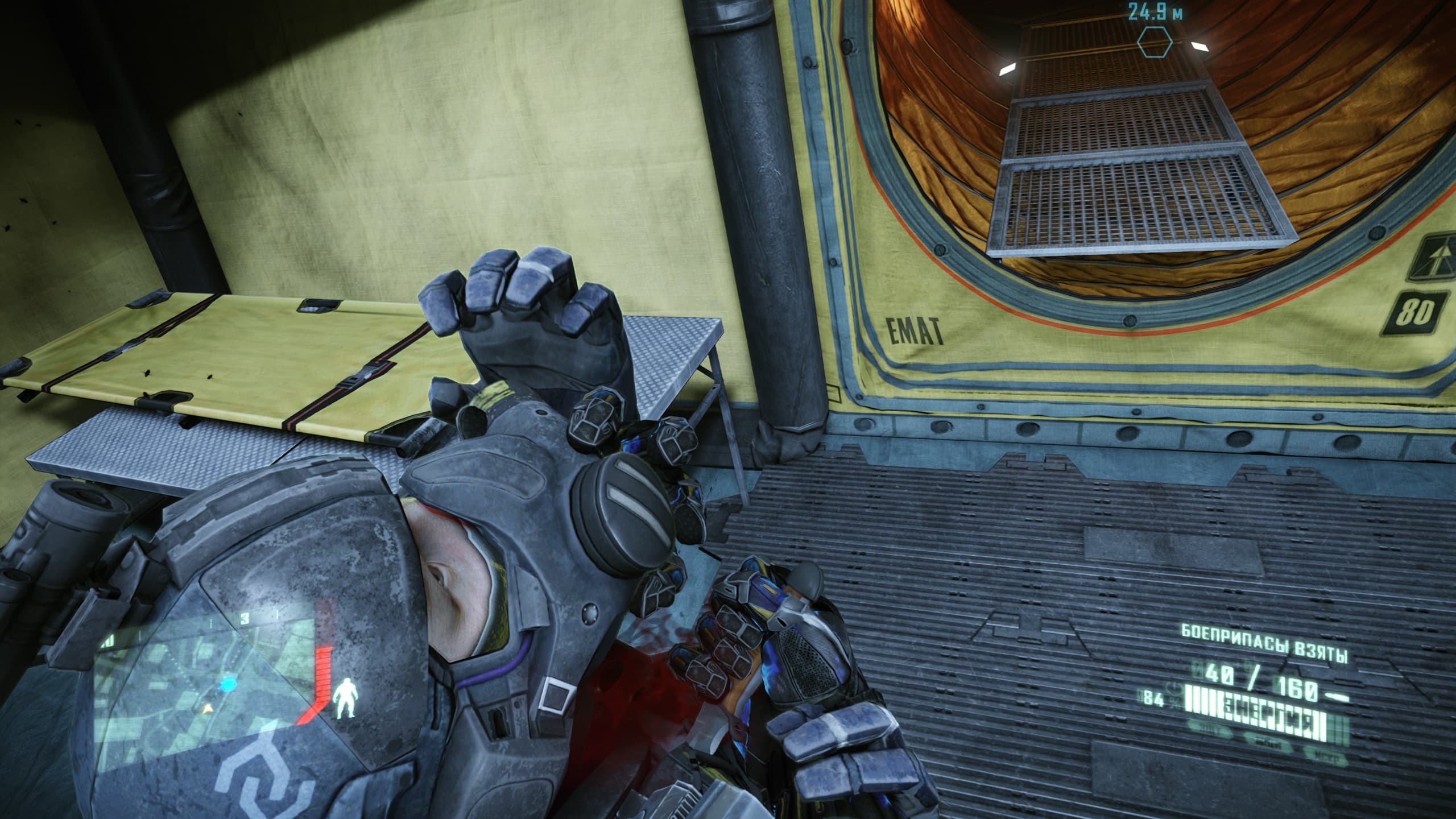 Конечно, как же без визора (бинокля) и тепловизора... без этого ты — не супер солдат. Все ранее упомянутые возможности костюма имеют «прокачку», которая открывает несколько особых возможностей. Ресурс для «прокачки» выпадает с инопланетных тел, поэтому логично, что чем больше устраните гадов, тем больше соберете ресурсов и уже быстрее сможете серьезно улучшить свои дополнительные навыки, чтобы прохождение даже на высокой сложности было чуть легче.
