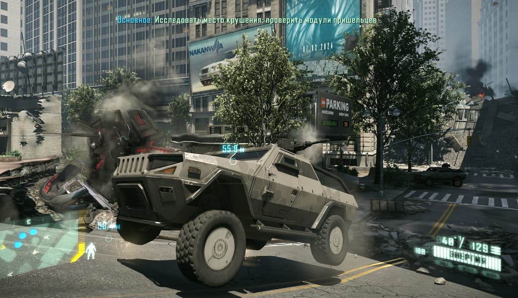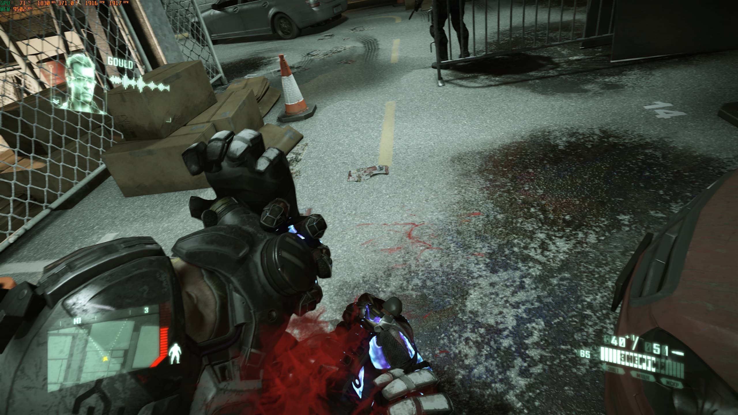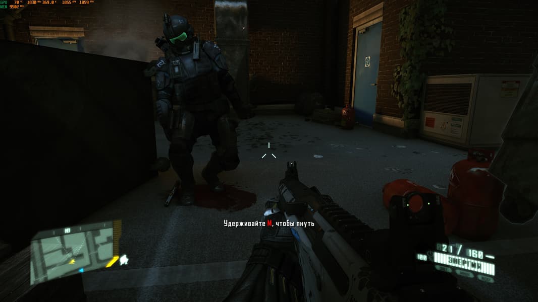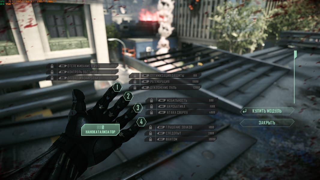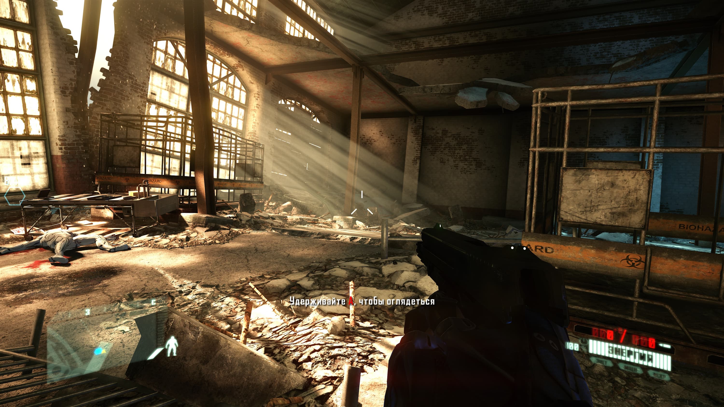 Конечно, как же без визора (бинокля) и тепловизора... без этого ты — не супер солдат. Все ранее упомянутые возможности костюма имеют «прокачку», которая открывает несколько особых возможностей. Ресурс для «прокачки» выпадает с инопланетных тел, поэтому логично, что чем больше устраните гадов, тем больше соберете ресурсов и уже быстрее сможете серьезно улучшить свои дополнительные навыки, чтобы прохождение даже на высокой сложности было чуть легче.