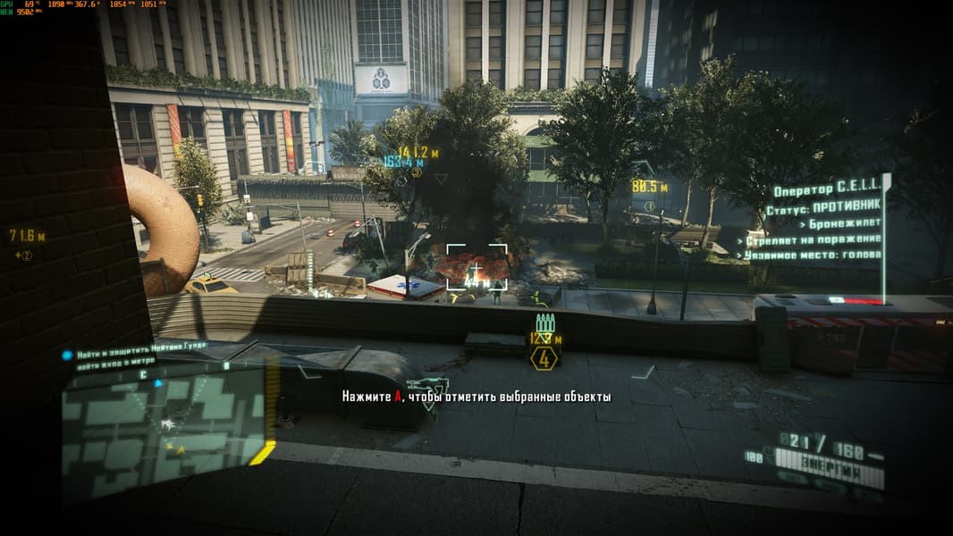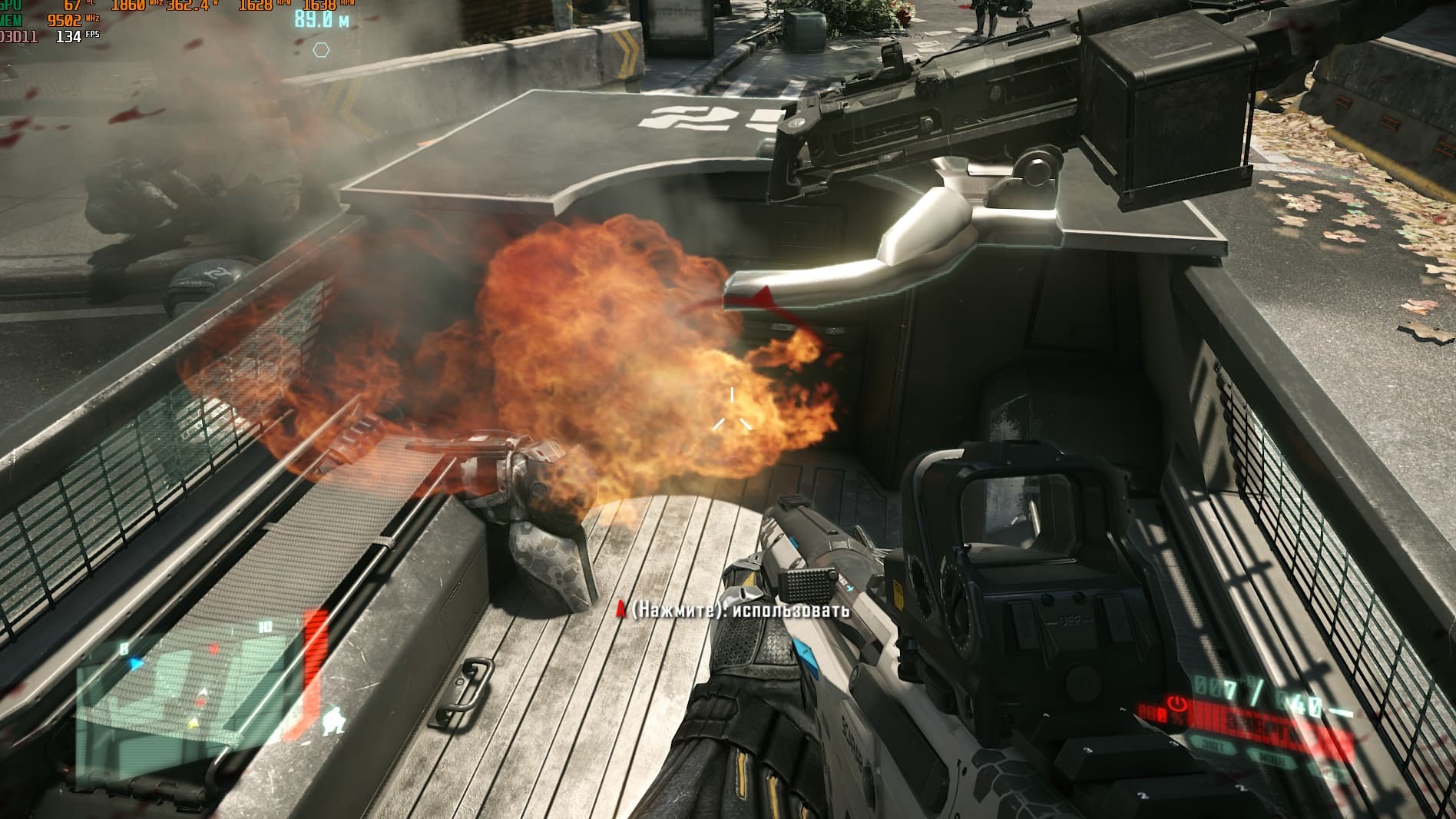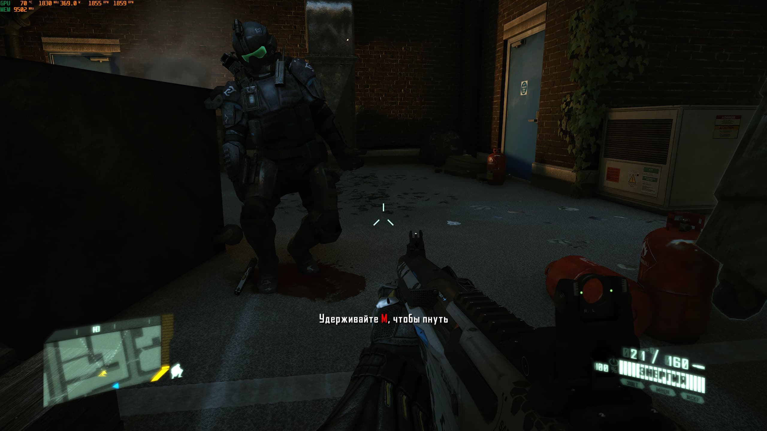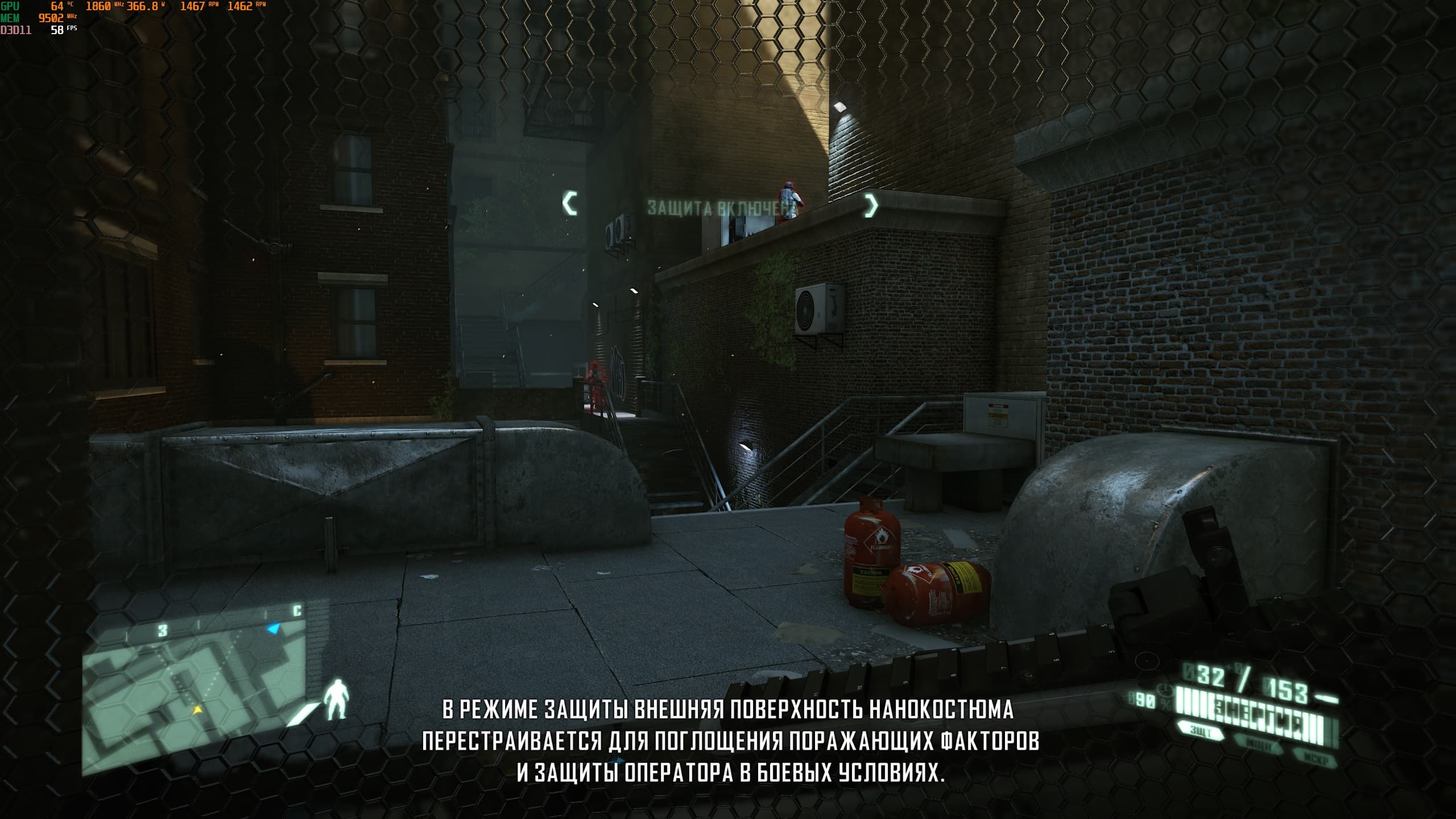 В этой части игры прыжки и приземление стали быстрее, в первой части Crysis меня просто бесило долгое зависание в воздухе после прыжка. Защитные функции костюма при этом потребляют энергию быстрее, но оно себя оправдывает, плотный огонь по нам со стороны врагов приносит лишь приятные ощущения, что мы — железный человек, и параллельно восстанавливается здоровье.