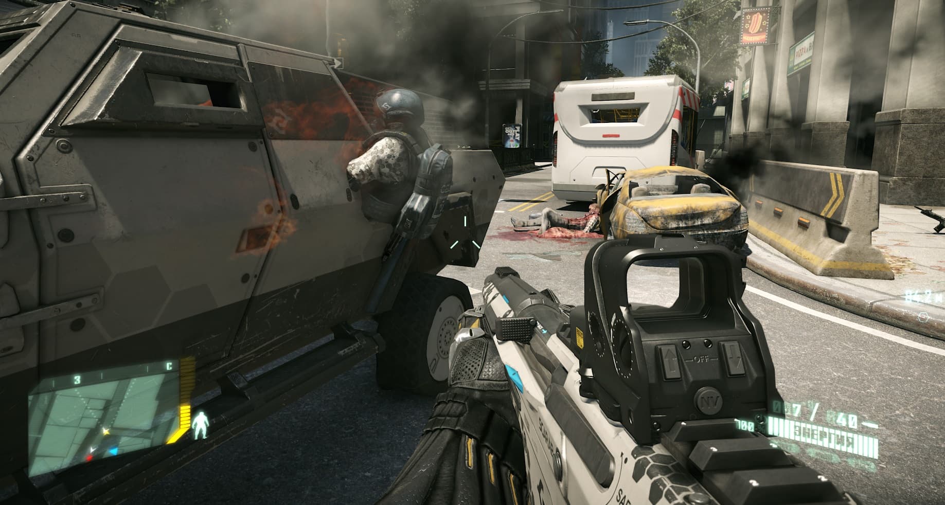 Спасибо разработчикам, что внедрили в эту часть более обширный ассортимент оружейного арсенала, а особенностью игры является супер технологичный костюм, и приоритетно полагаться нужно на него (при прохождении первой части Crysis частенько заканчивался боезапас, и был вынужден бегать почти с палкой в руке по тропическим полям и лесам). Вынужденное непрерывное включение способностей костюма к середине игры давало ощущение, что этот костюм я на острове заношу до дыр, и в дальнейшем будет тяжело продать этот Б/У комбинезончик -).