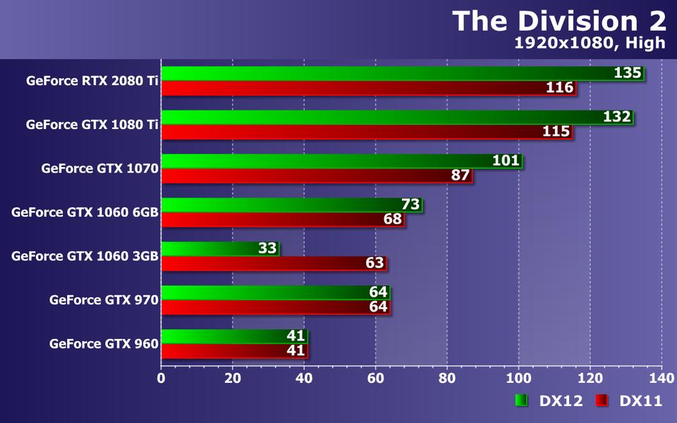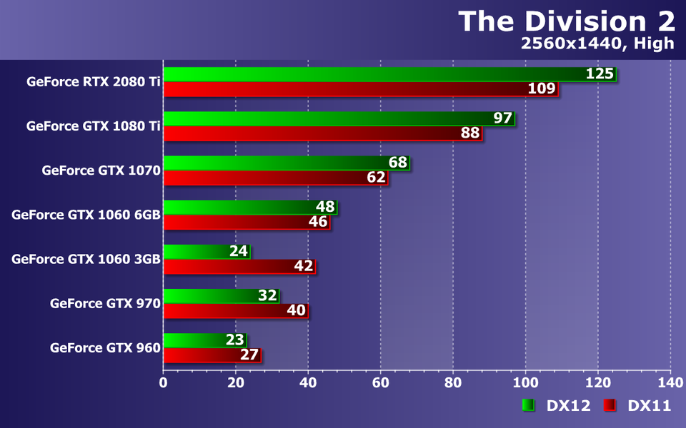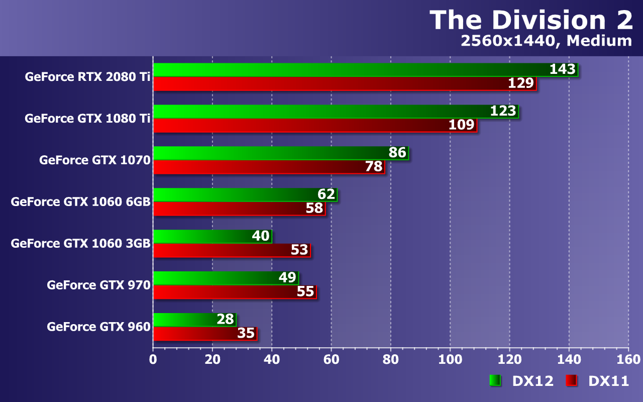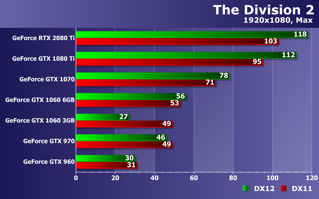 Слабейшая видеокарта в виде GeForce GTX 960 давно не участвует в борьбе, не хватает мощности GPU. Младшей из GTX 1060 не хватает 3 ГБ видеопамяти при DX12-режиме. Все три середнячка (оба GTX 1060 и GTX 970) справляются с обеспечением минимальной играбельности, хоть и с разной степенью уверенности. Они не пытаются приблизиться к 60 FPS, но минимально комфортную производительность обеспечивают. Средней частоты кадров 40—48 FPS будет достаточно для большого количества игроков.