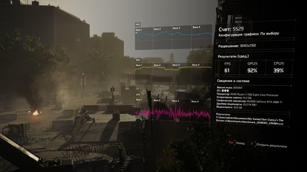 Как и в первой части, в The Division 2 есть встроенный тест производительности, который довольно точно отражает скорость рендеринга при игровом процессе. Бенчмарк в целом сделан очень неплохо, его длительность не слишком велика, но вполне достаточна, а в конце тестирования на экран выводятся подробные данные о прохождении теста — с довольно удобными графиками, разделенными на четыре зоны. К сожалению, частота кадров на экран выводится исключительно средняя, как и показатели загрузки GPU и CPU, а за подробностями игра отправляет к отчетам в CSV-формате, которые приходится отдельно обрабатывать.