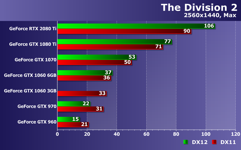 При высочайшем качестве графики в игре The Division 2, с разрешением 2560×1440 максимальный комфорт дают уже только две топовые видеокарты. Лучшие из видеокарт Zotac, используемые в наших тестах, смогли показать высокую скорость: GTX 1080 Ti упала до 77 FPS минимальных, а RTX 2080 Ti — до 106 FPS (рассматриваем DX12-режим, который явно лучше чем DX11-версия). Владельцам быстрых игровых мониторов придется довольствоваться этими показателями.