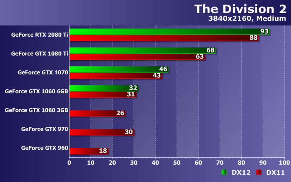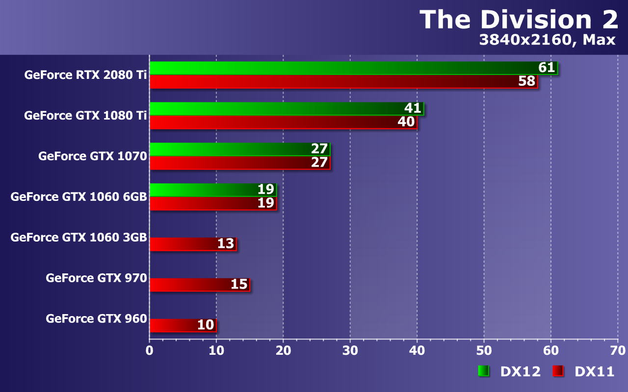 При максимальных настройках игра The Division 2 является одной из наиболее требовательных даже среди самых современных проектов. Видеокарты среднего уровня, вроде GeForce GTX 1060 не способны обеспечить постоянную частоту кадров более 60 FPS даже в Full HD-разрешении, а в 4K даже GeForce RTX 2080 Ti дает 60 FPS лишь в среднем — с падениями частоты кадров ниже этой отметки. Так что даже требовательные владельцы мощнейших GPU с соответствующими мониторами будут вынуждены снижать настройки или внутреннее разрешение рендеринга, если хотят получить как минимум 60 FPS.