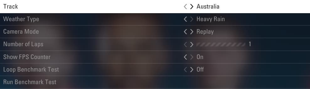 В качестве тестовой гонки мы традиционно выбрали трассу в Австралии, дождевые погодные условия и ТВ-подобные камеры. Трассы не слишком сильно отличаются по нагрузке на систему, а вот погодные условия очень серьезно влияют на производительность рендеринга — при дождевой гонке нагрузка на GPU серьезно возрастает, а частота кадров сразу падает. Ну а Replay-камеры были выбраны потому, что с ними нагрузка на систему также выше, а нам лучше подойдут экстремальные условия.
