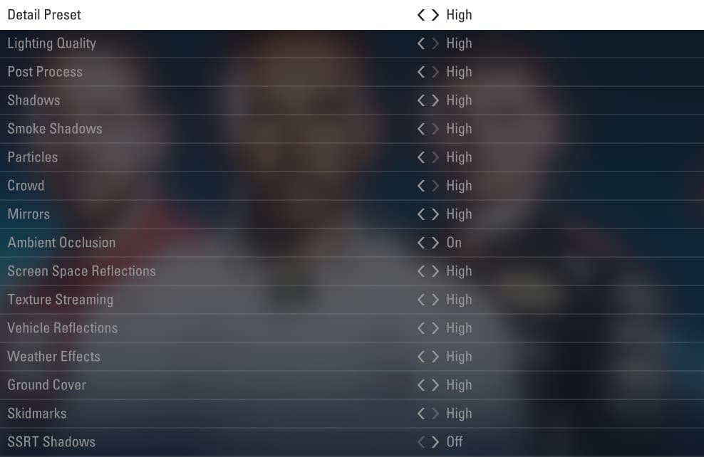 Все остальные настройки игры вызывают рост средней частоты кадров на 1%-3%, в том числе и гипотетически требовательные Screen Space Reflections и Post Process. Поэтому, чтобы получить от их изменения заметный прирост скорости, требуется изменять сразу несколько параметров. Поэтому для начала мы советуем выставить профиль High для систем с GPU среднего современного уровня, а для топовых моделей можно сразу выбрать максимальные настройки. После этого следует запустить встроенный бенчмарк и определить, насколько плавно отрисовываются кадры. Если скорости смены кадров не хватает, то первым делом изменяйте настройки Vehicle Reflections и Mirrors. Если и этого все еще не хватает, то придется снизить качество погодных эффектов и частиц.