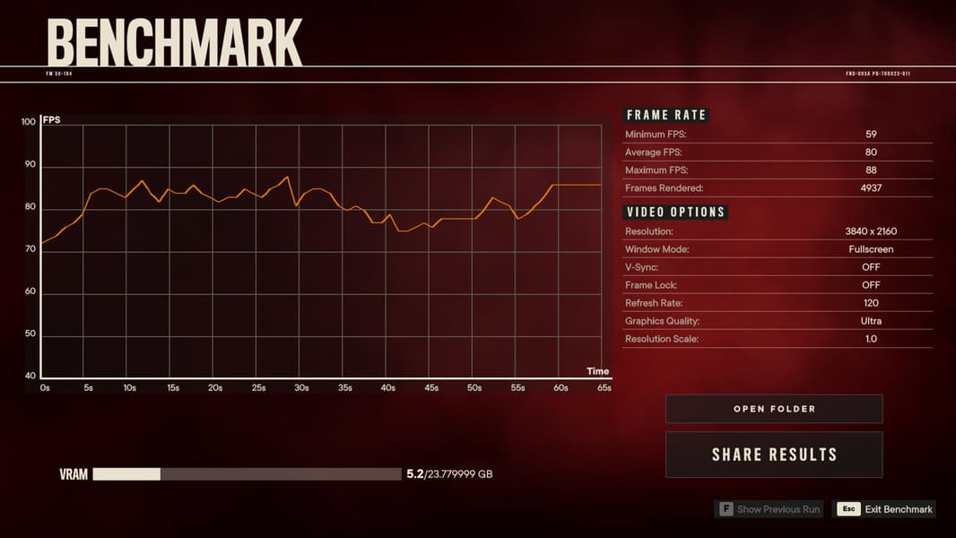 Встроенный тест производительности в Far Cry 6 длится около минуты, что является хорошим компромиссом с точки зрения длительности процесса и разнообразия 3D-сцен. Игра замеряет среднее, минимальное и максимальное значения частоты кадров, а также их общее количество, а по окончанию тестирования показывает наглядный график, а также используемые игрой настройки и объем занятой видеопамяти: