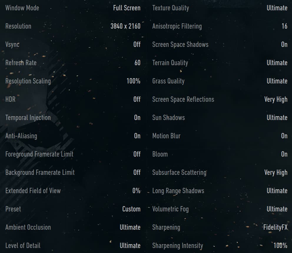Да и производительность в игре неплохая, если не отключать важную настройку Temporal Injection, использующую для рендеринга предыдущий кадр, и довольствоваться Full HD. А вот для 4K-разрешения при самых высоких графических настройках подойдет лишь GeForce RTX 2080 Ti, хотя просто высокие настройки потянут и GeForce GTX 1080 Ti и Radeon RX 5700 (XT). При разрешении 2560x1440 и максимальных настройках требования те же, что и при высоких в 4K, а вот с «народным» Full HD справляются GeForce GTX 1070 и Radeon RX 5600 XT. Производительности RX 580 и GTX 1060 на максимальных настройках будет маловато, придется снижать их до высоких или очень высоких.
