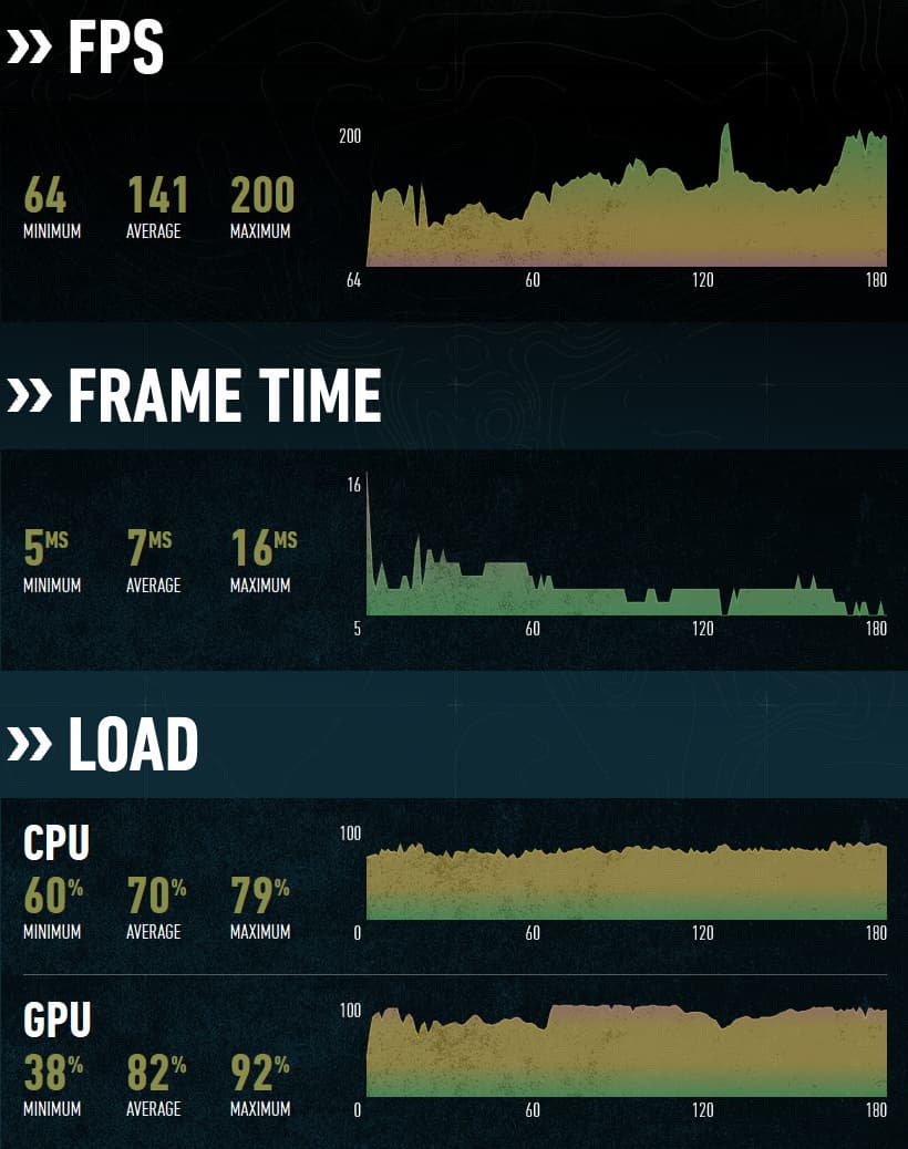 Вот это уже совсем другой уровень. Кроме уже указанных выше значений, тут есть еще и время рендеринга кадров и температура GPU. Более того, все это приведено в том числе и в виде удобных диаграмм с распределением значений по времени. Да и при самом прогоне теста показывается довольно много информации о том, как работает система: