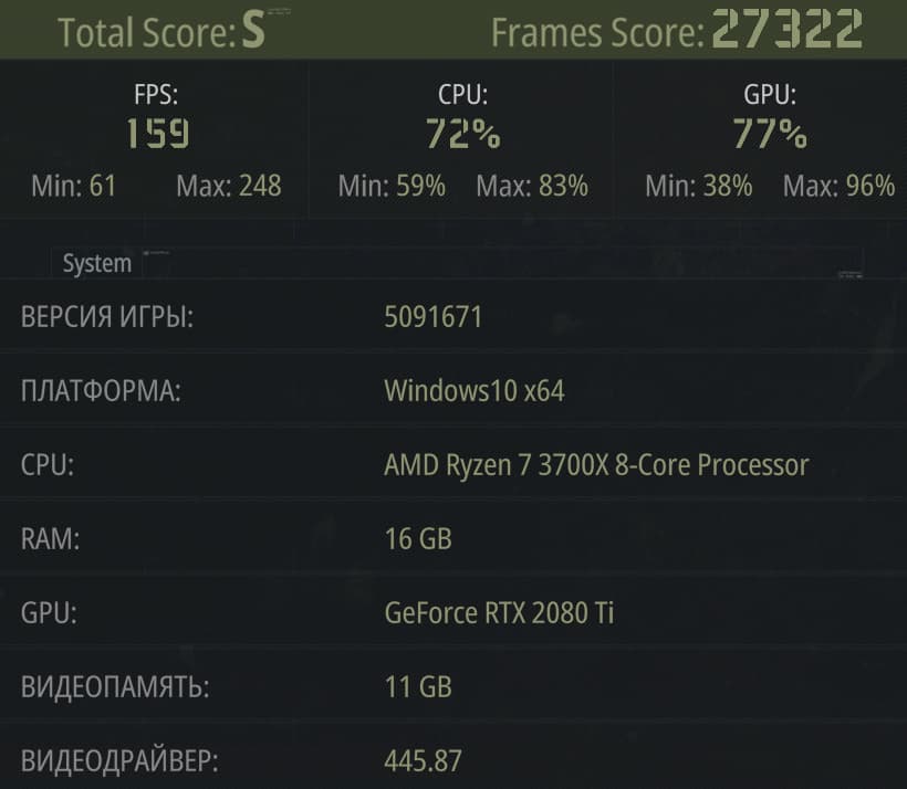 После прогона теста выводится достаточно подробная информация в виде частоты кадров (минимальной, средней и максимальной), то же самое по загрузке CPU и GPU, что довольно удобно для определения упора в их возможности. Также тут есть и краткие данные о системе. Но есть и куда более подробный отчет с большим количеством дополнительных показателей: