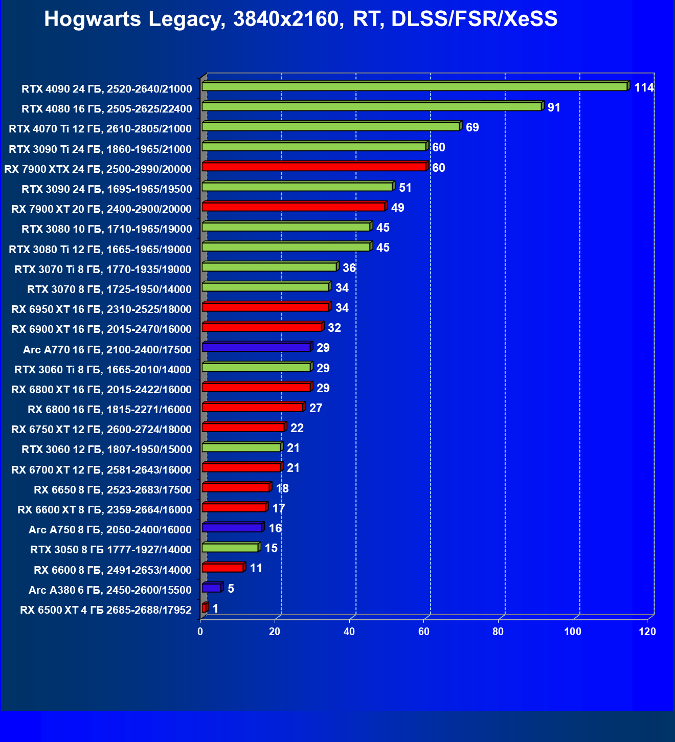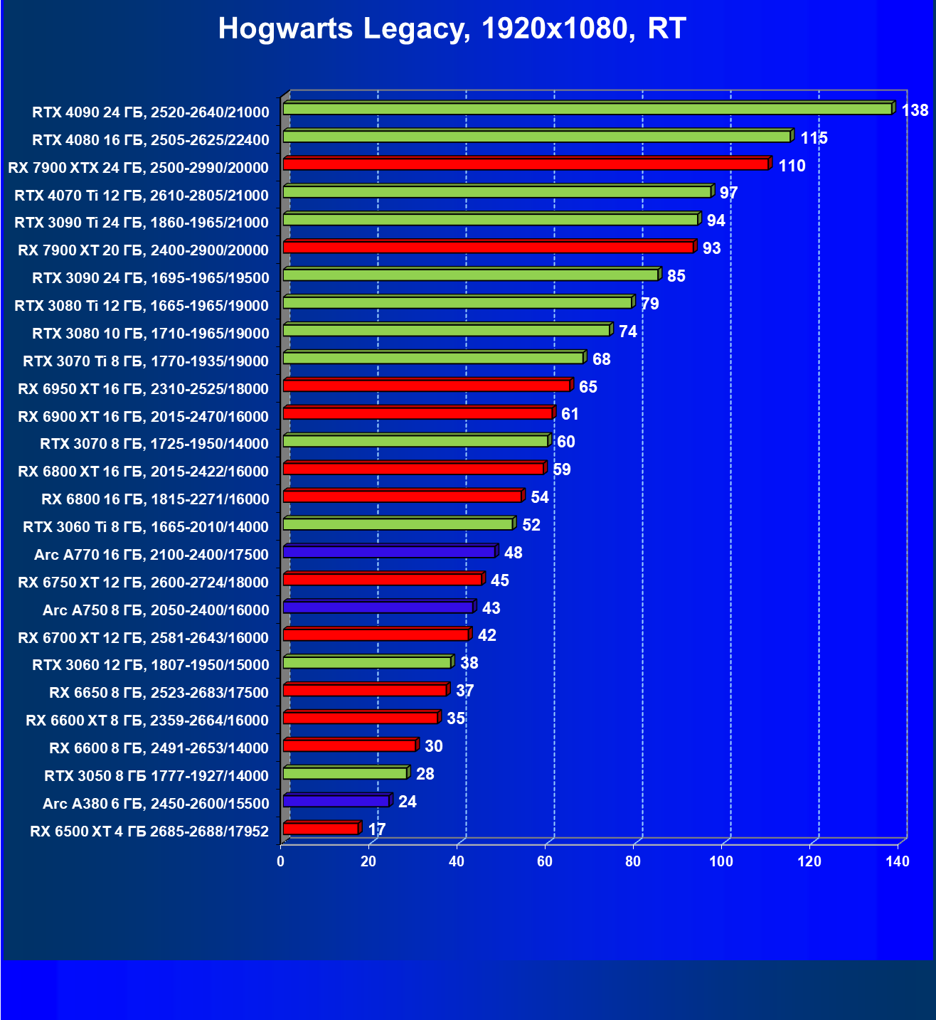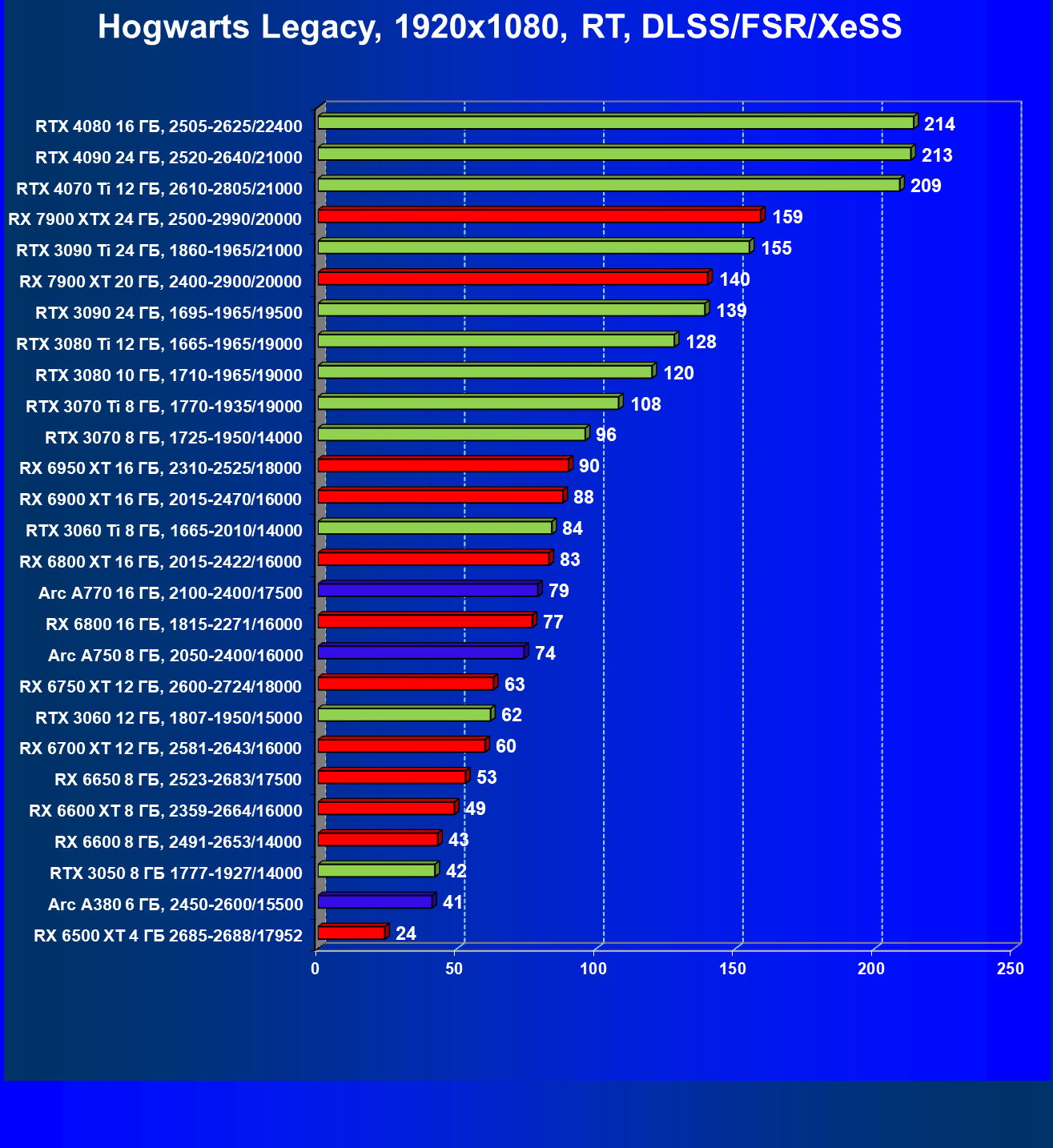В разрешении Full HD при включении трассировки лучей и DLSS, FSR или XeSS нужно вооружиться GeForce RTX 3060, Radeon RX 6700 XT и Intel Arc 750. В разрешении 2.5K достаточную производительность обеспечат GeForce RTX 3070, Radeon RX 6800 и даже Intel Arc 770. В разрешении 4K для комфорта потребуется GeForce RTX 3090 Ti и выше, а также Radeon RX 7900 XT и выше.