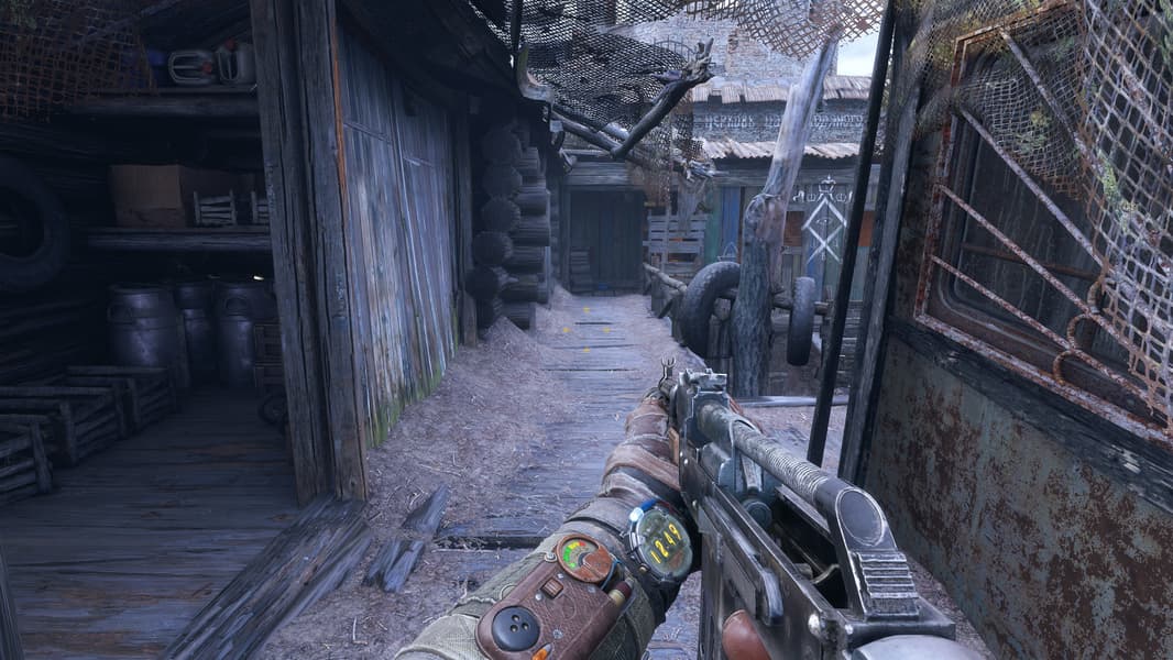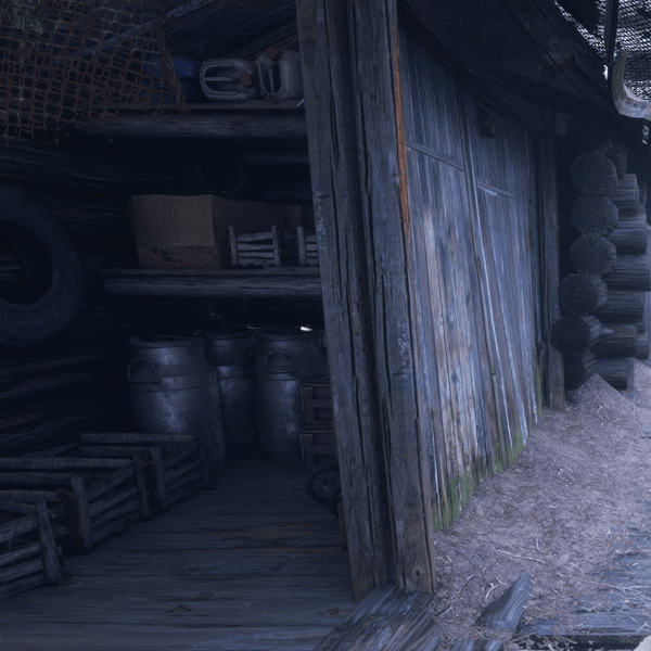 И на этом примере с сочетанием открытого и закрытого пространств можно увидеть явное улучшение картинки. Посмотрите на ящики и бидоны на полу в сарае и бревна сруба правее, стену и крышу по центру, да и вообще практически везде, в отличие от плоских поверхностей без расчета GI, получается объем — полутени именно там, где они и должны быть в реальности. Даже оружие и рука выглядят объемнее и реалистичнее именно с расчетом глобального освещения при помощи трассировки лучей.