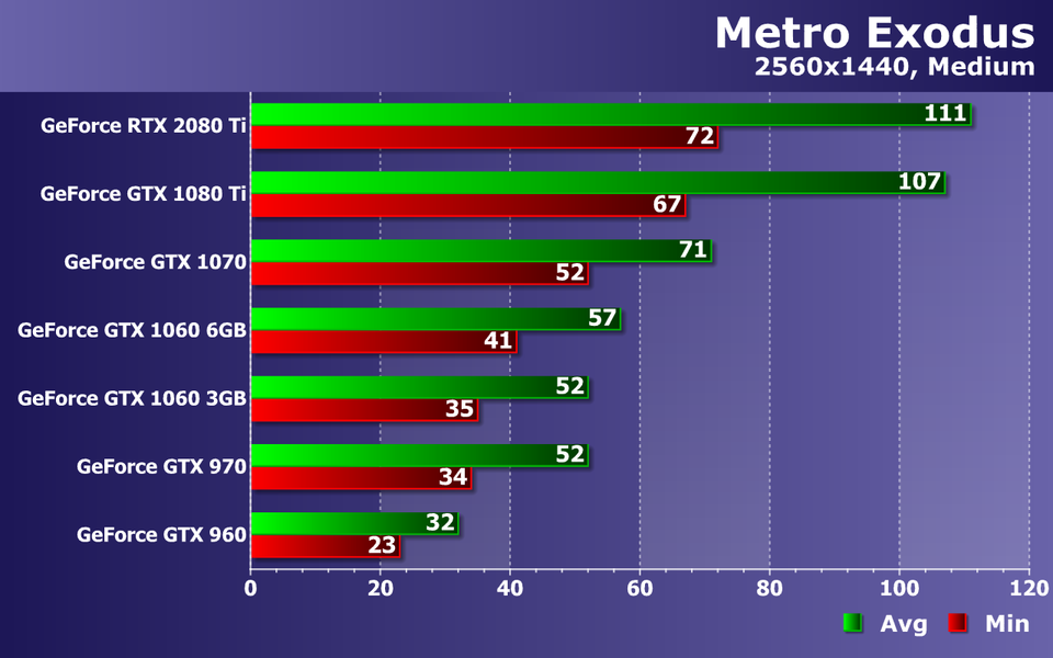 При высочайшем качестве графики в игре Metro Exodus, с разрешением 2560×1440 справляются уже только две топовые видеокарты! Но и лучшие видеокарты Zotac из используемых в наших тестах тоже уже не смогли показать идеальный комфорт: GTX 1080 Ti упала до 47 FPS минимальных, а RTX 2080 Ti — до 56 FPS. Последнюю еще с небольшой скидкой можно признать как дающей максимальную плавность при 60 Гц, но даже владельцам быстрых игровых мониторов придется довольствоваться жалкими 50—80 FPS.