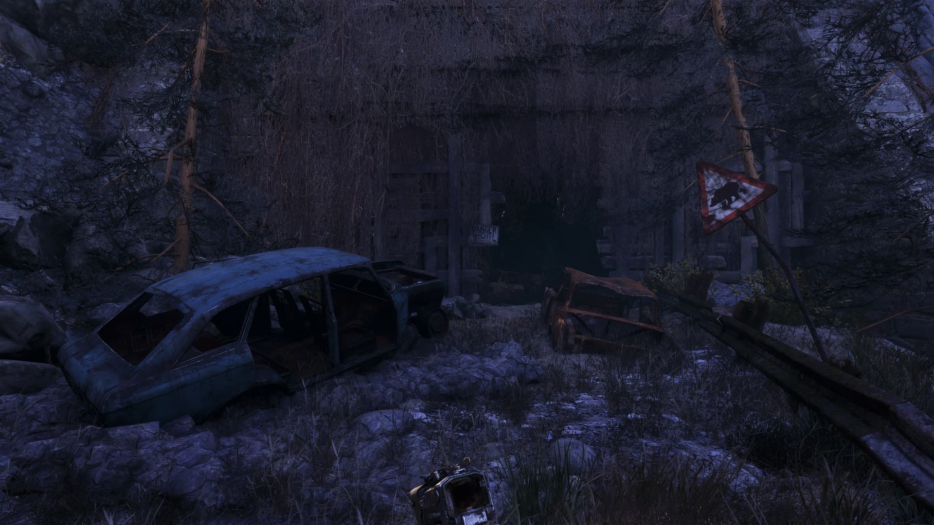 Посмотрите, насколько серьезно меняется картинка при включении трассировки — вместо плоского массива пикселей выходит вполне реалистичный объем. Внутри кузова ИЖ «Комби» и под ним — темные тени, как и в тоннеле впереди, а камни и деревья подсвечены небом.