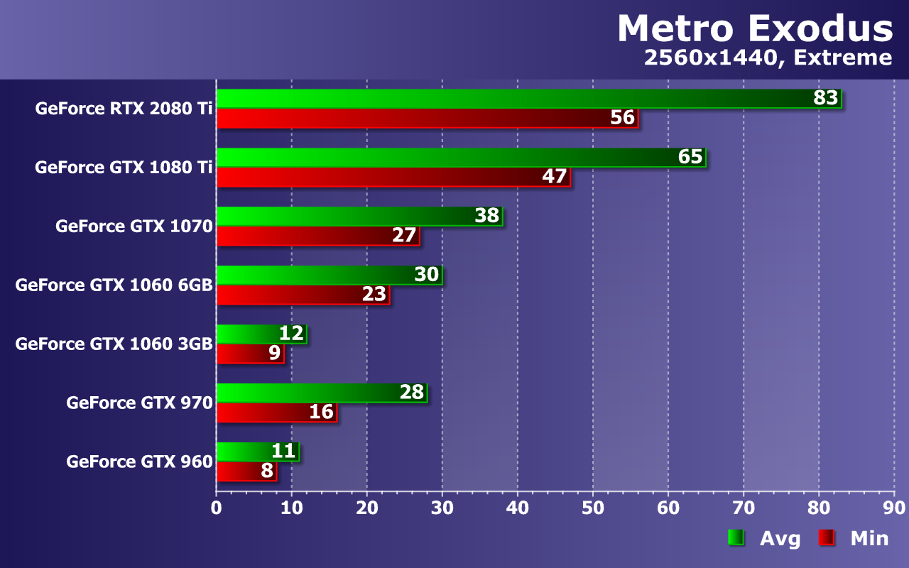 В остальном, если не трогать сверхтребовательную трассировку лучей, игре Metro Exodus в Full HD-разрешении при высоких настройках хватит и видеокарт уровня GeForce GTX 1060, но обязательно с 6 ГБ видеопамяти! Вариант с 3 ГБ способен показать приличную частоту кадров только при средних настройках, как показали тесты. Так что объем 4 ГБ видеопамяти мы считаем минимально допустимым, а лучше иметь 6—8 ГБ. А вот большего игра точно не требует даже при максимальных настройках с RTX в 4K-разрешении. Для разрешения 2560×1440 и средних настроек все так же хватит GTX 1060, а вот для высоких настроек желательна уже видеокарта от GTX 1070 и выше. Экстремальные же настройки покорятся только топовым GPU, как и 4K-разрешение — даже при просто высоких настройках. При максимальном уровне качества в 4K на GTX 1080 Ti игра будет еле шевелиться, так что любителям максимума во всем придется раскошеливаться на RTX 2080 Ti без вариантов.