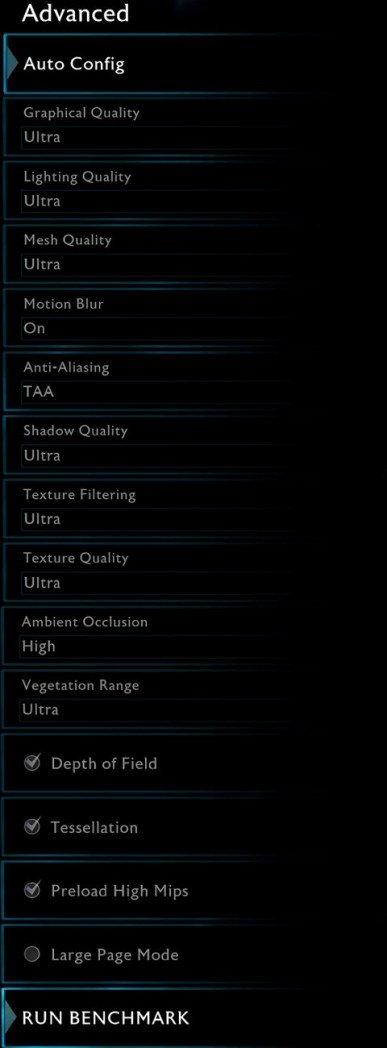 К счастью для нас, в игре есть встроенный тест производительности, помогающий подобрать идеальные настройки для обычных пользователей и серьезно облегчающий жизнь тестеров. Для того, чтобы протестировать производительность рендеринга в игре, нужно открыть меню настроек Display, выставить полноэкранный режим, отключить вертикальную синхронизацию и динамическое разрешение, а максимальную частоту кадров (Max FPS) выставить в неограниченную. Далее в продвинутых настройках Advanced Options выставить необходимые параметры качества рендеринга и запустить тест при помощи выбора опции Run Benchmark в самом низу.