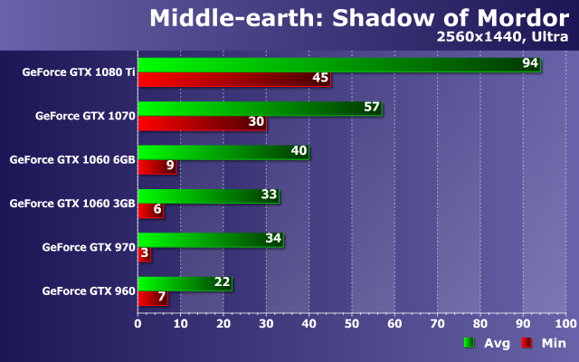 Более слабые видеокарты в режиме максимальных настроек в разрешении WQHD с работой не справляются. Даже модель среднего уровня GeForce GTX 1060 с 6 ГБ памяти обеспечила минимальную частоту кадров лишь в 9 FPS, что заметно ниже планки комфорта, хотя средняя частота была ровно 40 FPS. GeForce GTX 970 и GTX 1060 3GB еще чуть медленнее, а GTX 960 еще ниже. При установке ультра-настроек игра Middle-earth: Shadow of War более всего требовательна к объему видеопамяти, поэтому есть смысл поставить все настройки на ультра, кроме разрешения текстур.