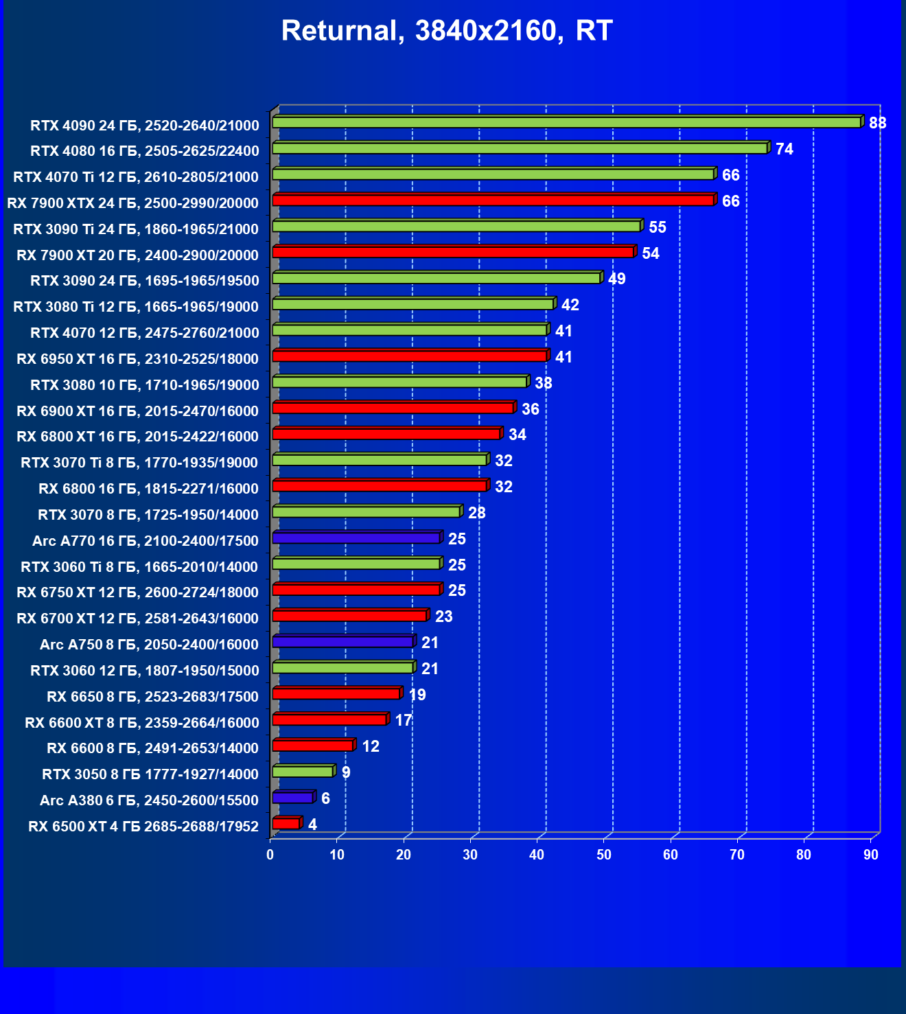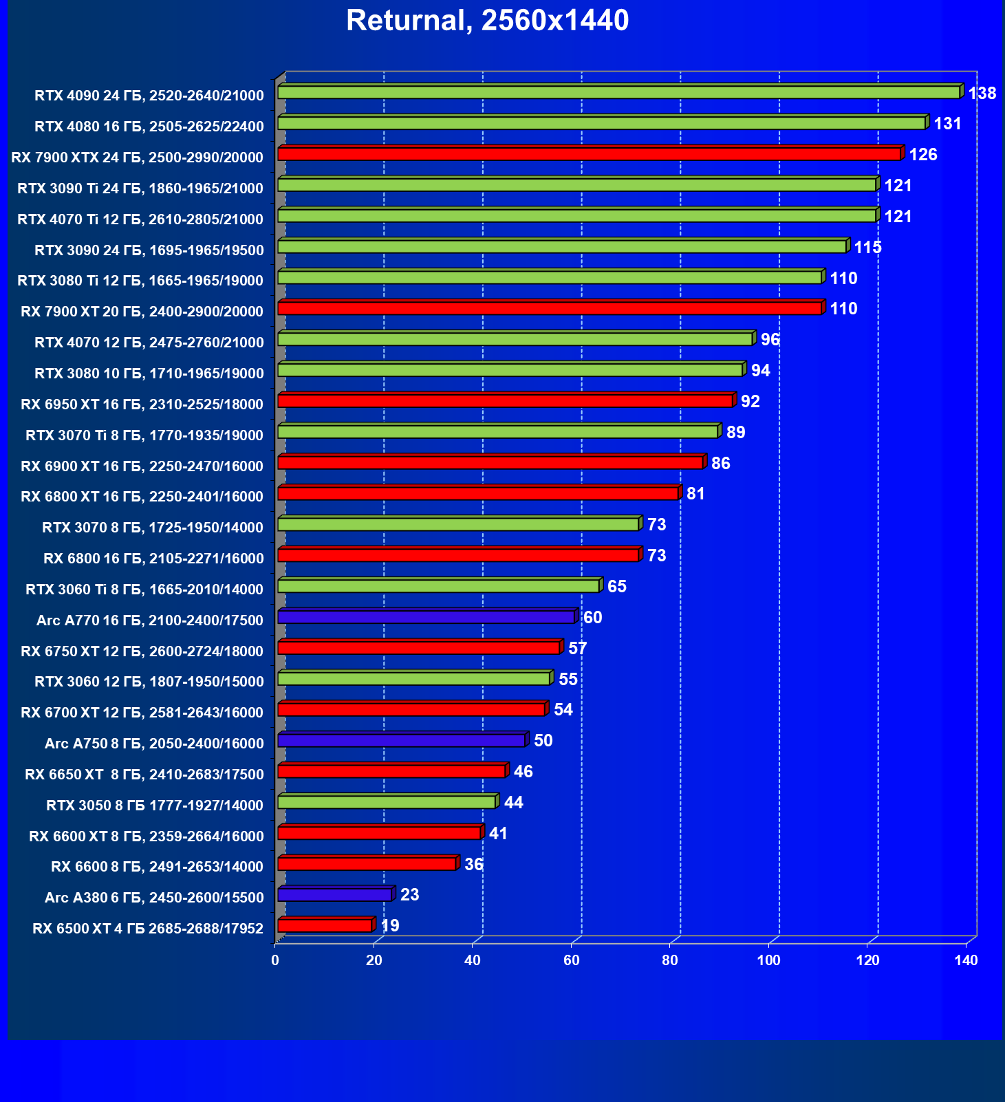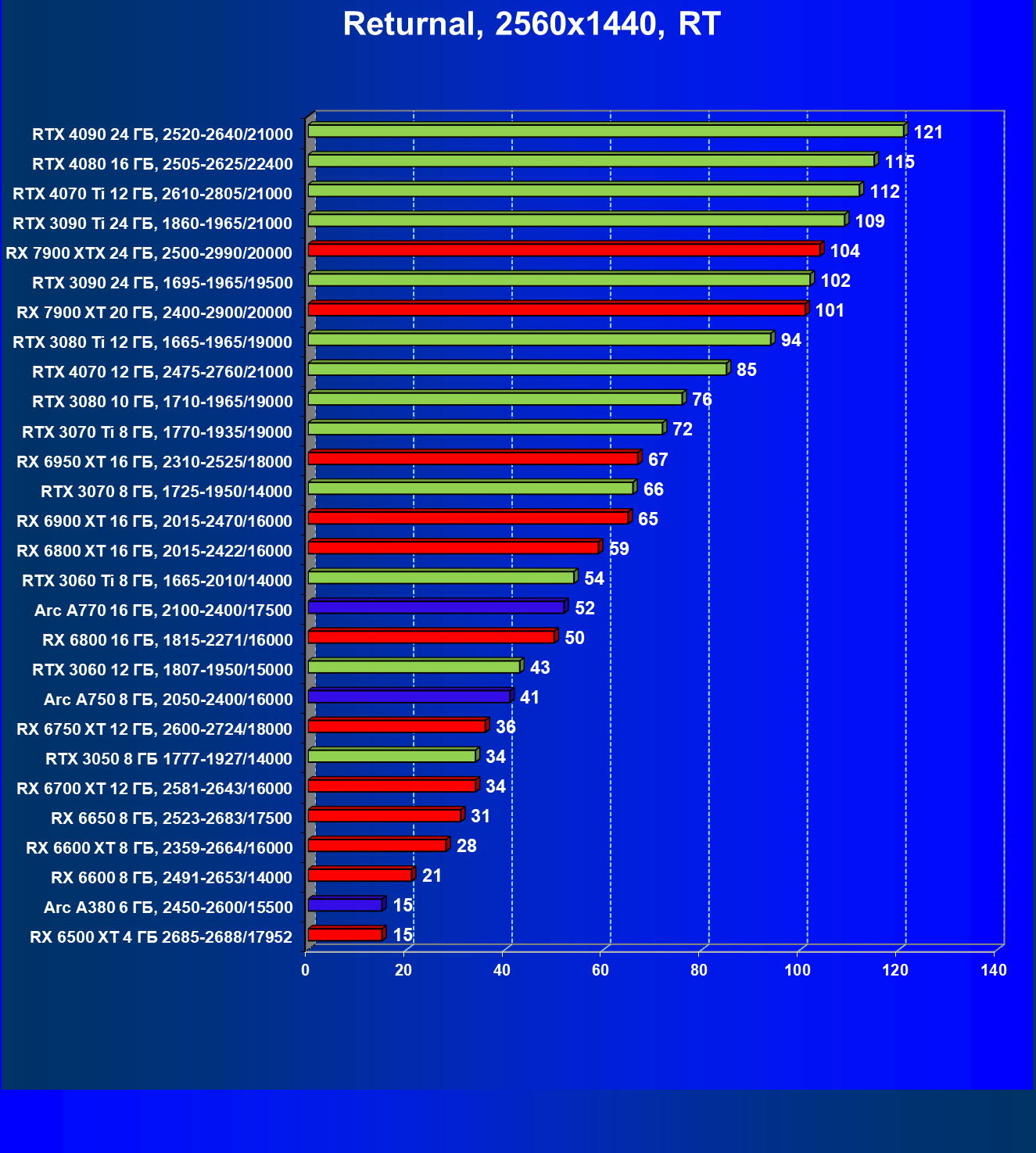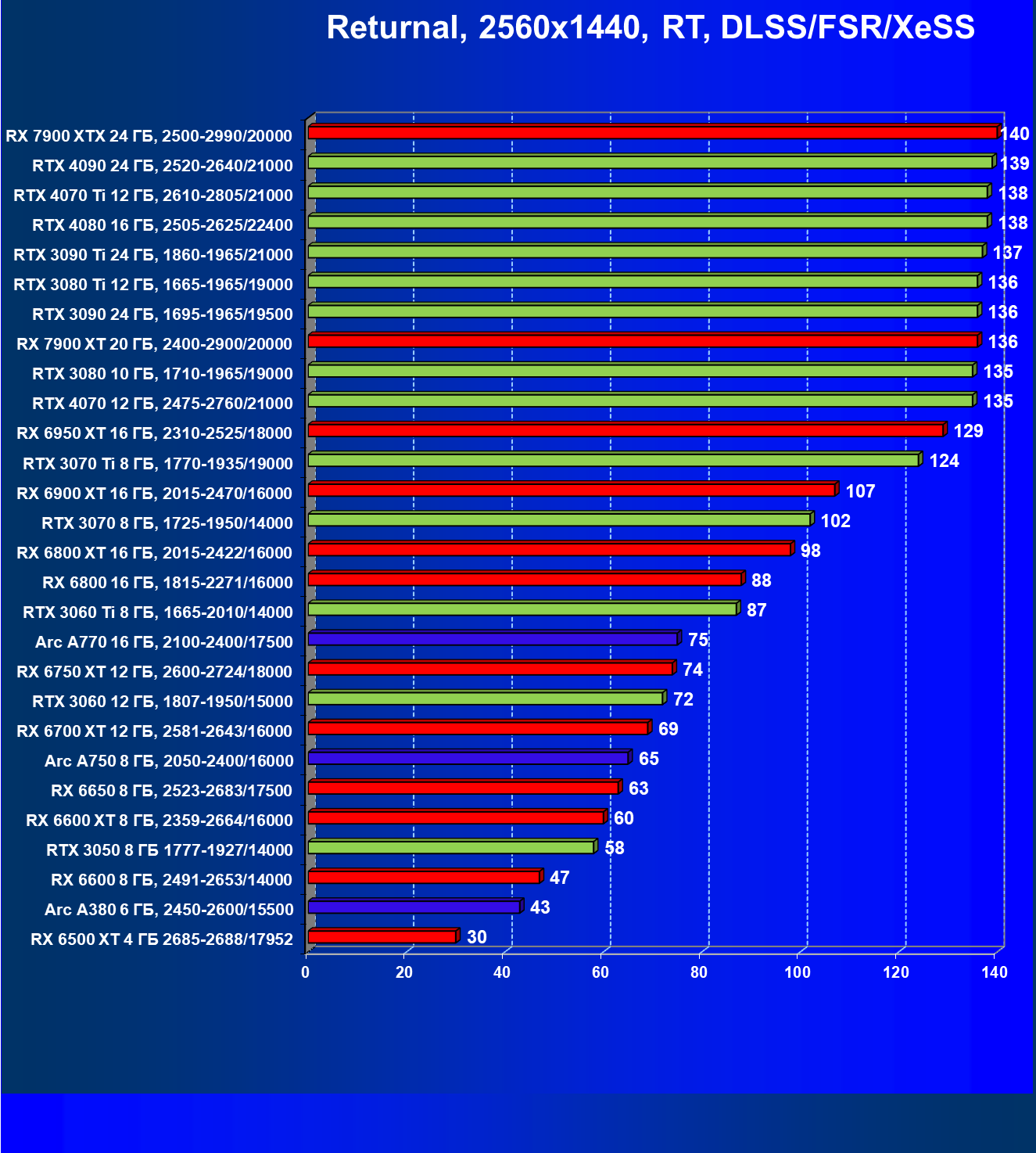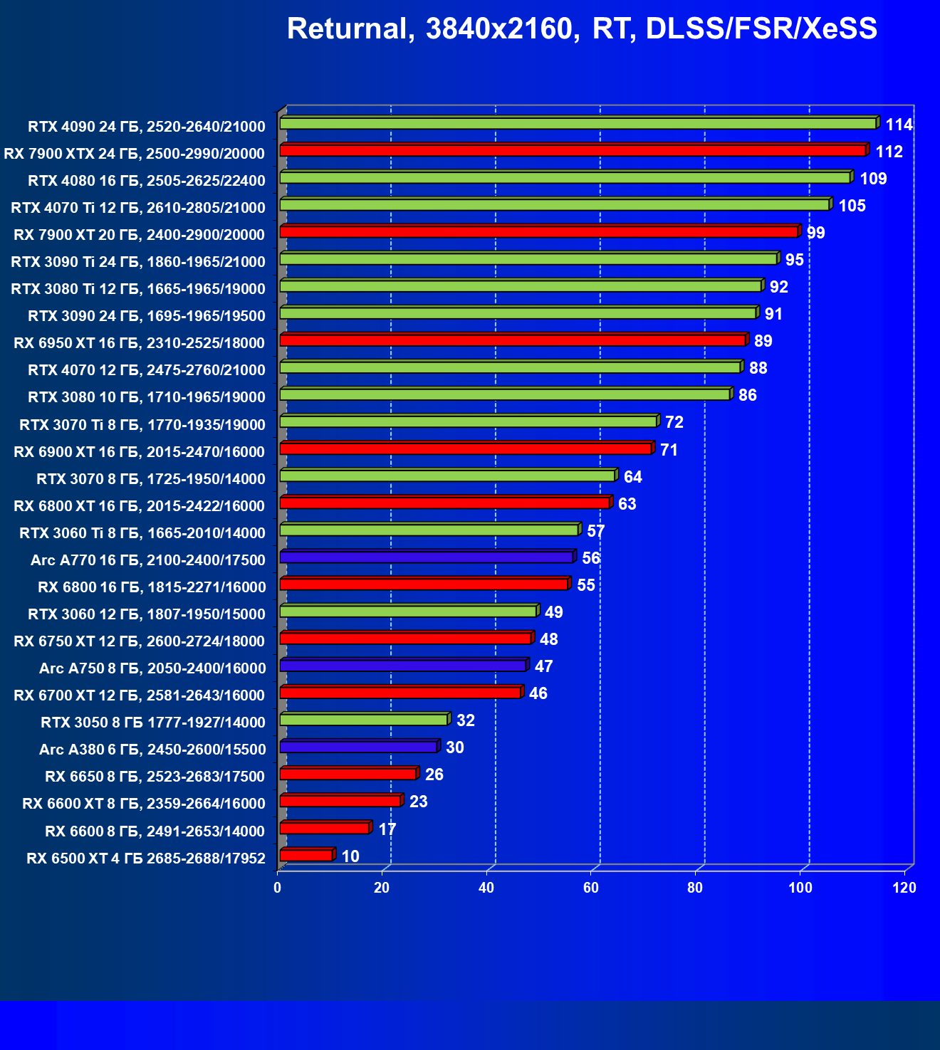 Безусловно, эта, как и любая другая игра после своего выпуска обновляется, чтобы устранить «ляпы» и сделать игру еще красивее, добавив в нее современные технологии, что приводит к падению производительности на ультра игровых настройках графики на картах прошлых поколений. Данный обзор нацелен показать вам возможности трассировки лучей в этой игр: что приносит ее включение, и каким образом можно ощутимо повысить FPS на относительно бюджетных картах от производителей графических процессоров AMD, Nvidia или Intel. В игре Returnal для компенсации падения FPS от включения RT внедрены технологии масштабирования DLSS/FSR/XeSS, что позволяет повысить разрешение или поднять настройки графики владельцам бюджетных карт. Данный обзор так же демонстрирует производительность на современных из разного ценового сегмента картах.
