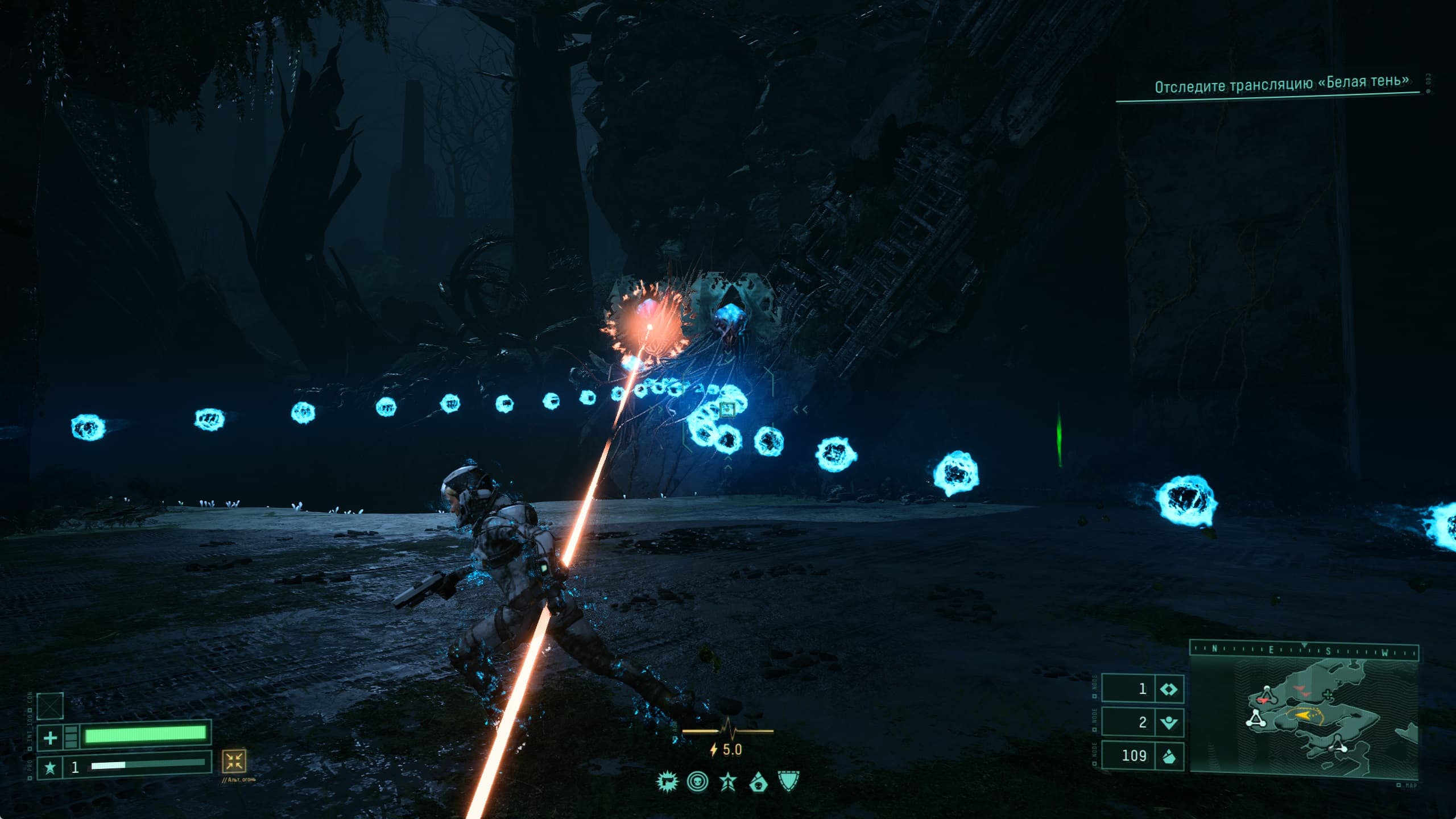 Мир игры Returnal красив и при прохождении ощущается как что то новое и необычное. Все дополняется просыпающимся в процессе прохождения любопытством: а что же за той или иной дверью, а что на том участке, что пока скрыт на карте. При «непрокаченном» костюме и недостаточном уровне здоровья нашей героини мы несколько раз задумаемся, а стоит ли открывать неизвестную нам дверь.
