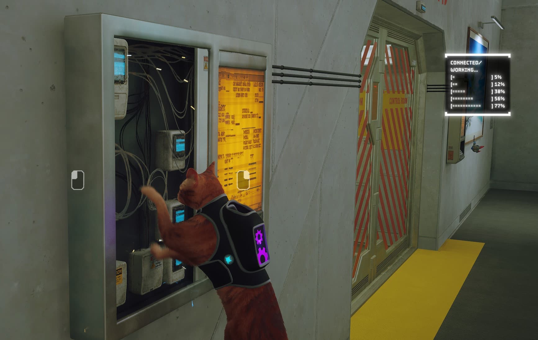 После неудачного паркура мы падаем в пропасть, а именно в подземный город. На нашем пути мы поможем маленькому дрону B-12 загрузить искусственный интеллект, дрон B-12 обещает помочь коту вернуться на поверхность и помогает при общении с роботами, переводить надписи и взламывать двери. Мы не единственные персонажи в игре, которые нацелены подняться на поверхность, поэтому знакомимся с роботом Момо и с несколькими другими Аутсайдерами — участниками группы посвятивших себя поиску пути на поверхность.