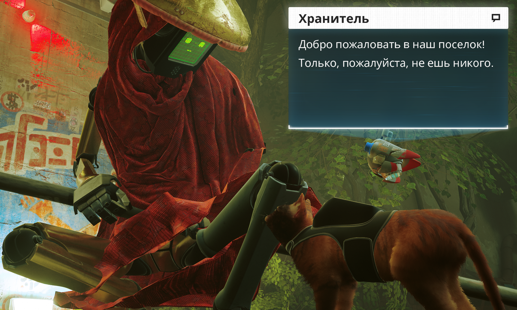 Возле роботов мяуканье приносит в большинстве своем улыбку, их забавные эмоциональные моськи по своему восхищают, при том что не все они нам улыбаются и проявляют интерес, кому-то наше присутствие не по душе, хотя у них же не должно быть души, но некоторые роботы ведут себя очень по-человечески, с логическим мышлением и отношением к происходящим вещам в подземном городе. Поначалу нас боялись все роботы и Хранитель у ворот поселка, но все же нас пропускают с просьбой «не есть никого». Если бы они знали, что нам они даже не только не по зубам, но и вообще не в нашем вкусе.
